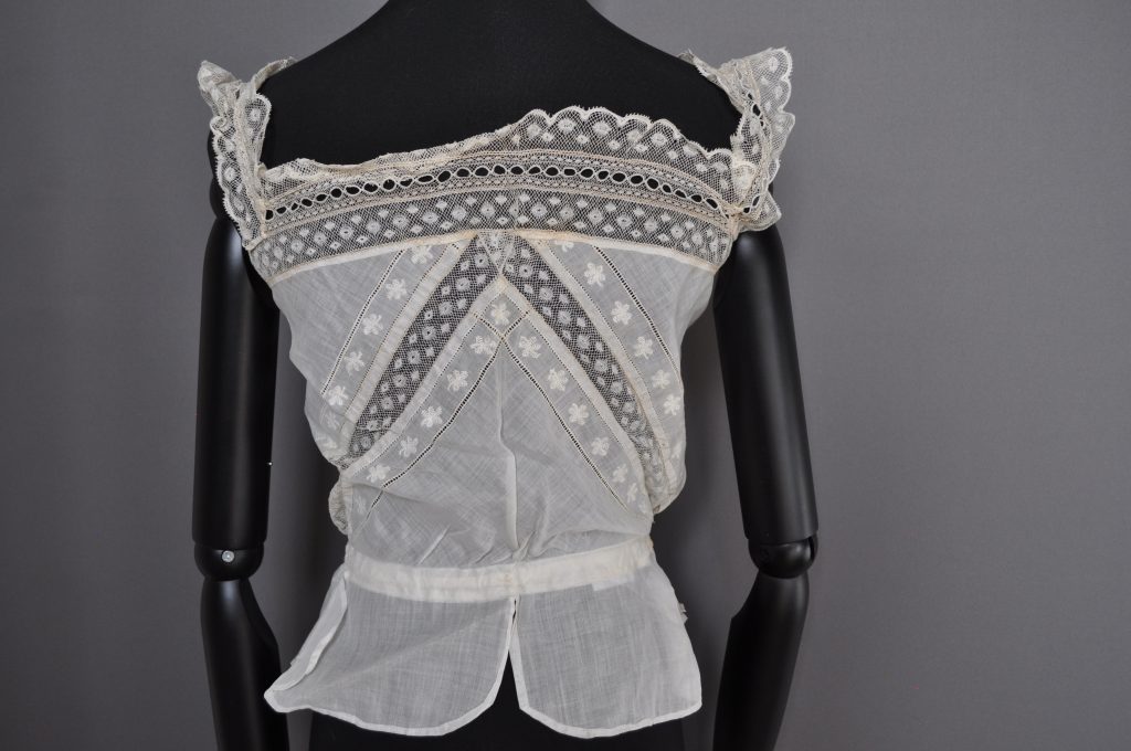 corset cover with inserted lace bodice, lace straps, and waist tie