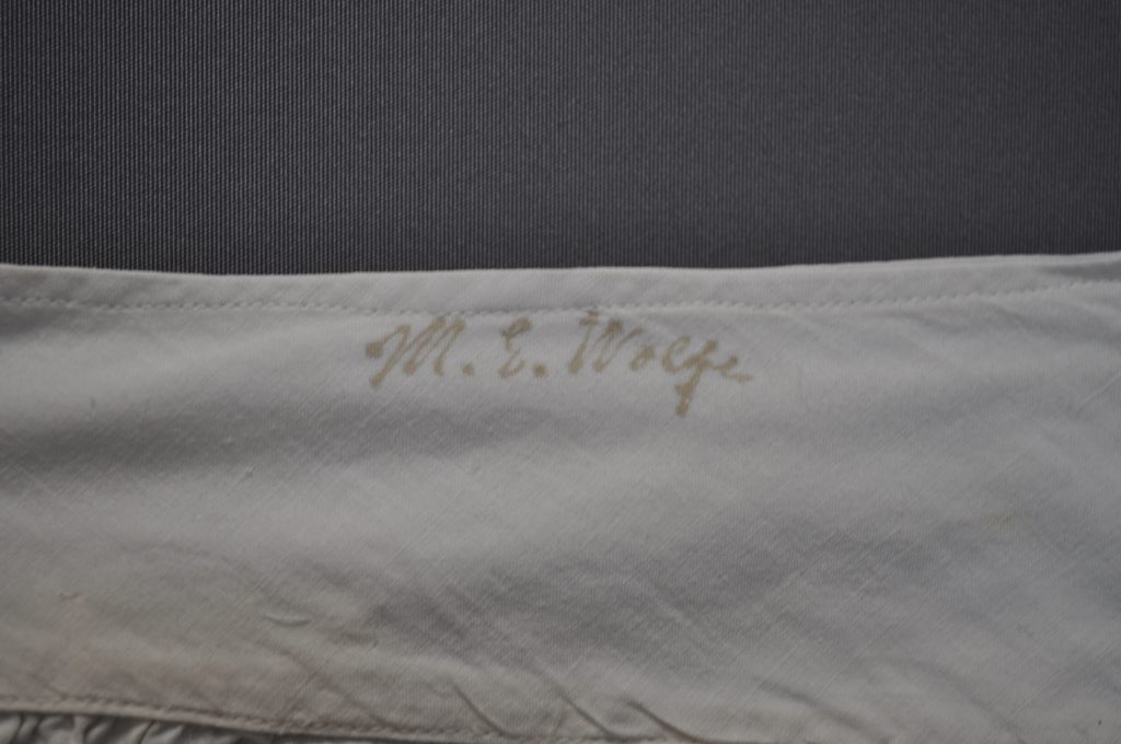 mid- length split bloomers with tucks and lace at the bottom. Button closure. the inked name “M.E. Wolfe”
