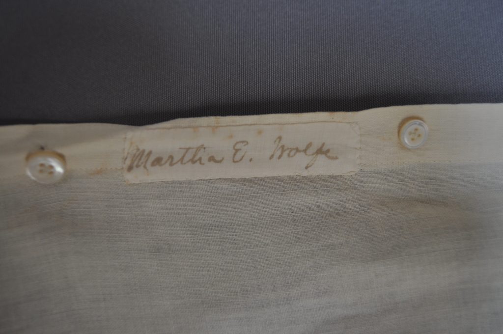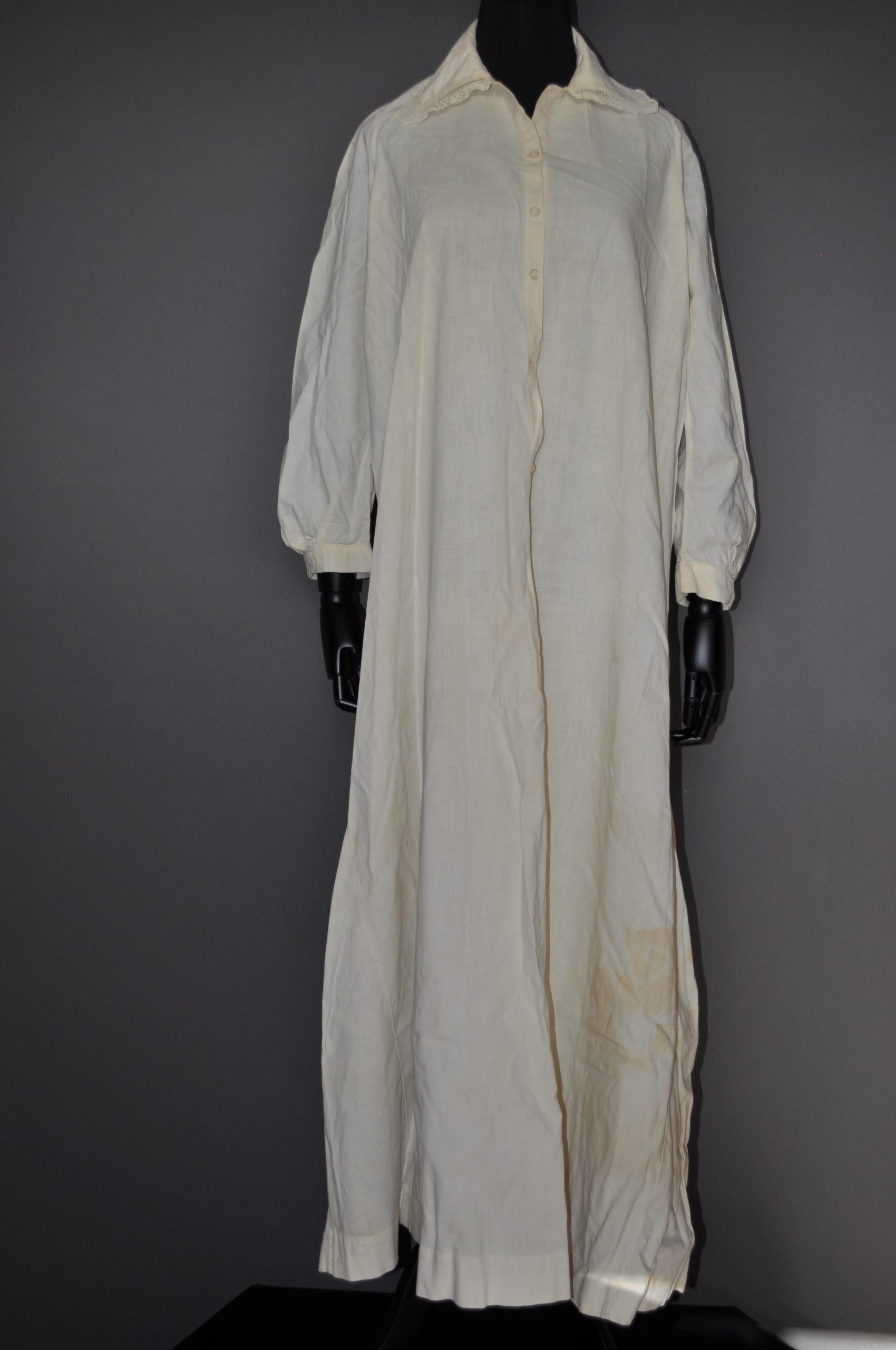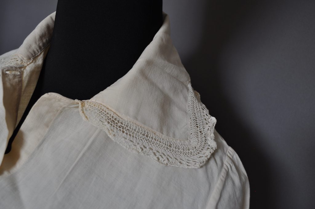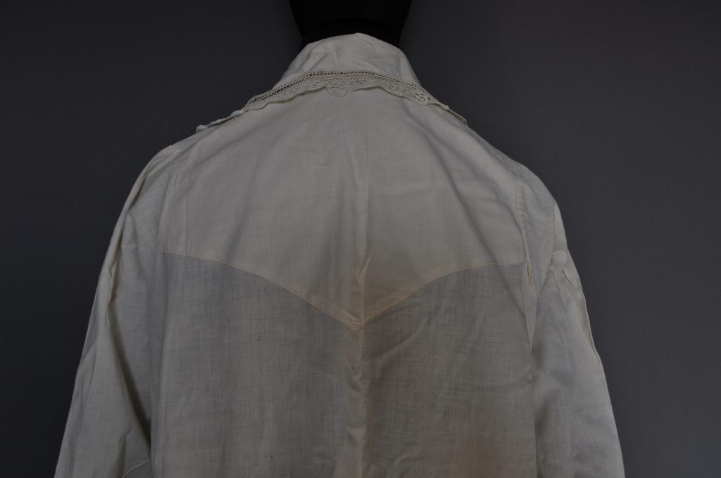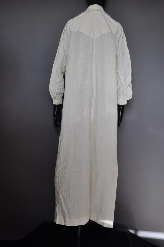 nightgown with an embrodered yoke collar, shaped sleeves with elbow tucks and lace cuffs.