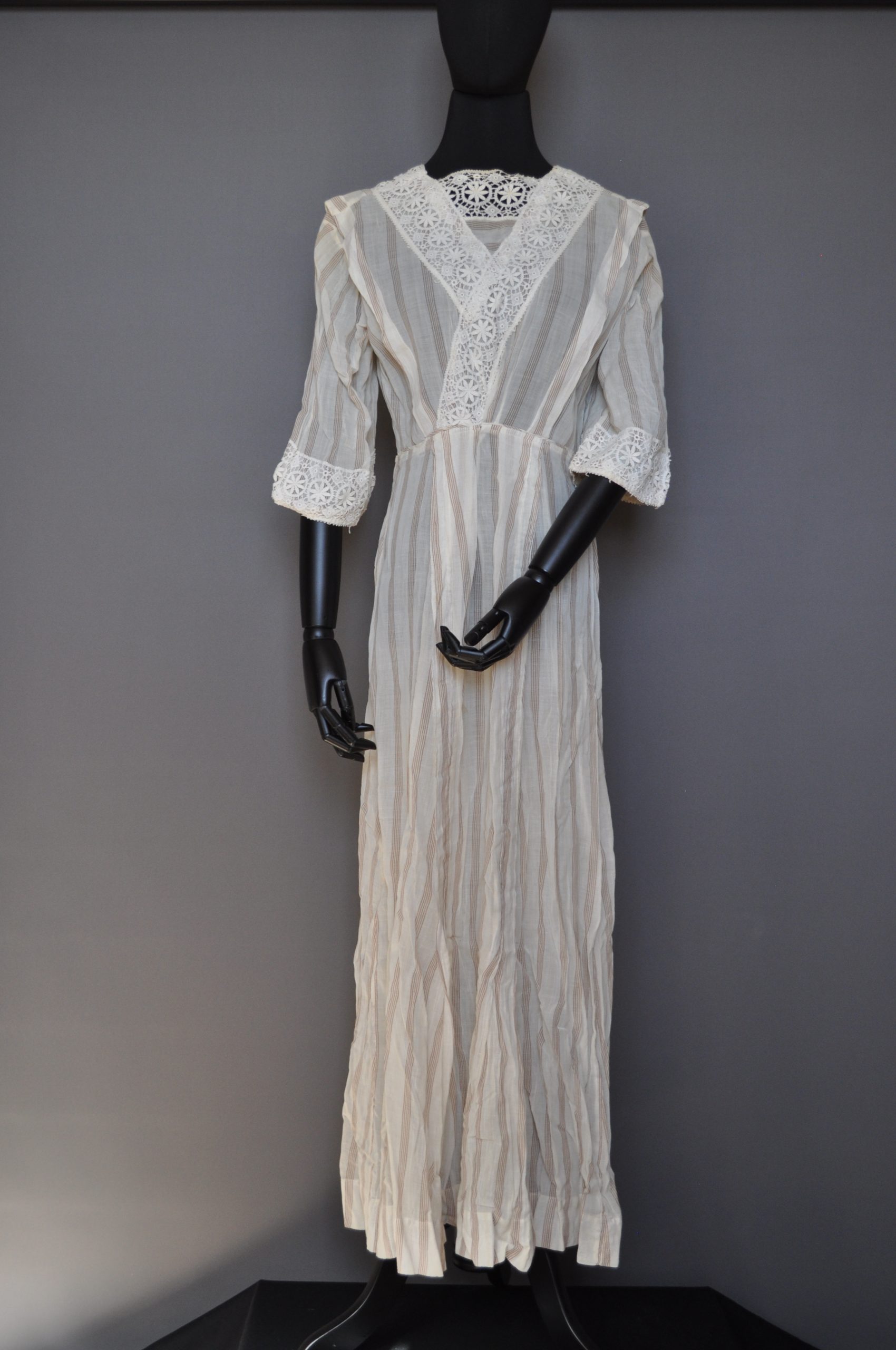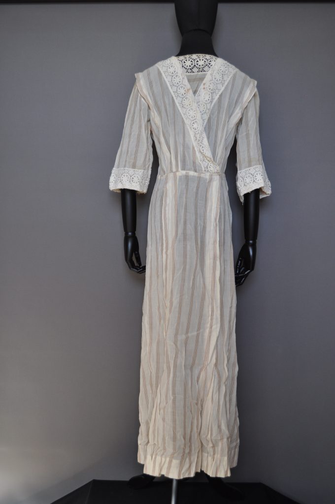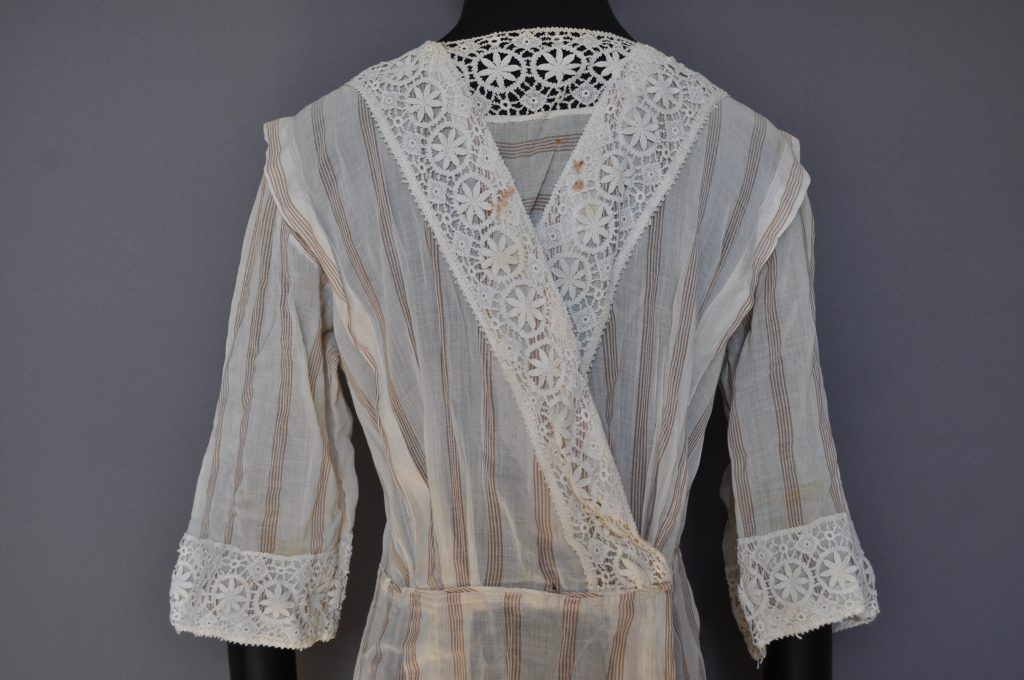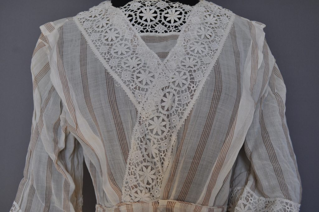 Edwardian dress with brown stripes, elbow length sleeves and lace around collar and sleeves