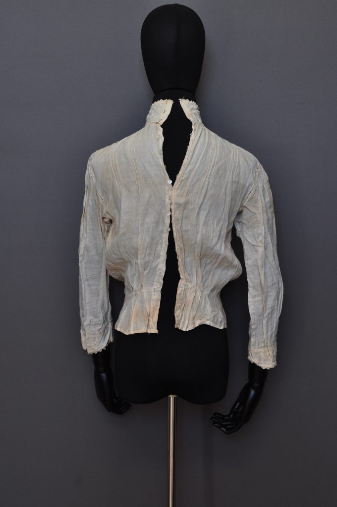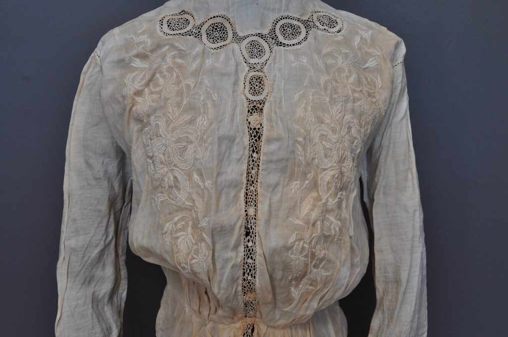 blouse with back buttons, lace insert across the chest and down the front, and flowered embroidery down the front. armseyes and cuffs trimmed with lace and embroidery