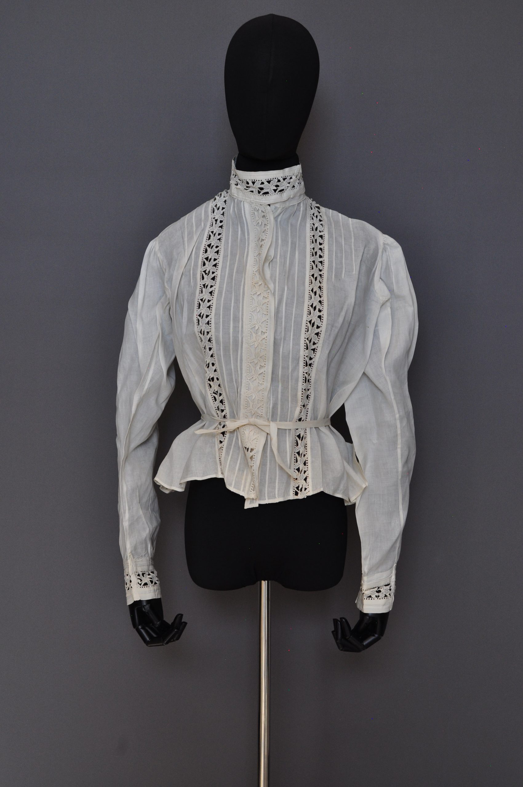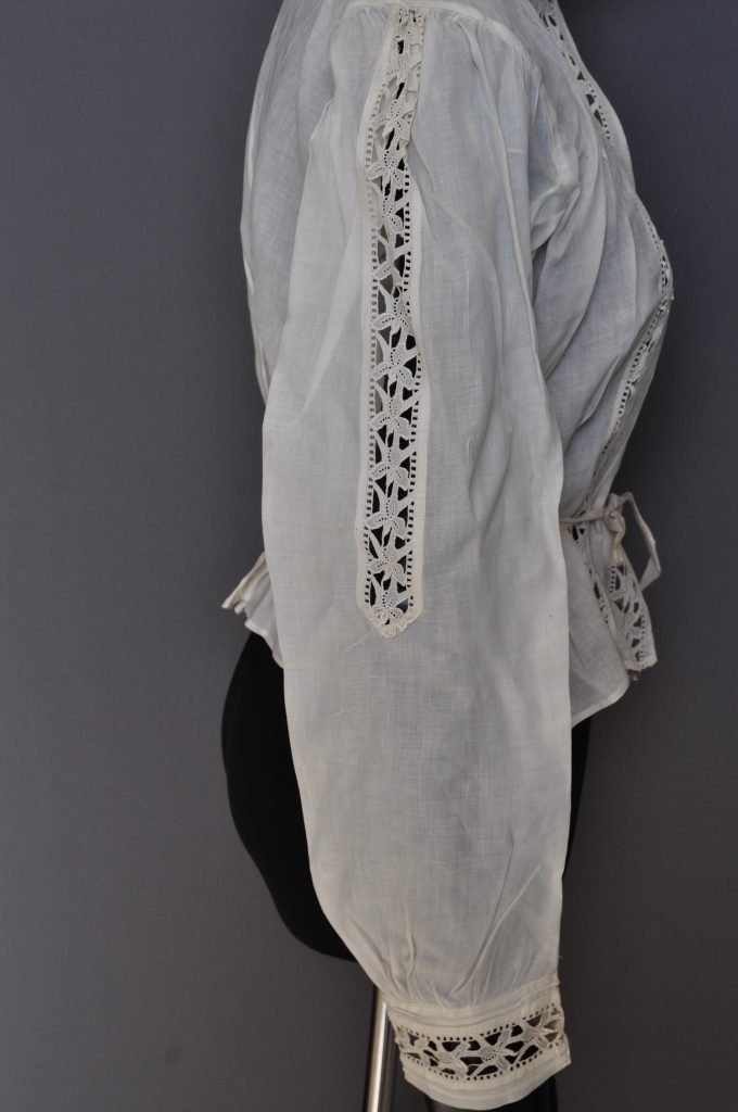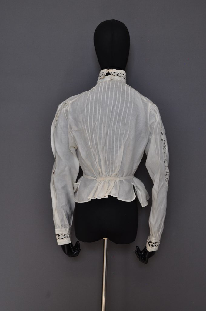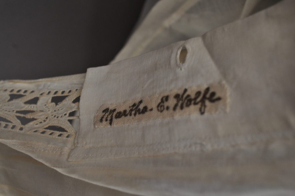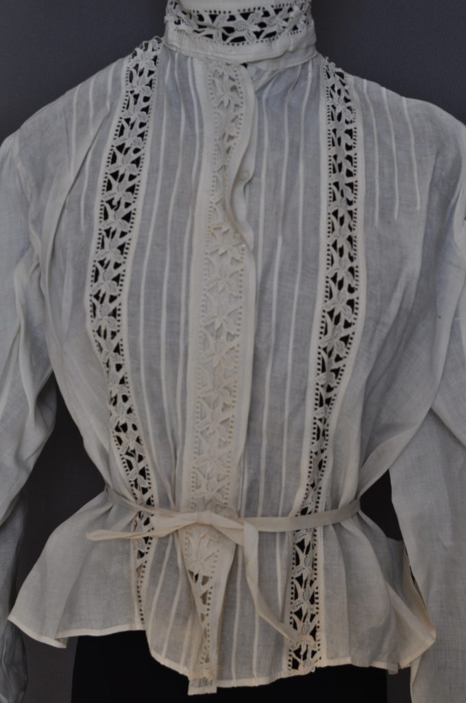CF button down blouse with tucks at CF, shoulders and CB. Lace inserts at front, cuffs, sleeves and collar. Ink inside “Martha E. Wolfe”