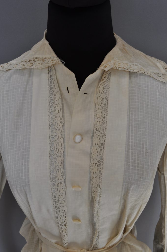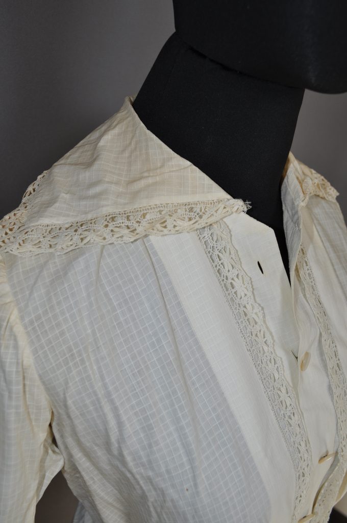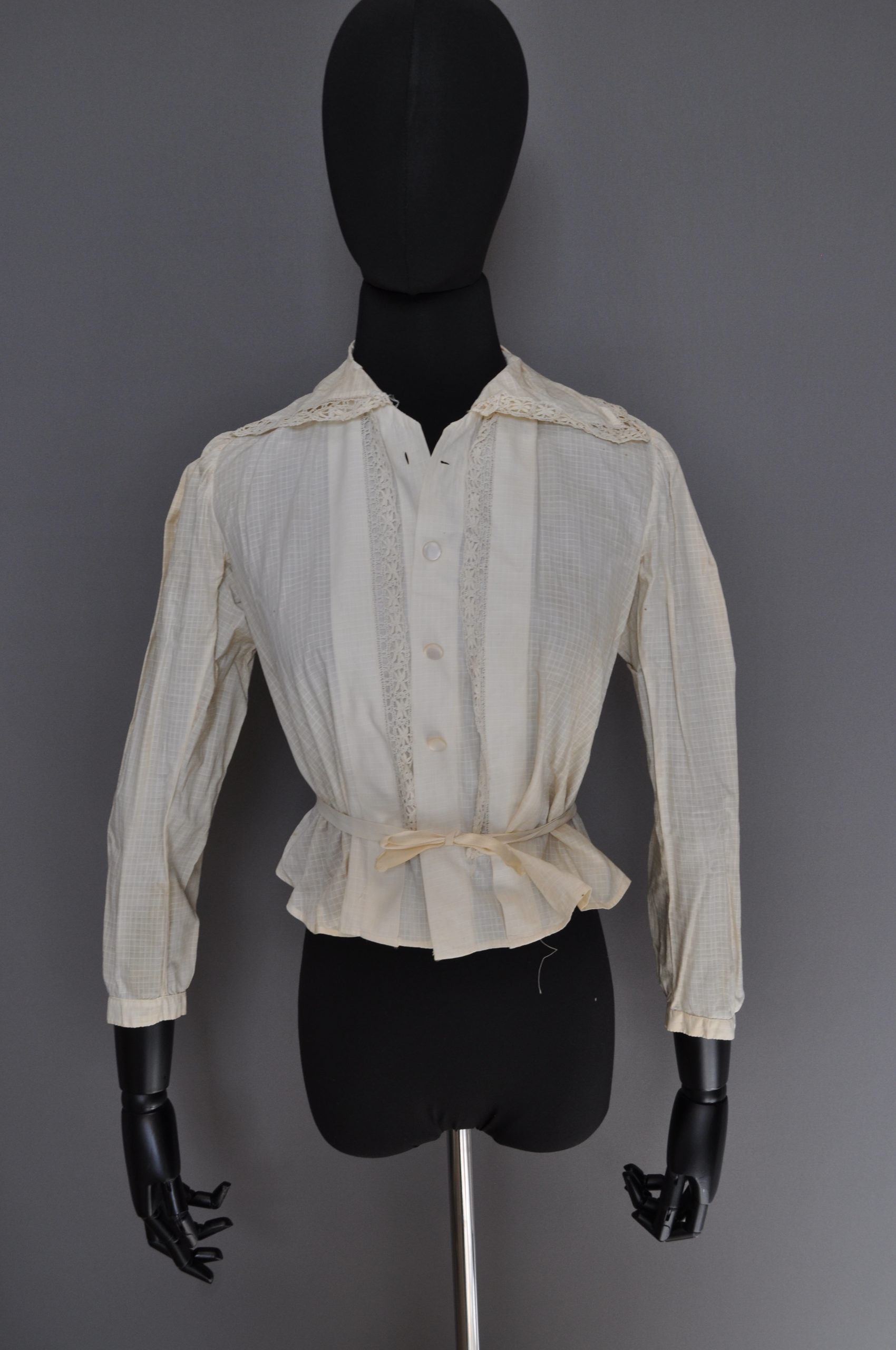 button down bouse made from fabric with slight check. CF and collar lined with lace. waist tie attached at back