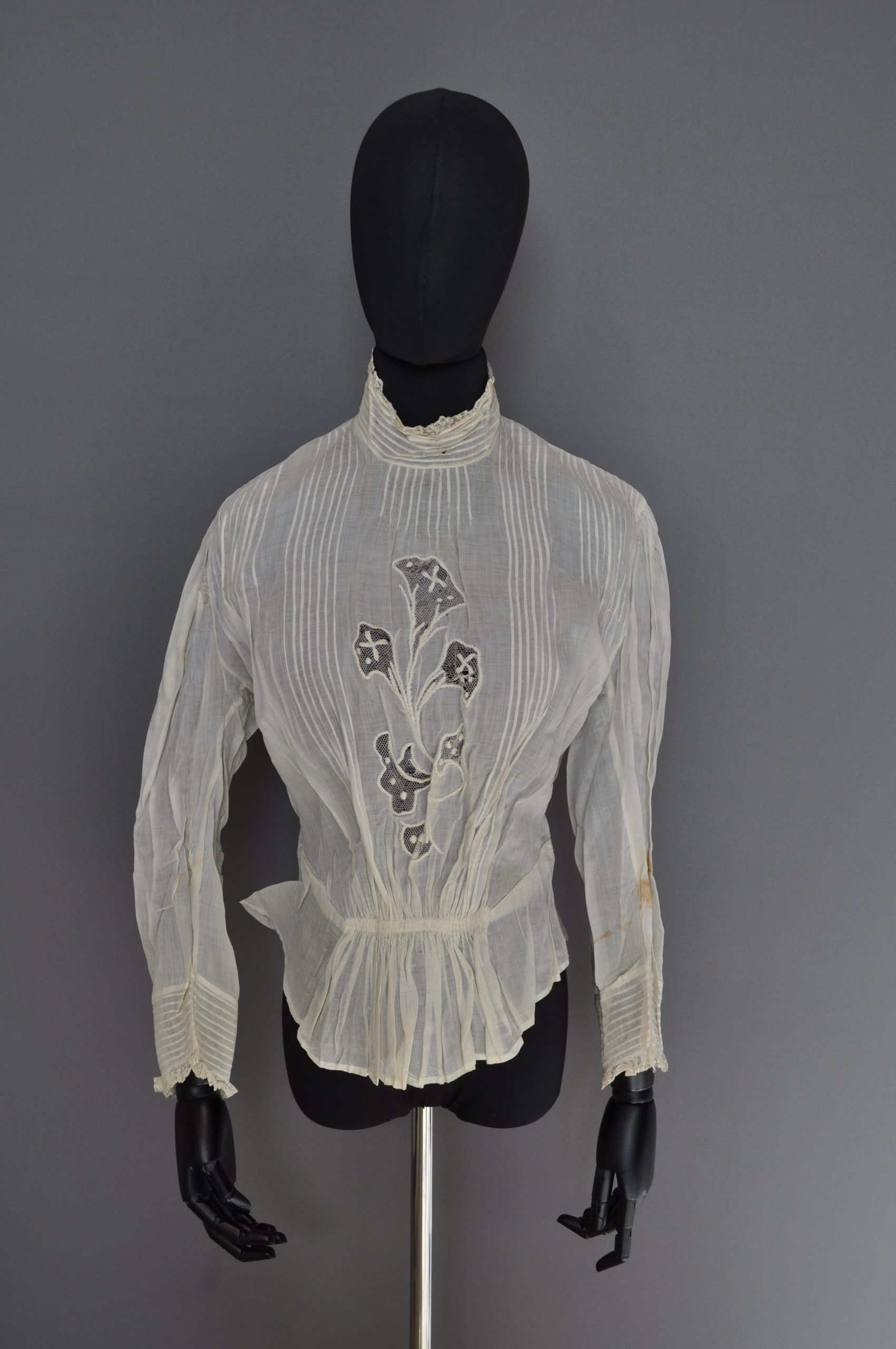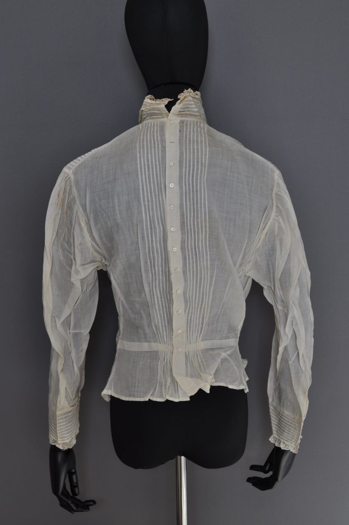 CF button down blouse with tucks at CF, CB, collar and cuffs. Gathered at CB