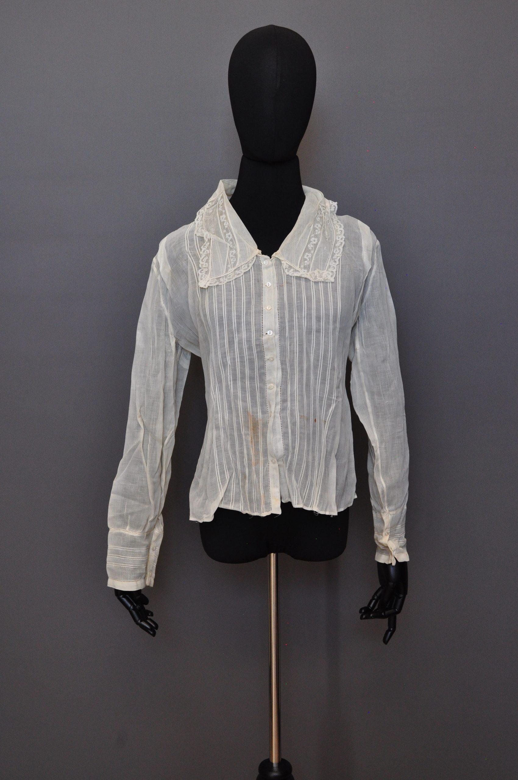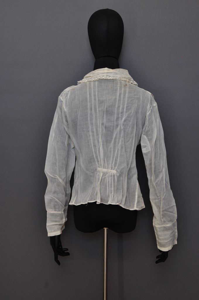 ink inside reads “Mary M. Wolfe” Front button-down blouse with vertical tucks at CF and CB. Pointed collar with insert lace