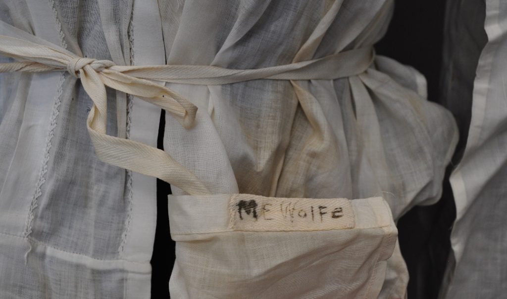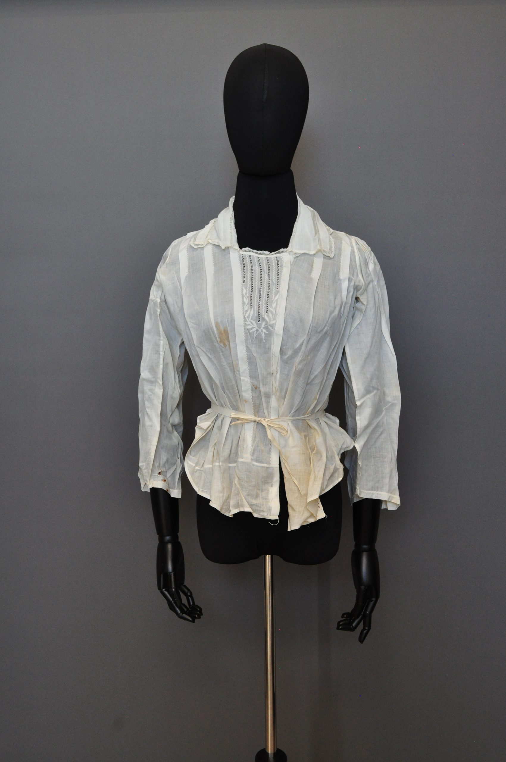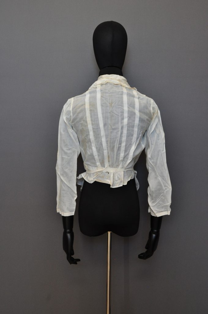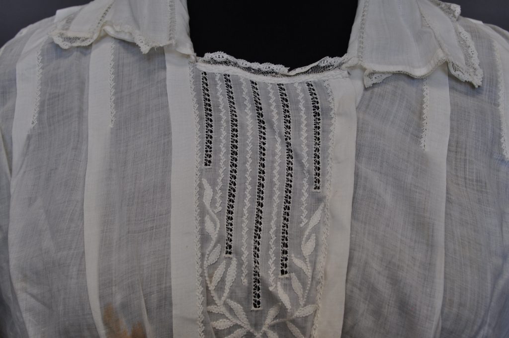 button down blouse with side front opening. Front panel includes decorative embrodery and threadwork. pointed collar has lace. inked inside “M E Wolfe”