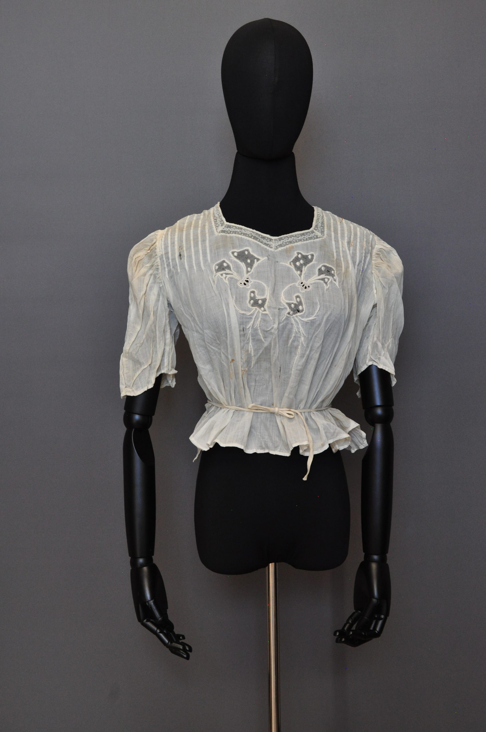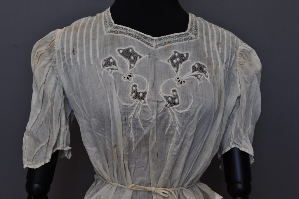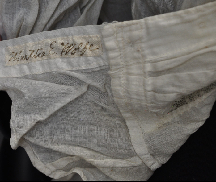 blouse with back buttons and half sleeves. ink inside reads “Martha E. Wolfe”. Embrodery at CF and embrodery at back and collar.