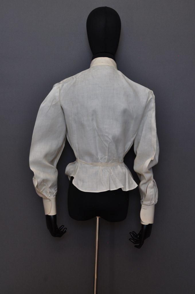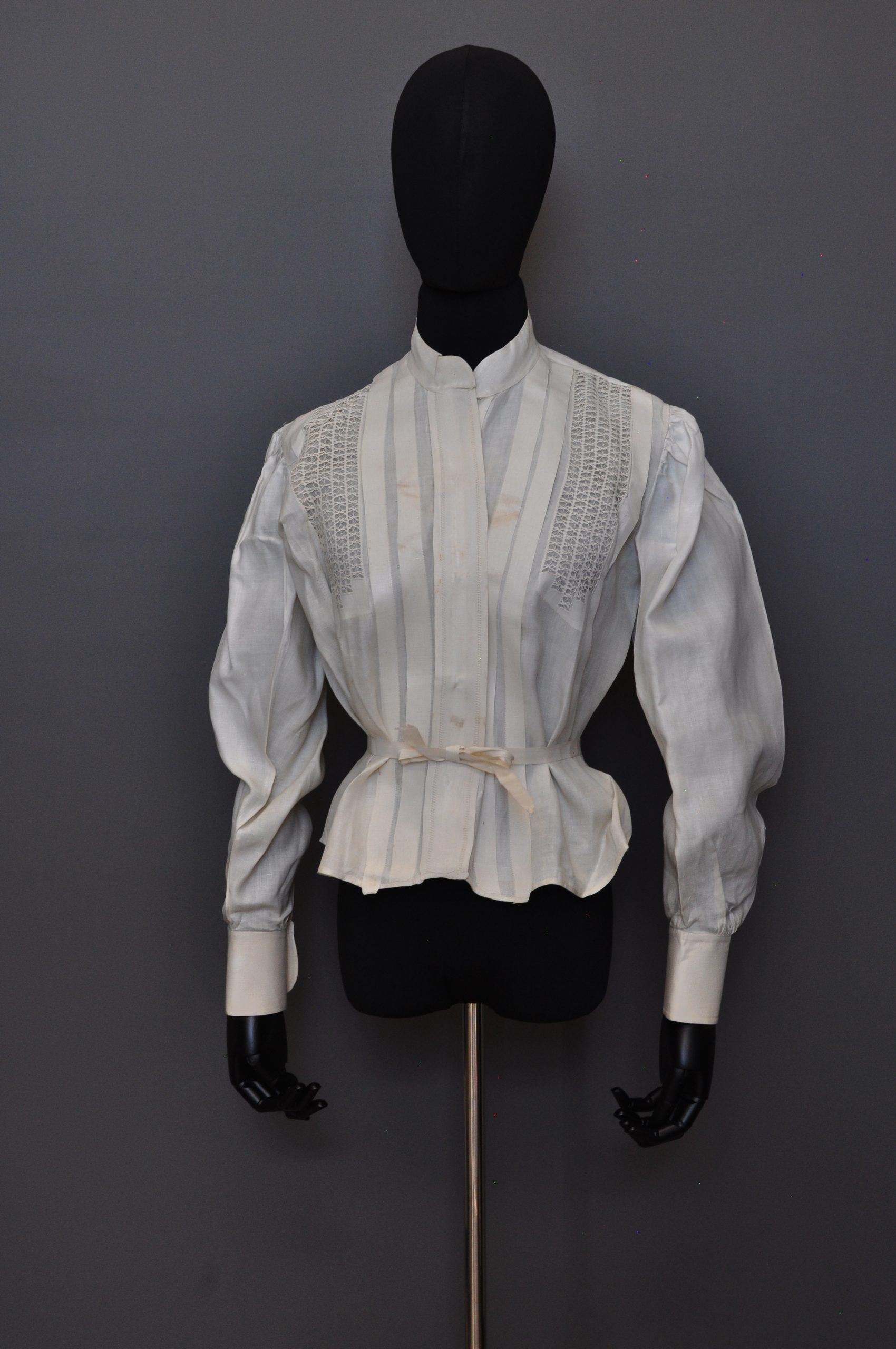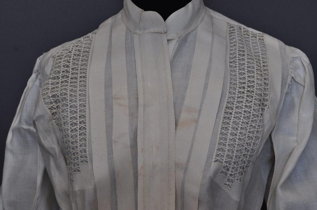 button down starched linen shirt. Vertical 1 in tucks and inswerted lace panels at front.