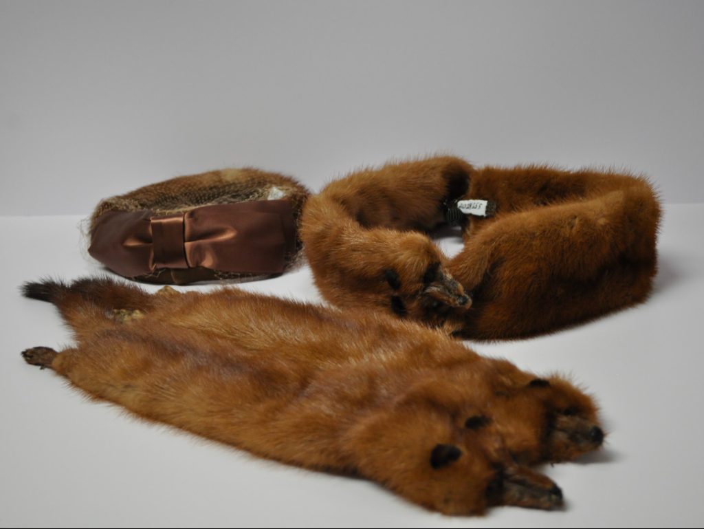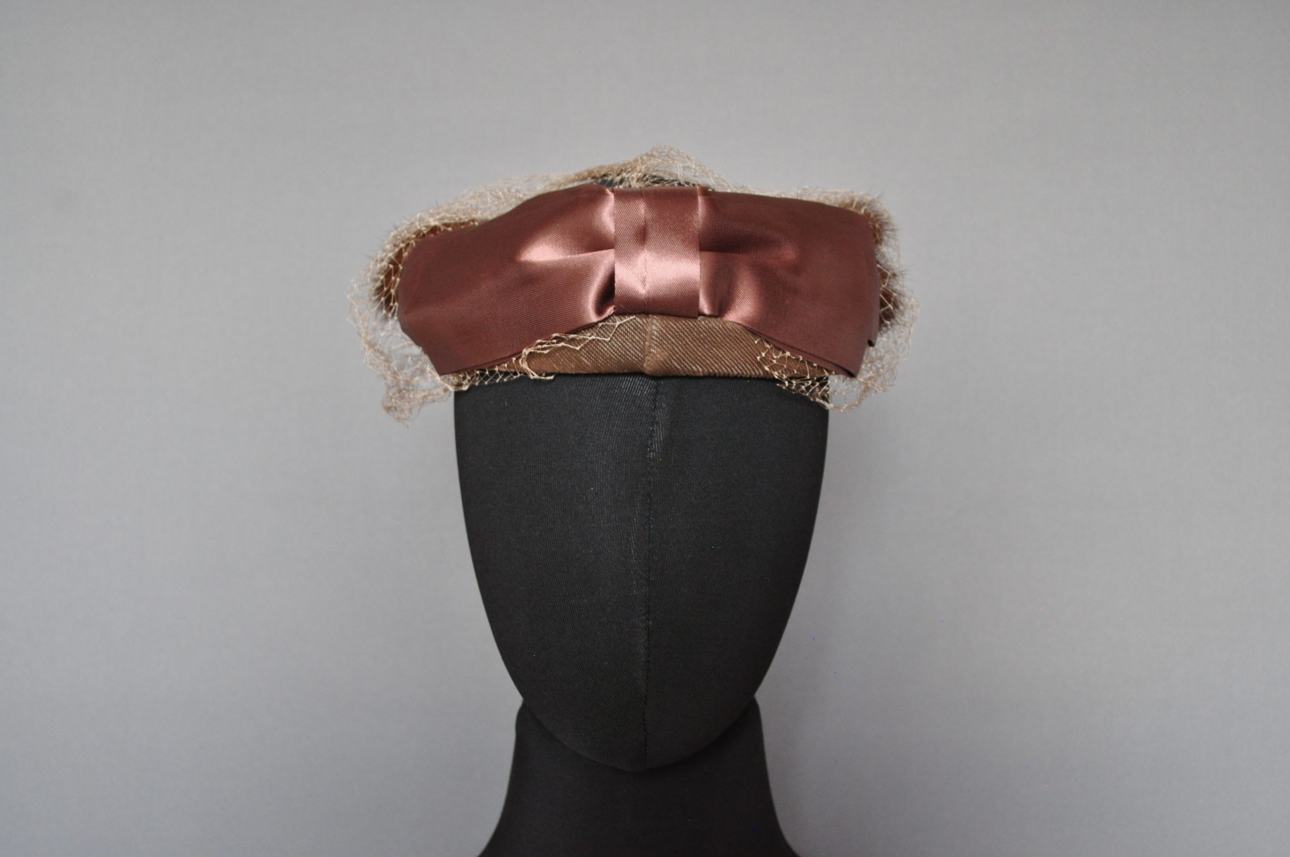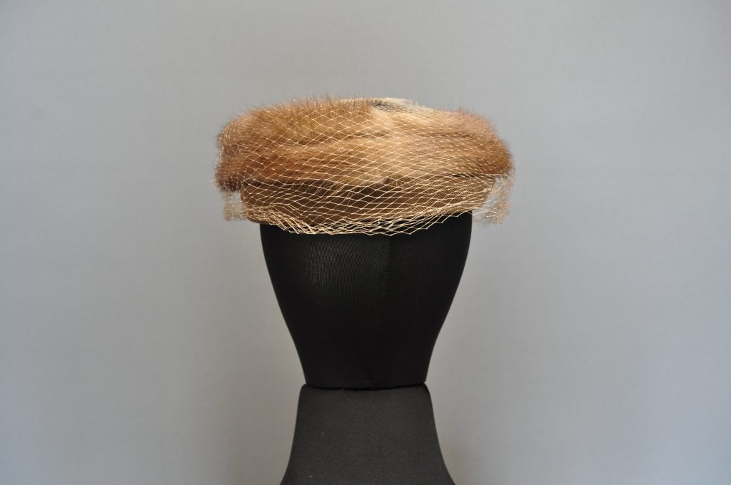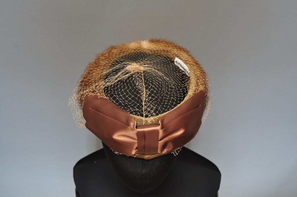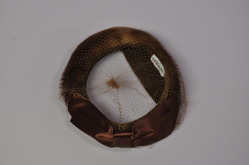 Fur hat, veil on top, bow on the front, 1950s- 60s, part of three-part stole set with 2024155 and 2024156. Lisa Ferrante Perrone, a professor of Italian at Bucknell, donated this piece. It was originally owned by Angela Castagna Formato, born in 1903 and grew up in Manhattan.