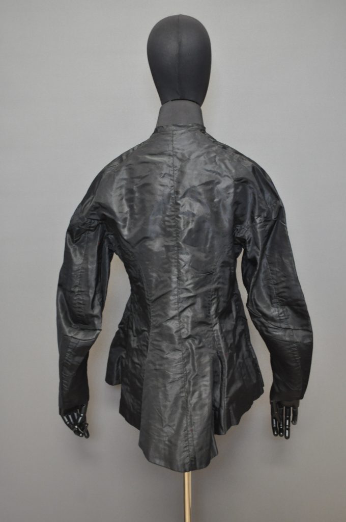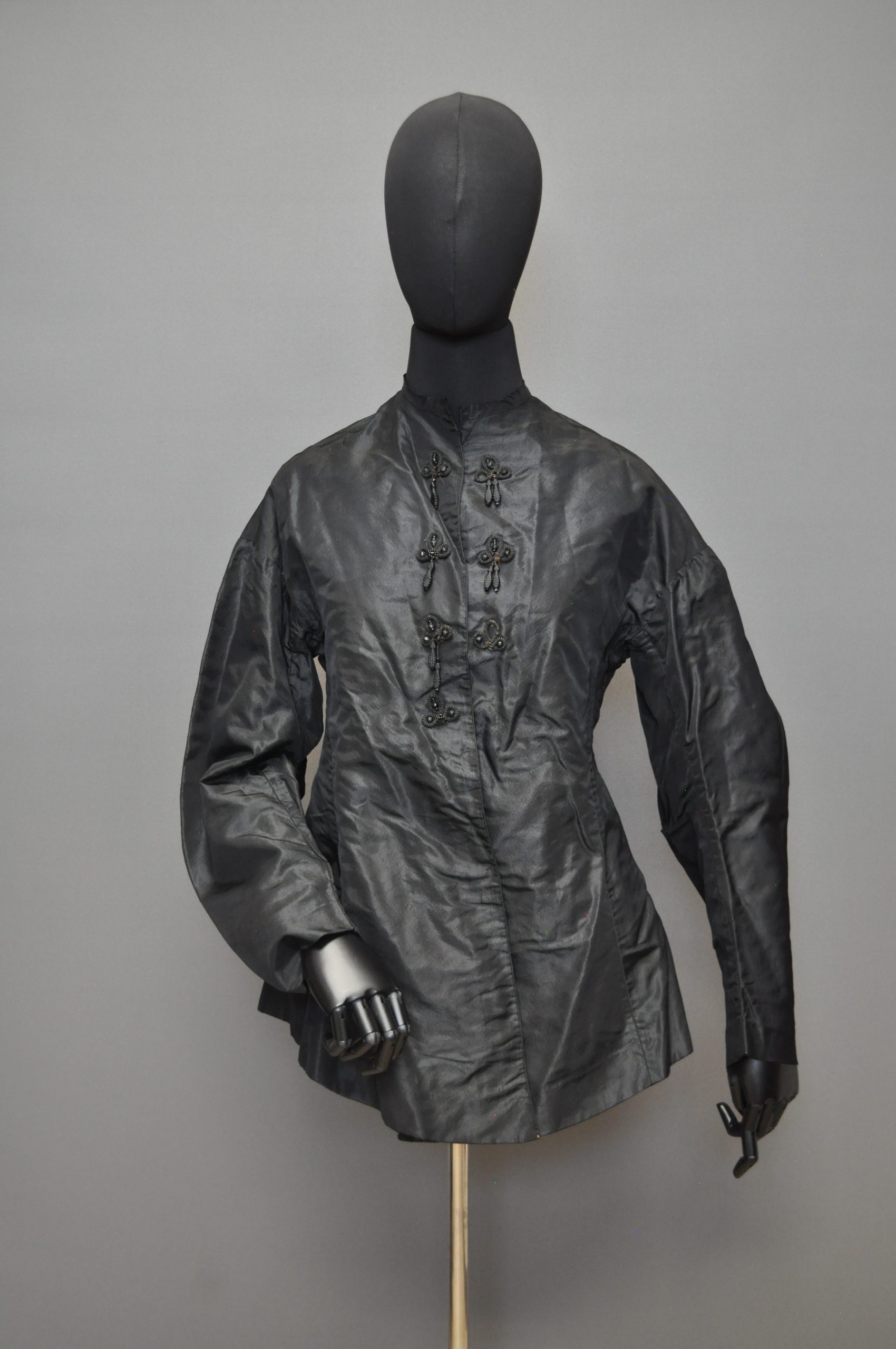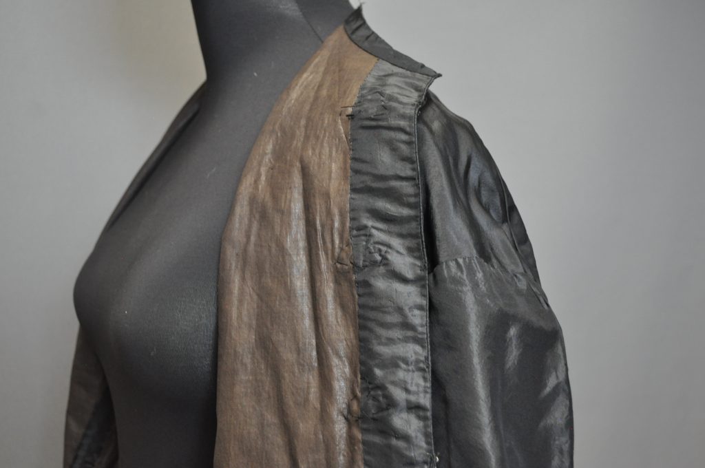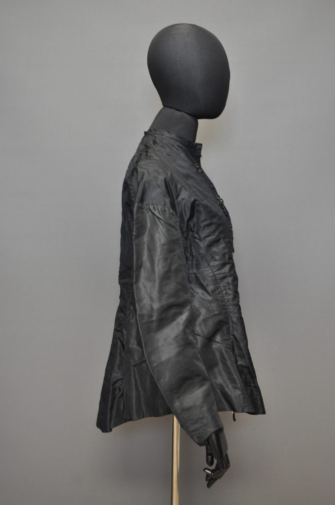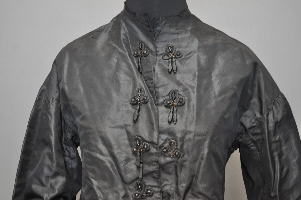 silk jacket flatlined with dark brown polished cotton. 2-piece sleeves and CF opening with hooks. CF is adorned with beaded decorations.
