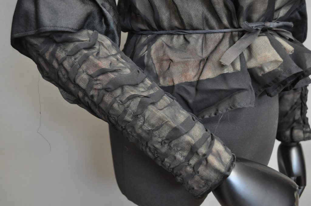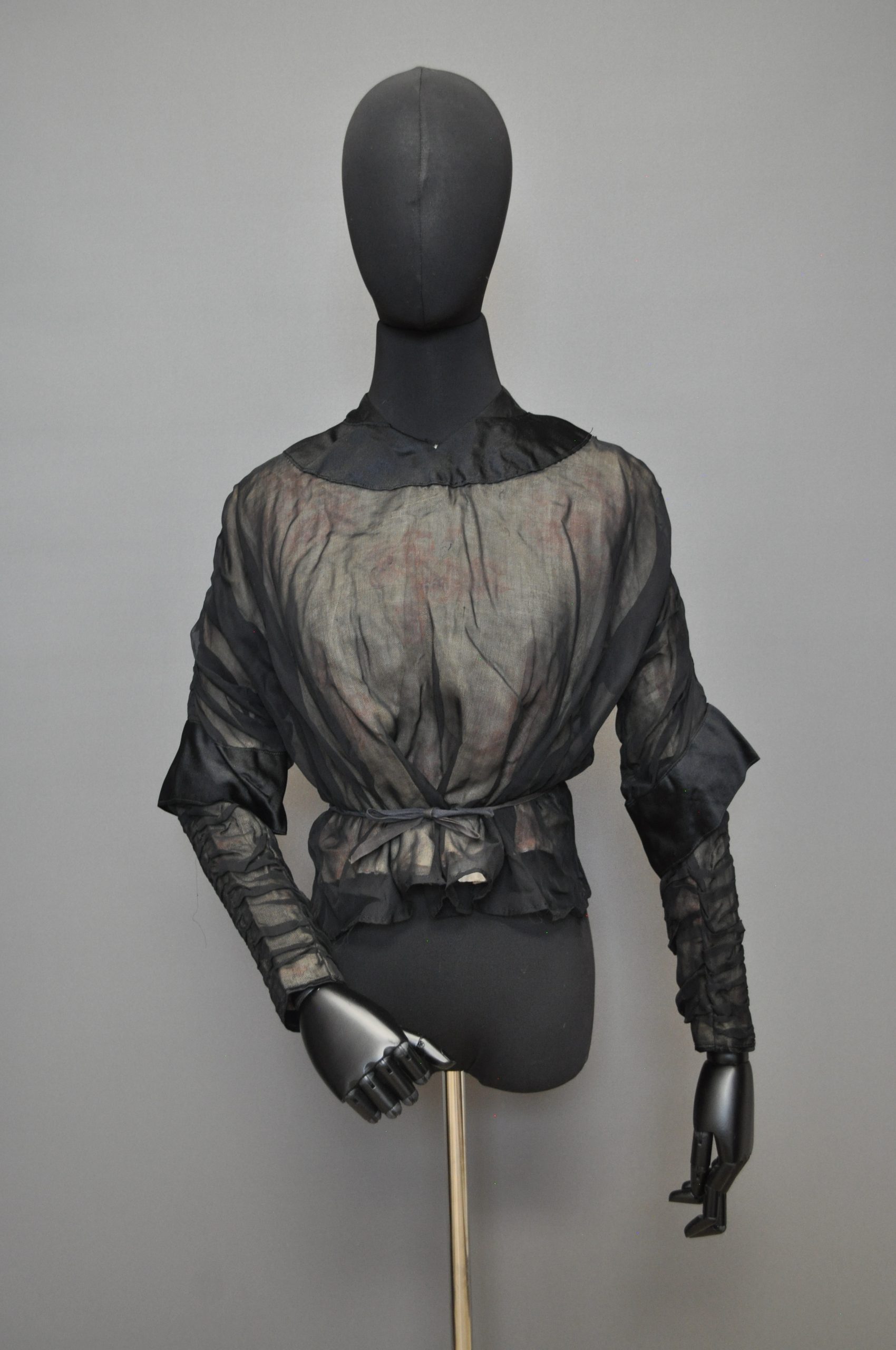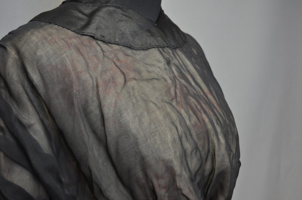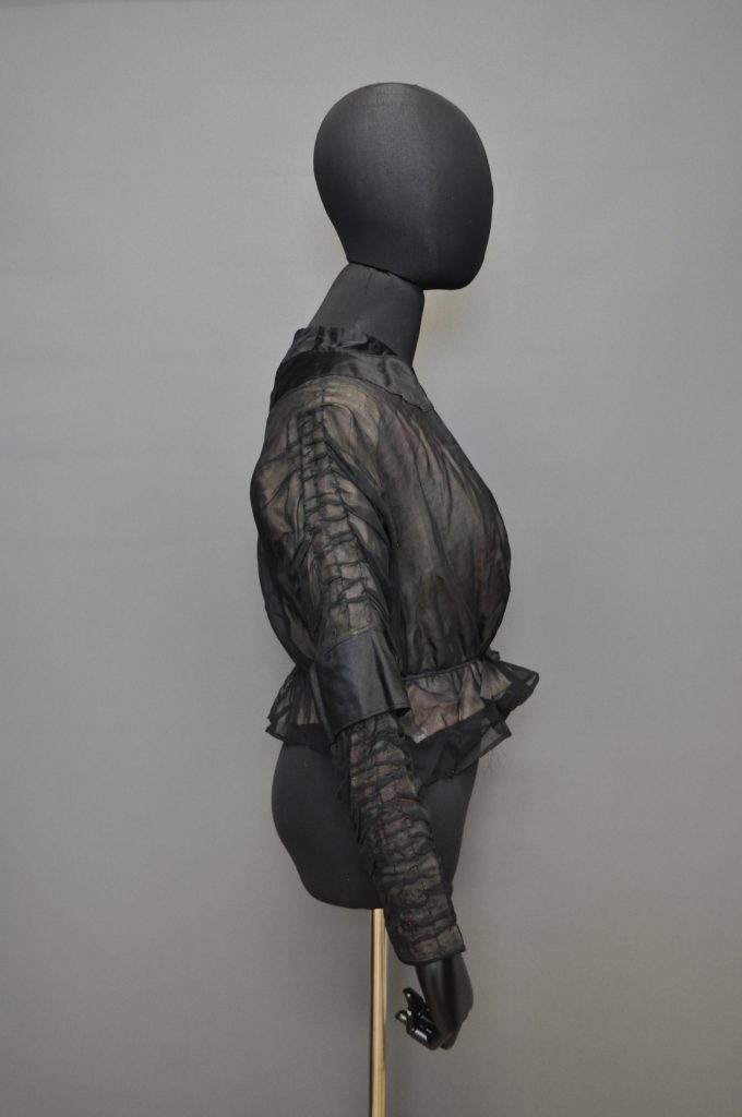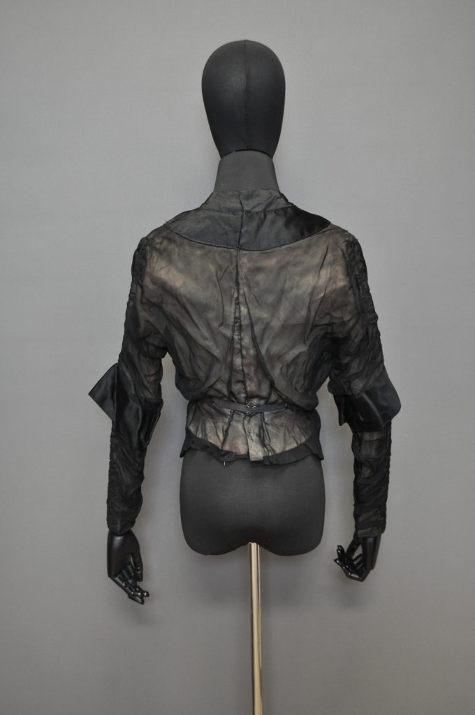 black bodice with CB opening with hooks. cream silk lining with cream netting with pink flowers, topped with black chiffon. 2-layer sleeve has gathered detail.