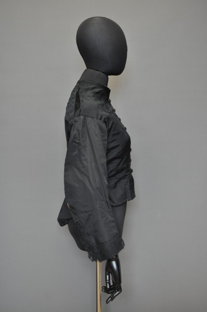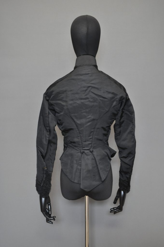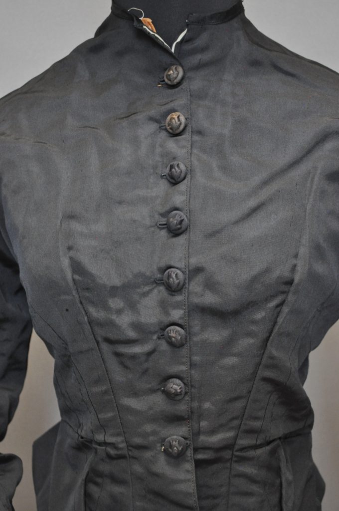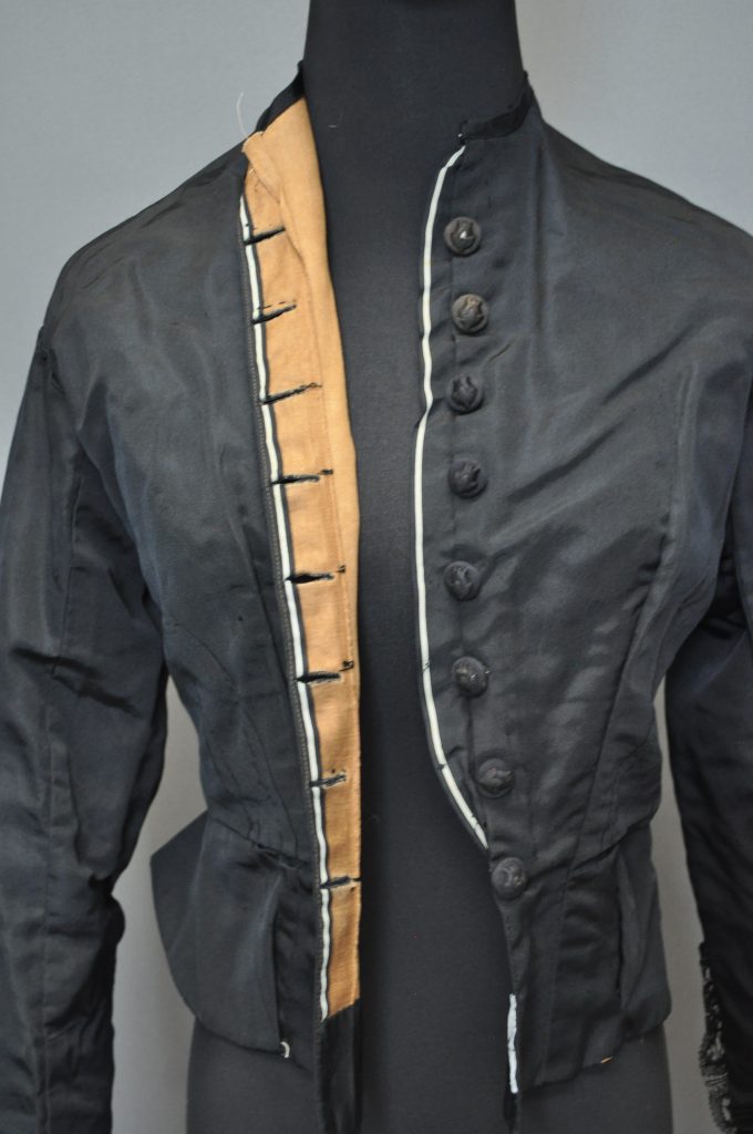 Center front button-down fitted bodice with lace at cuffs, 2-piece sleeve, and flounce at bottom CB. Silk ottoman outer fabric, Flatlined with light brown cotton.