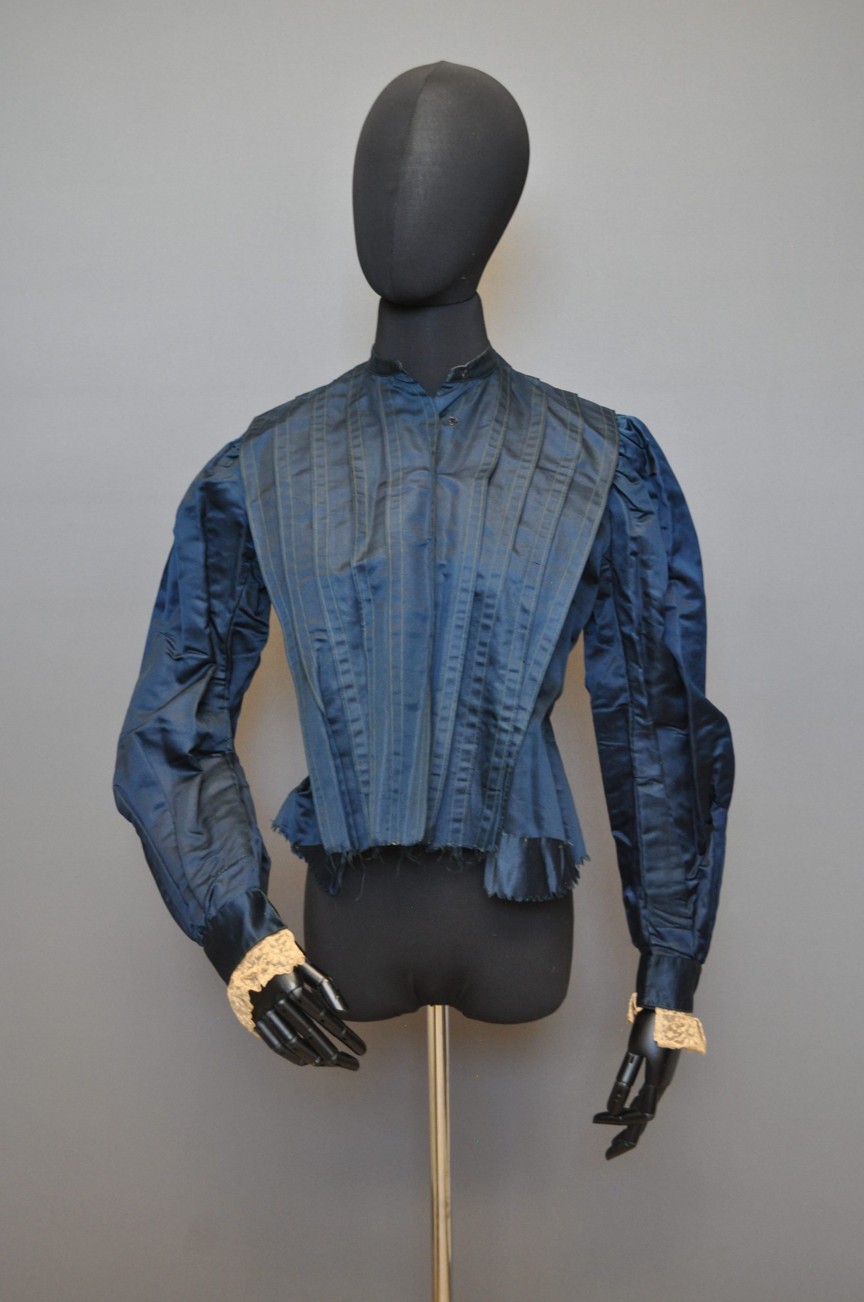 blue satin bodice. 2-piece sleeve. polished cotton lining. CF opening with hooks. decorative pleats with green stitching at the front and back. lace at cuffs.