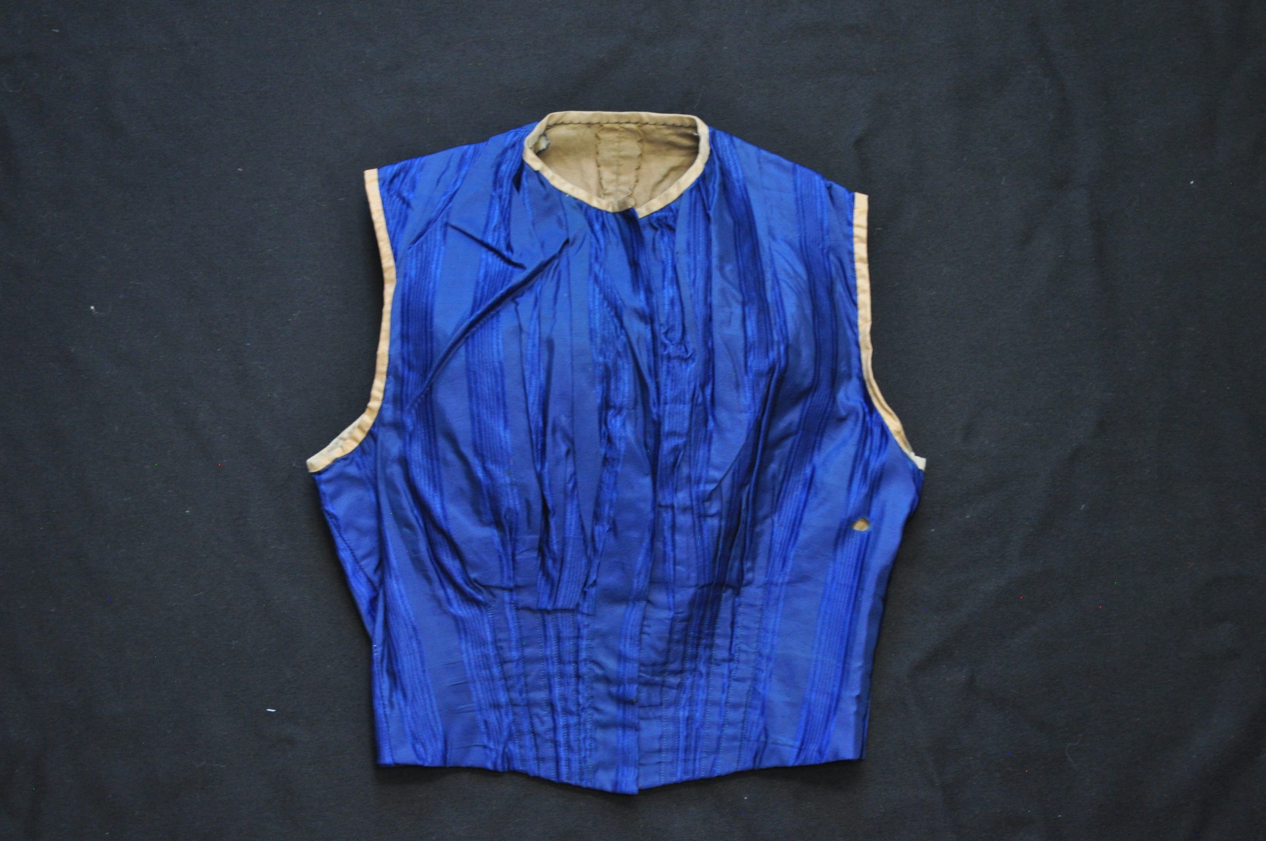 (19th century) blue waistcoat with striped, blue silk fabric. light brown polished cotton lining. CF hook opening. gathered pleats at the front and back. bound and pinked seam allowances.