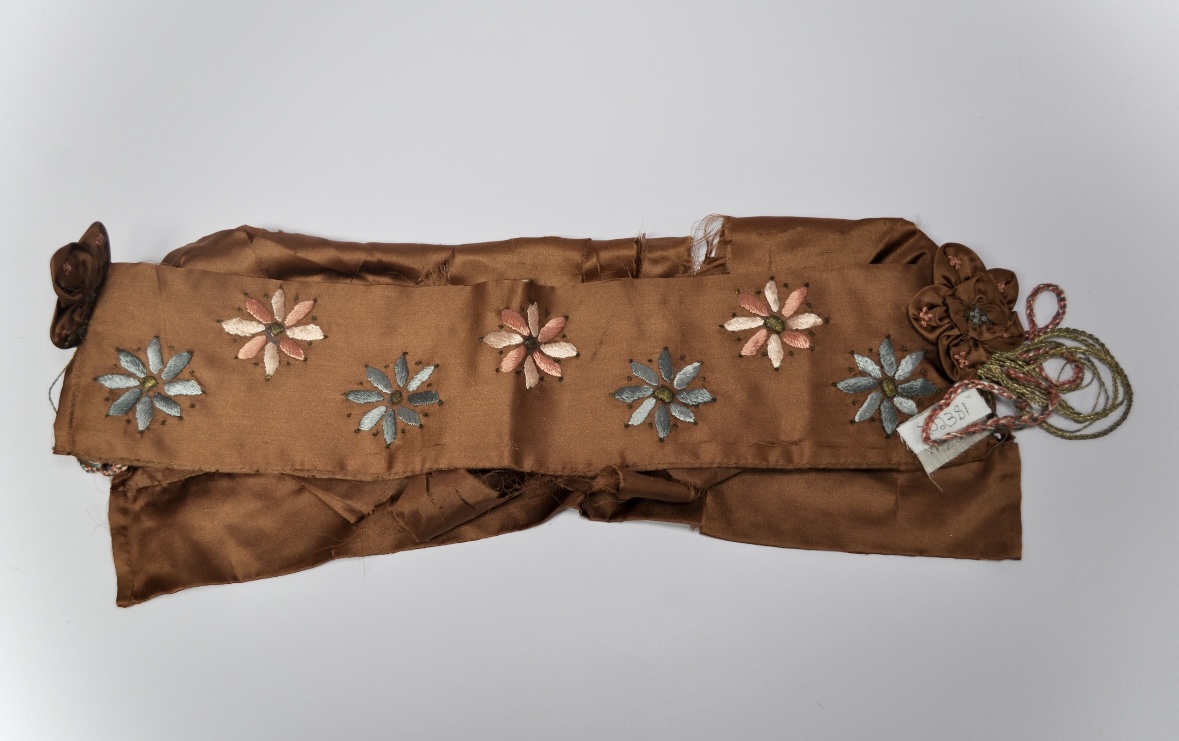 brown silk headpiece (damaged) with pink and blue embrodery. cloth tag on headpiece reads” $1.75″