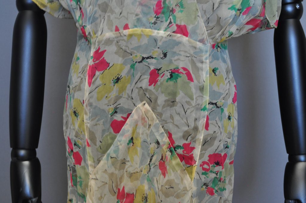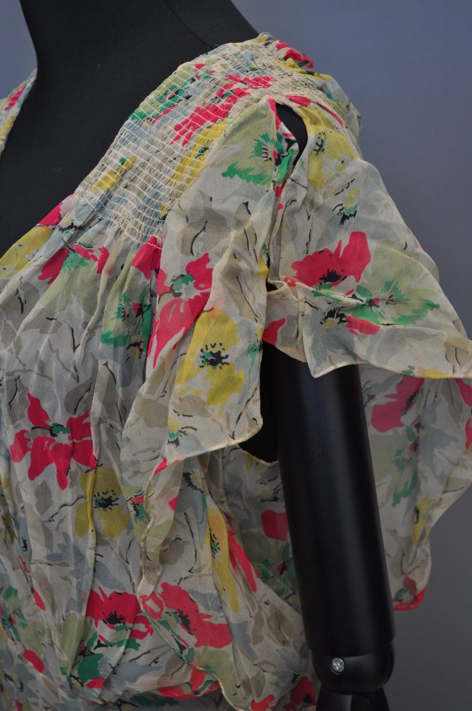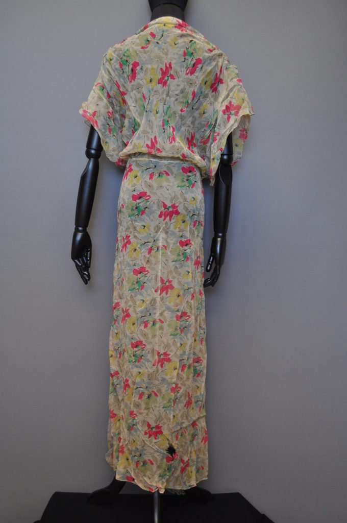 (1930s?) full-length bias-cut gown. Side right snap closure. Flutter sleeves and gathered shoulders.