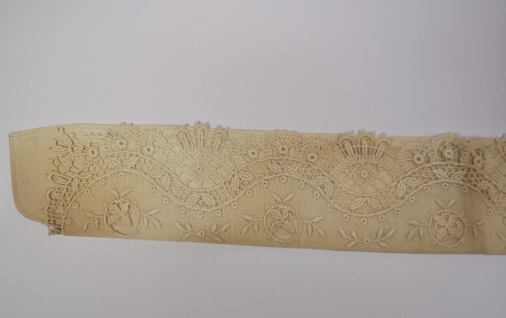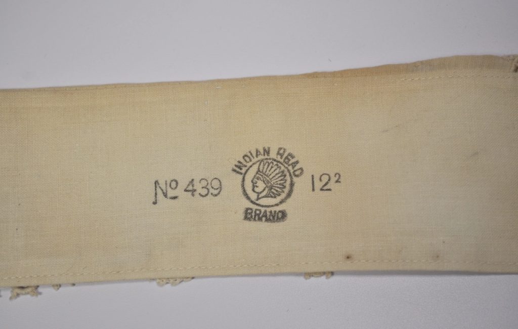 starched collar with lace. Buttonholes for attaching to shirt. ink reads “No 439, Indian Head Brand, 12 “2””