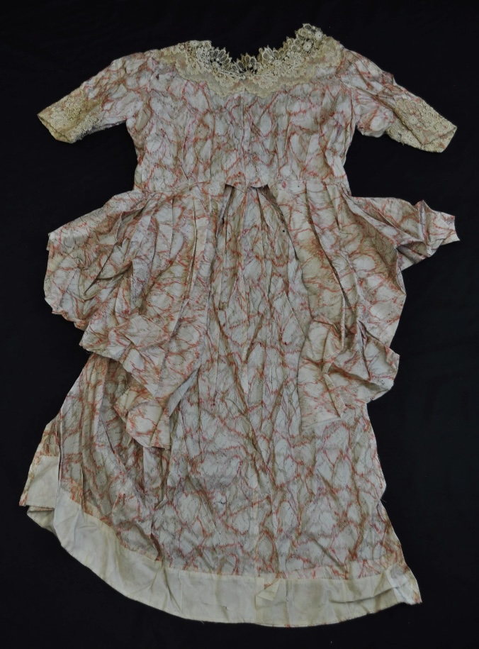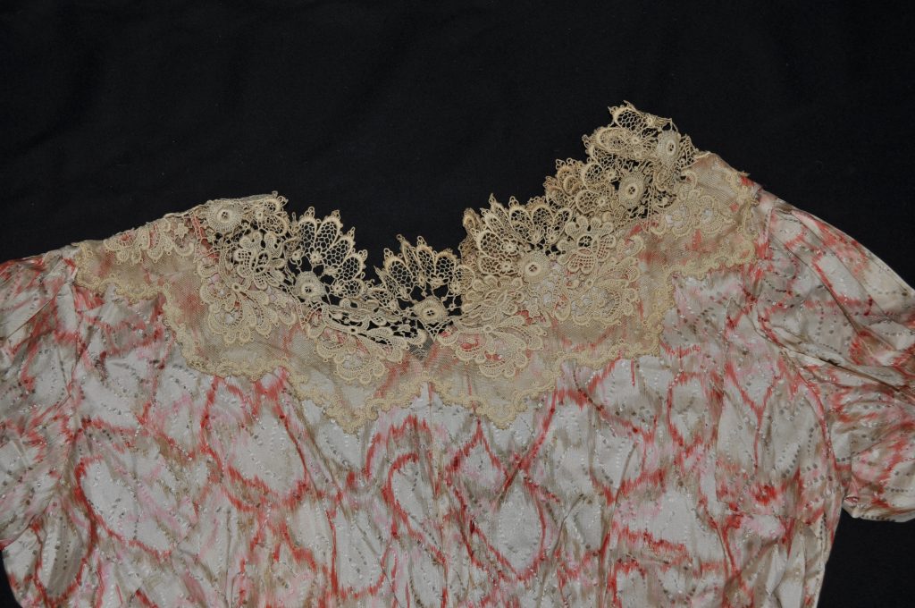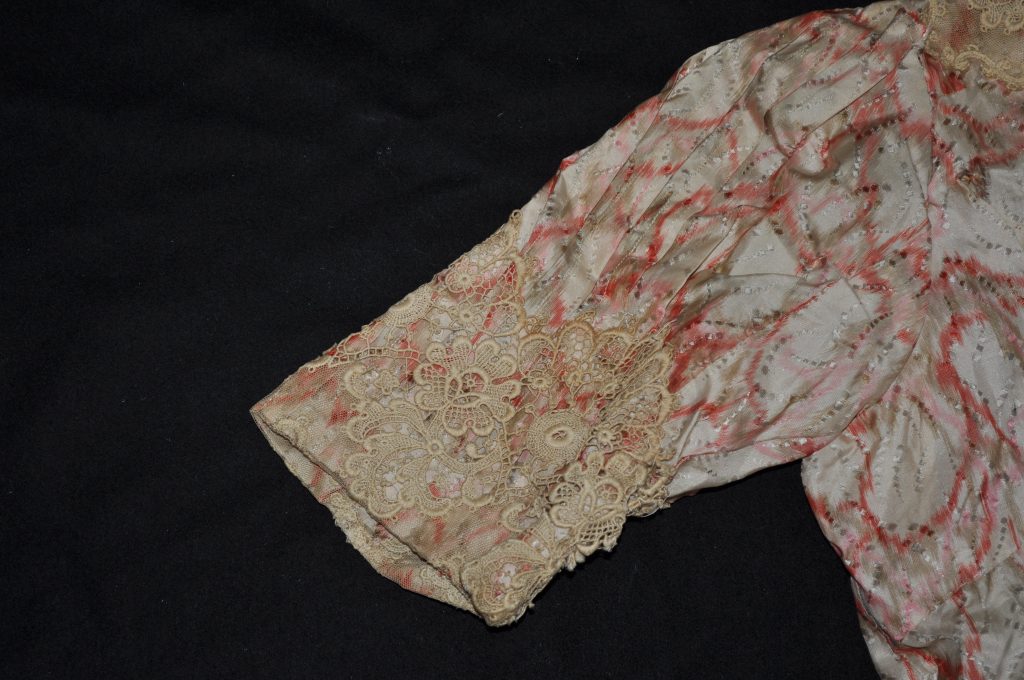 (potentialy a 18th century costume from the 1890s-1920s?) Watteau pleats at the back. cut away at the front with train. 1/2 sleeves with cream lace at neckline and cuffs.
