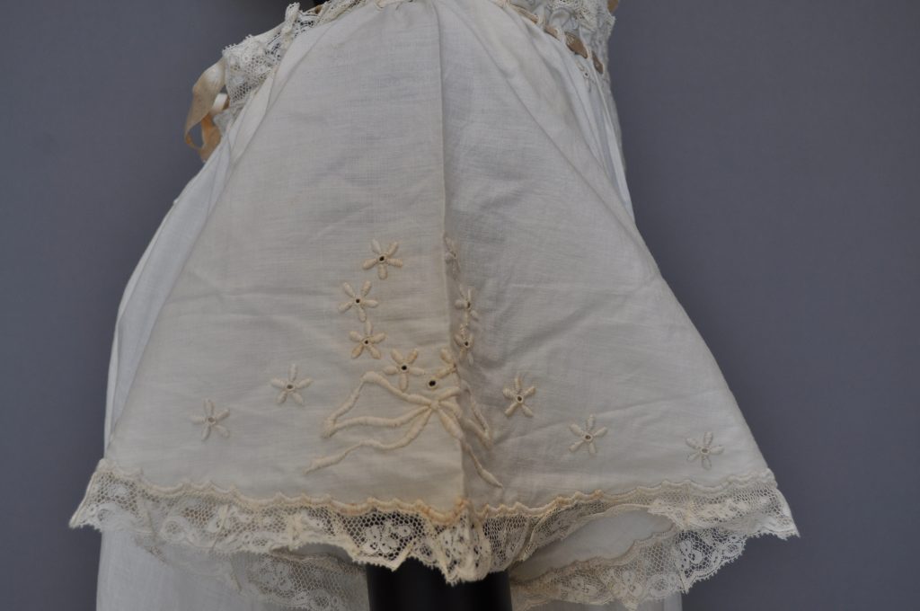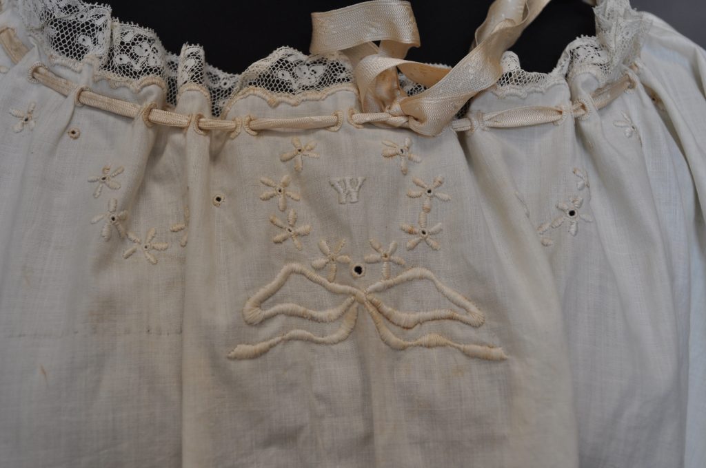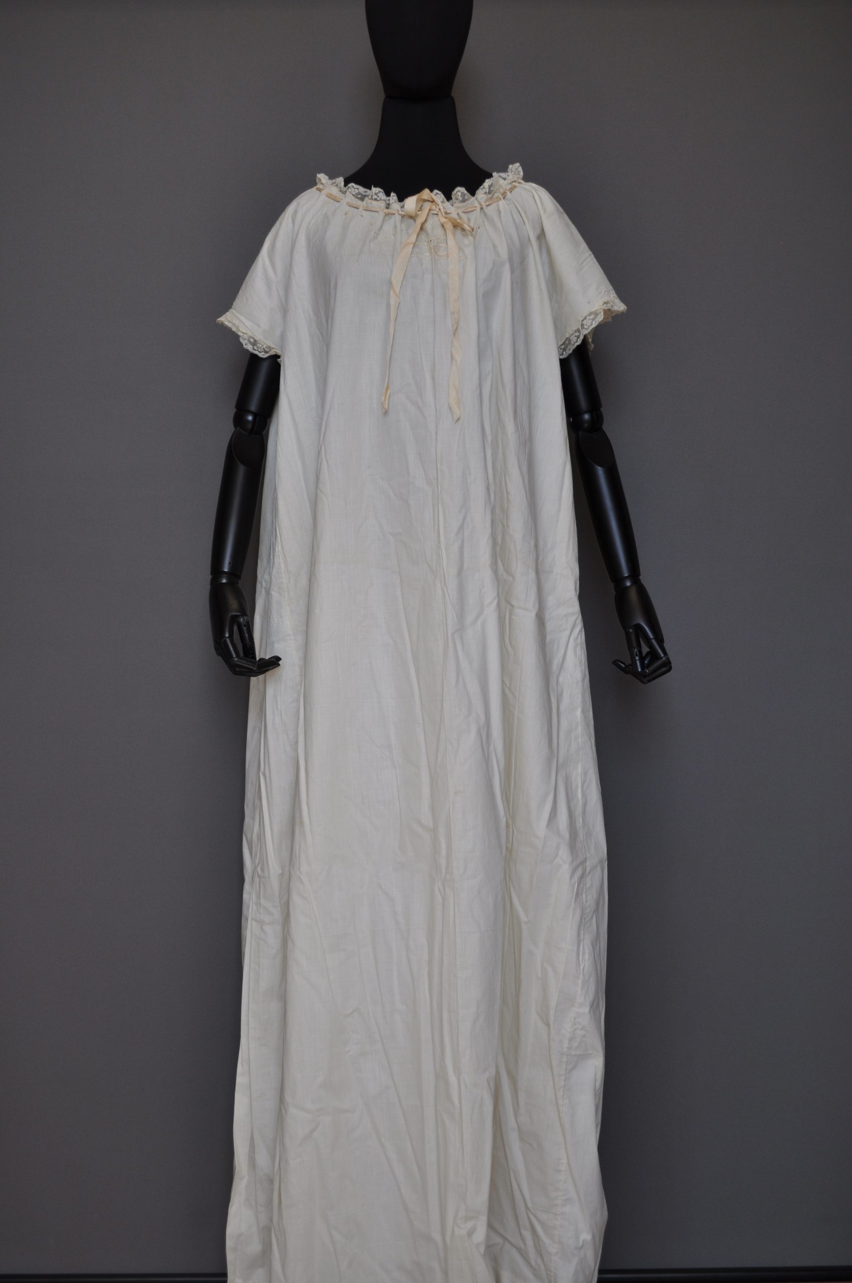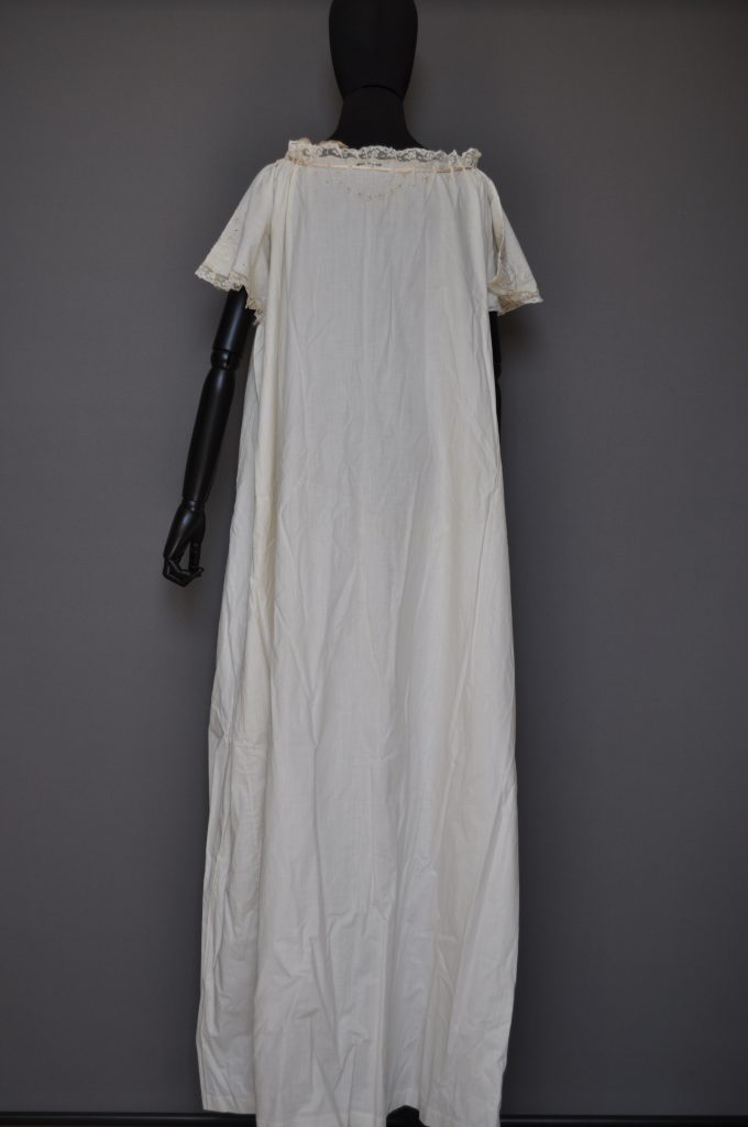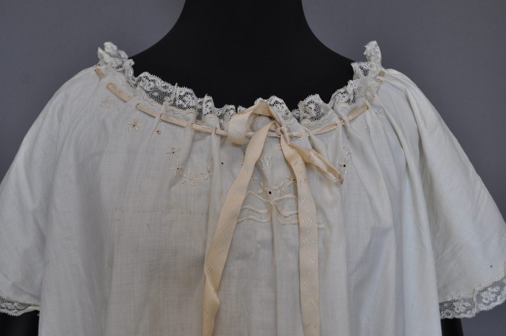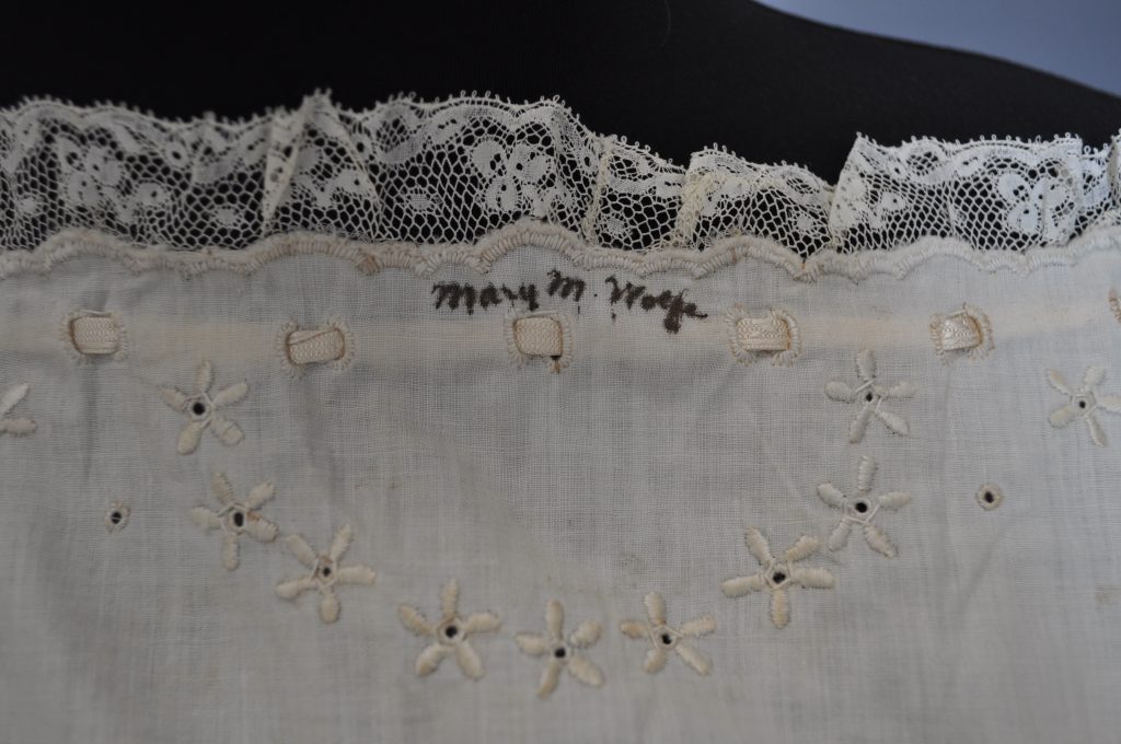 full length cotton nightdress with short sleeves. Ribbon, embroidery, and lace at neckline. Inked “Mary M. Wolfe”.