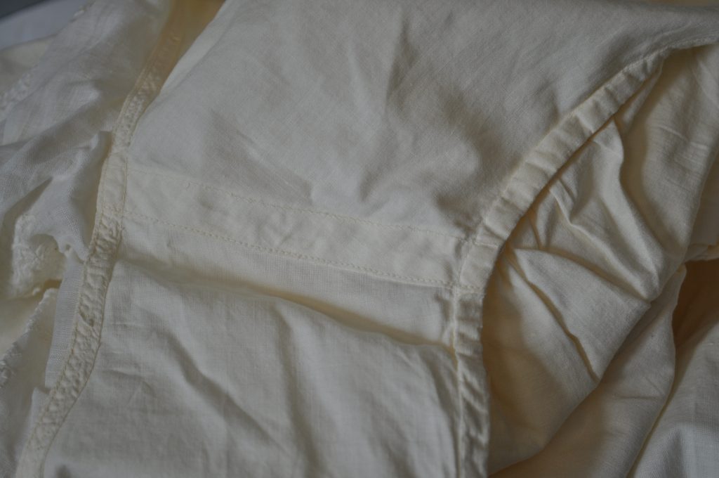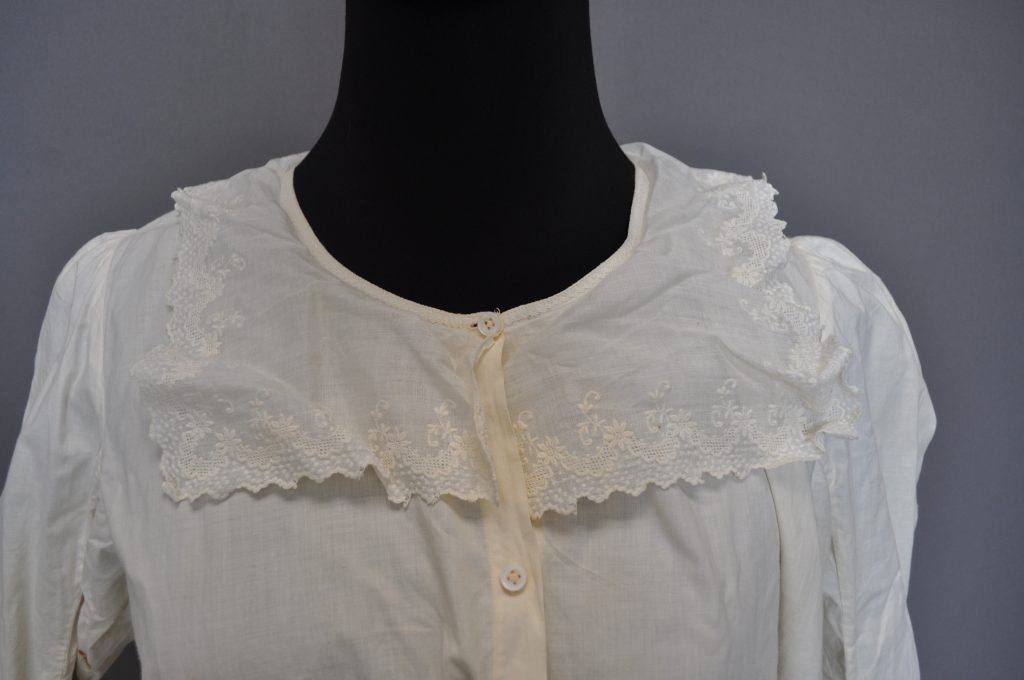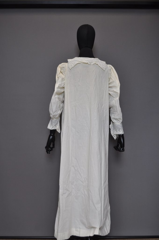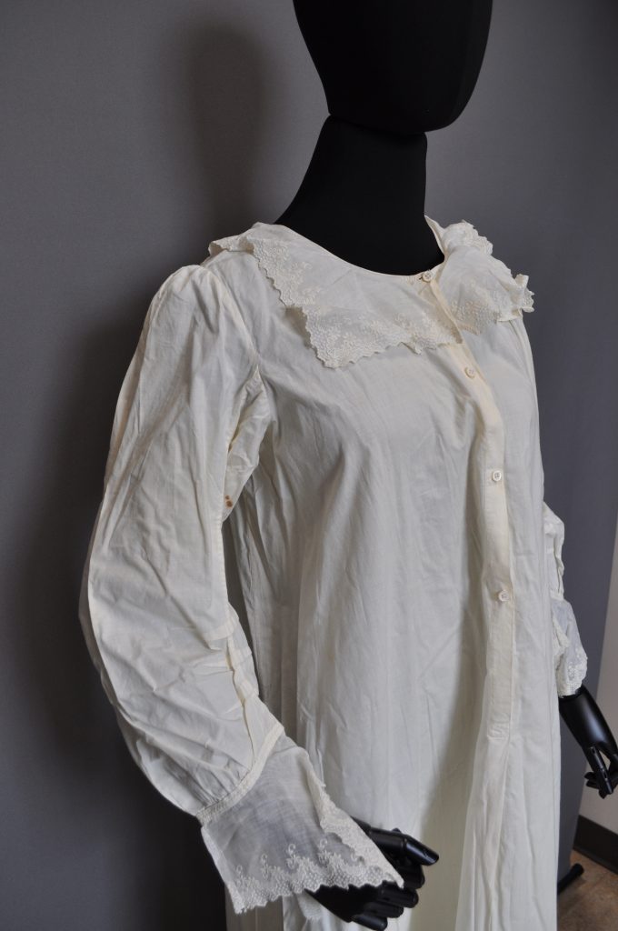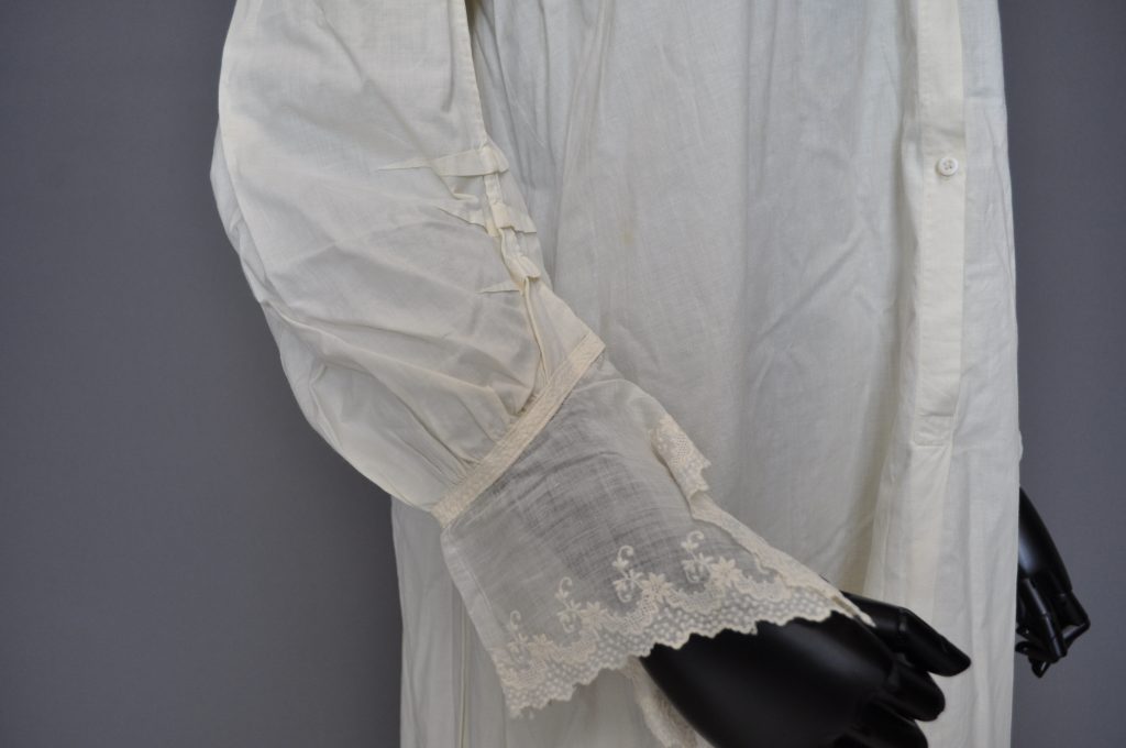 full length cotton nightdress with shaped sleeves, lace at collar and cuffs, and CF button opening.