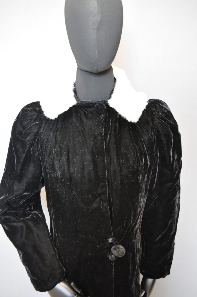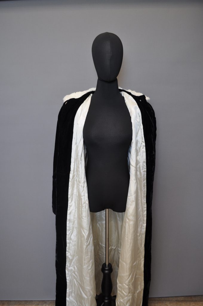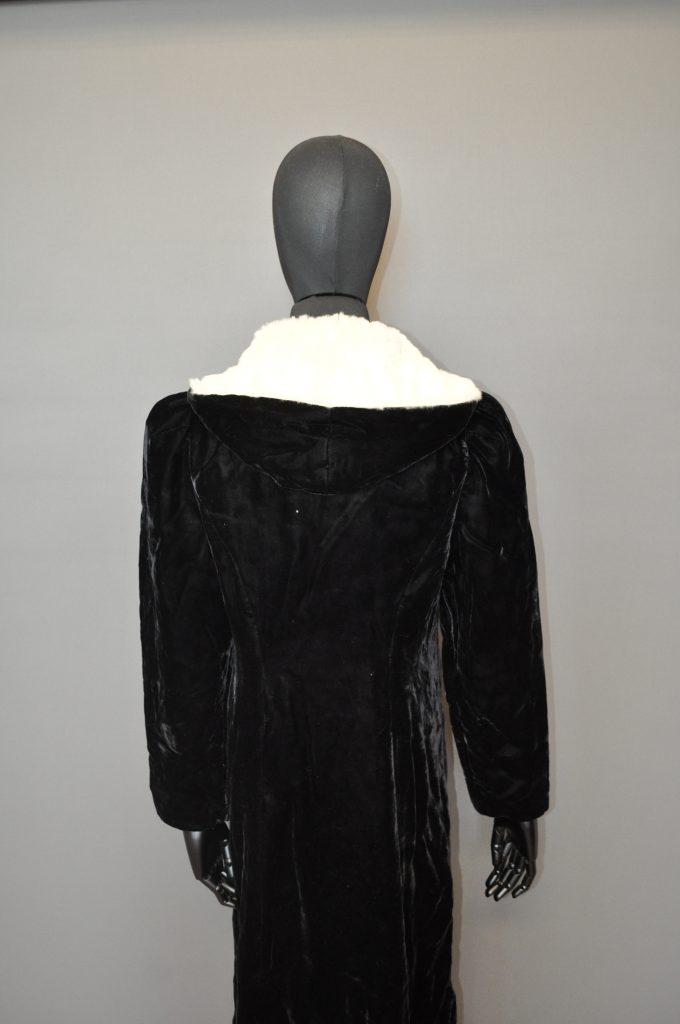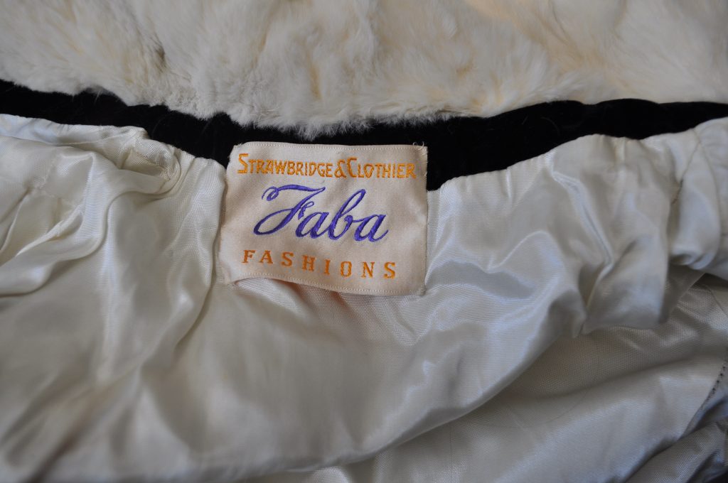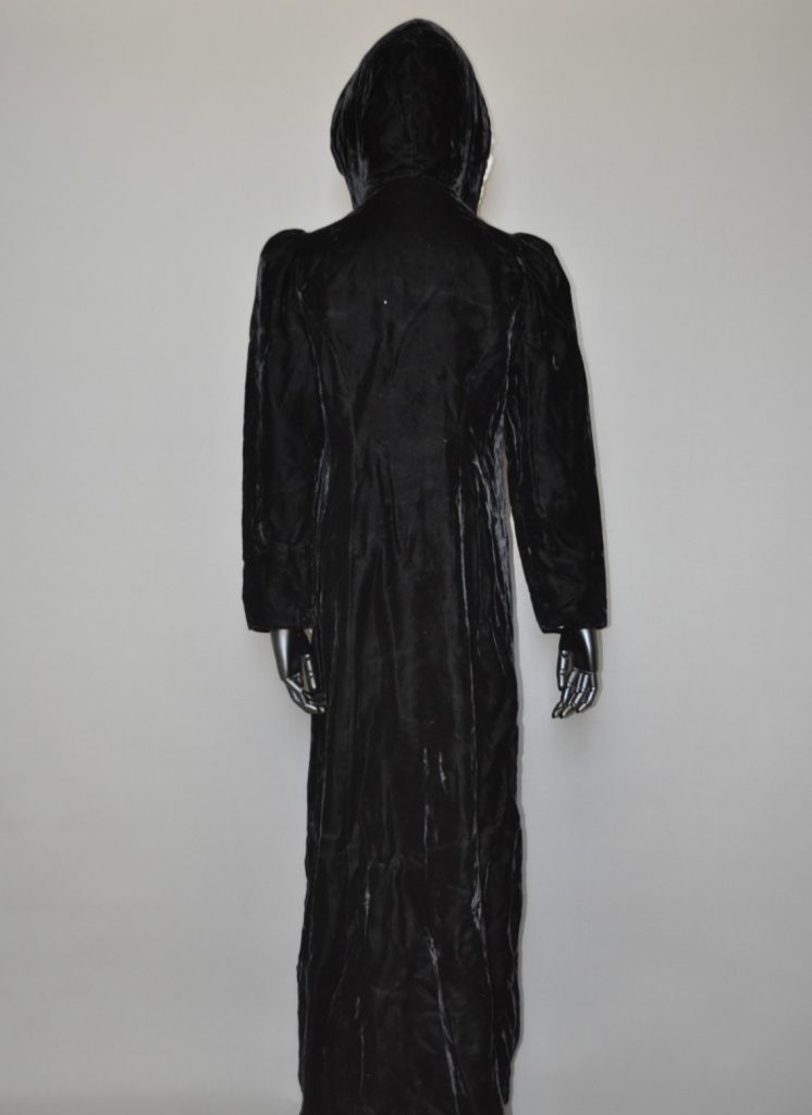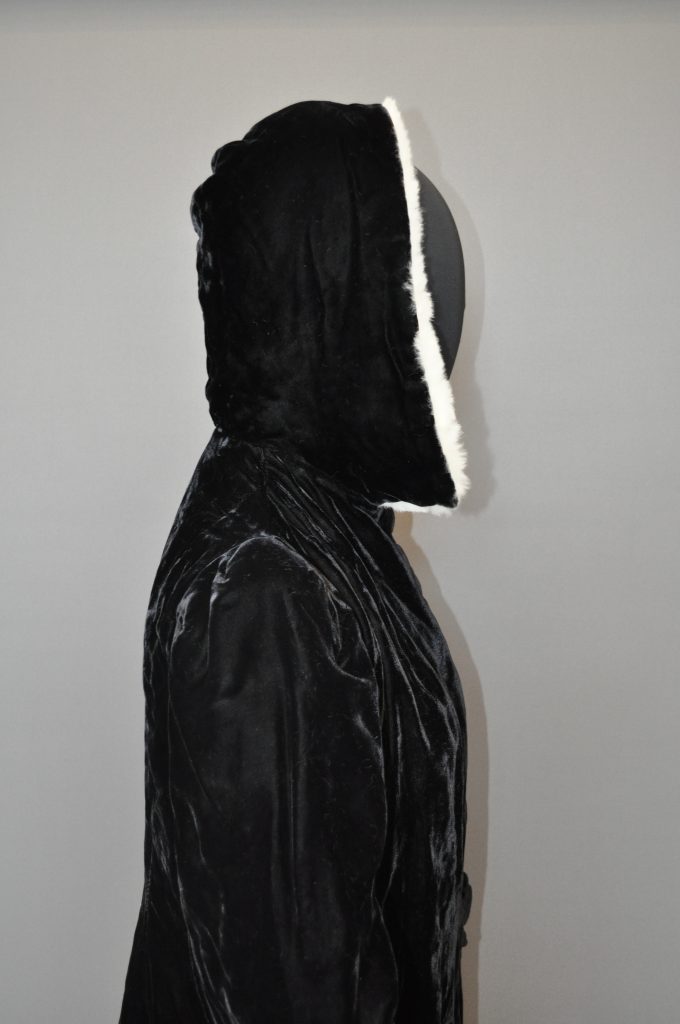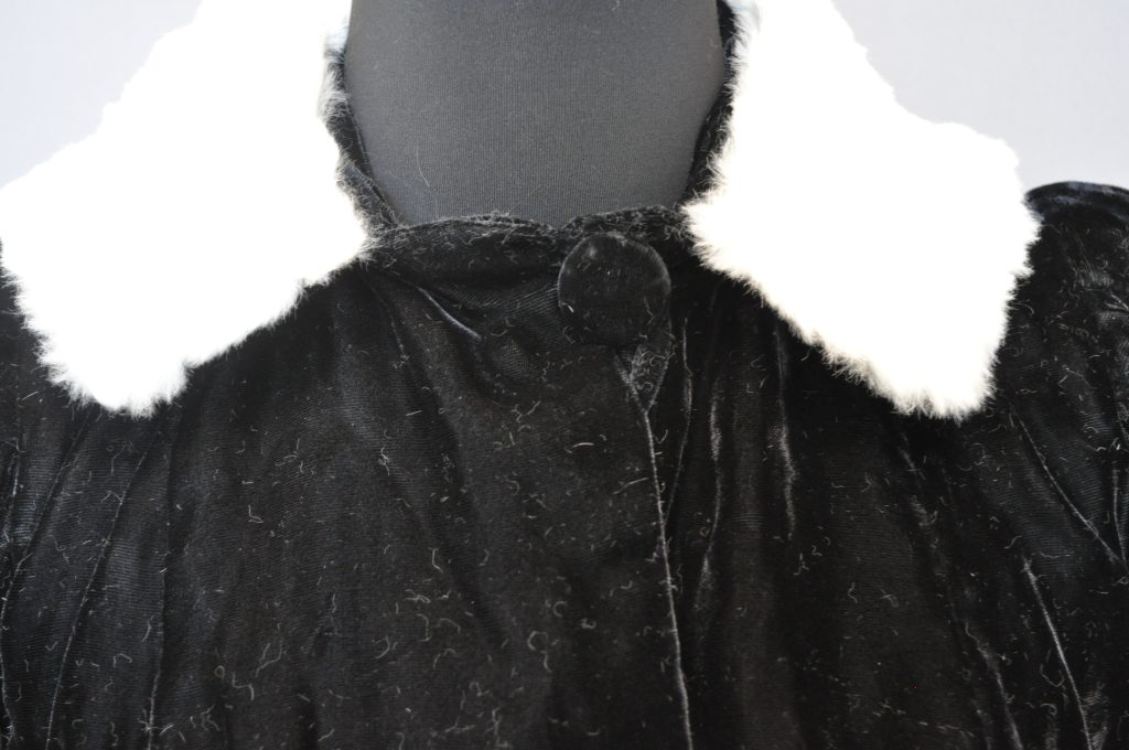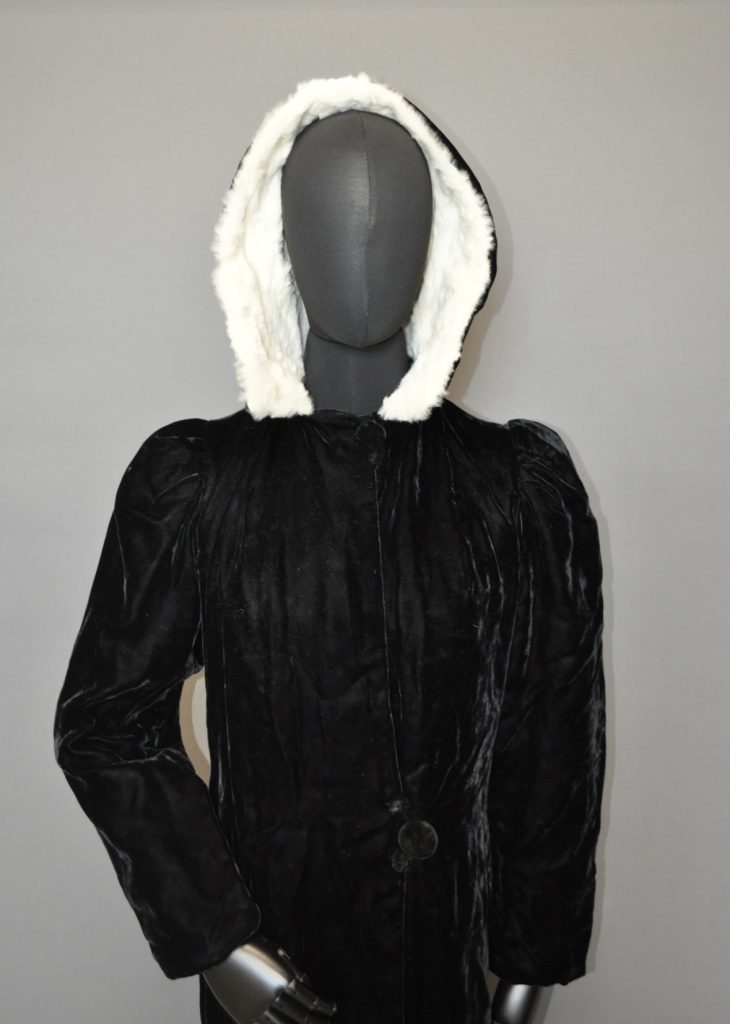 Full length black velvet coat with fur- lined hood. White/ cream lining. The tag reads “Strawbridge Clothier Faba Fashions” Center front opening with two large buttons.