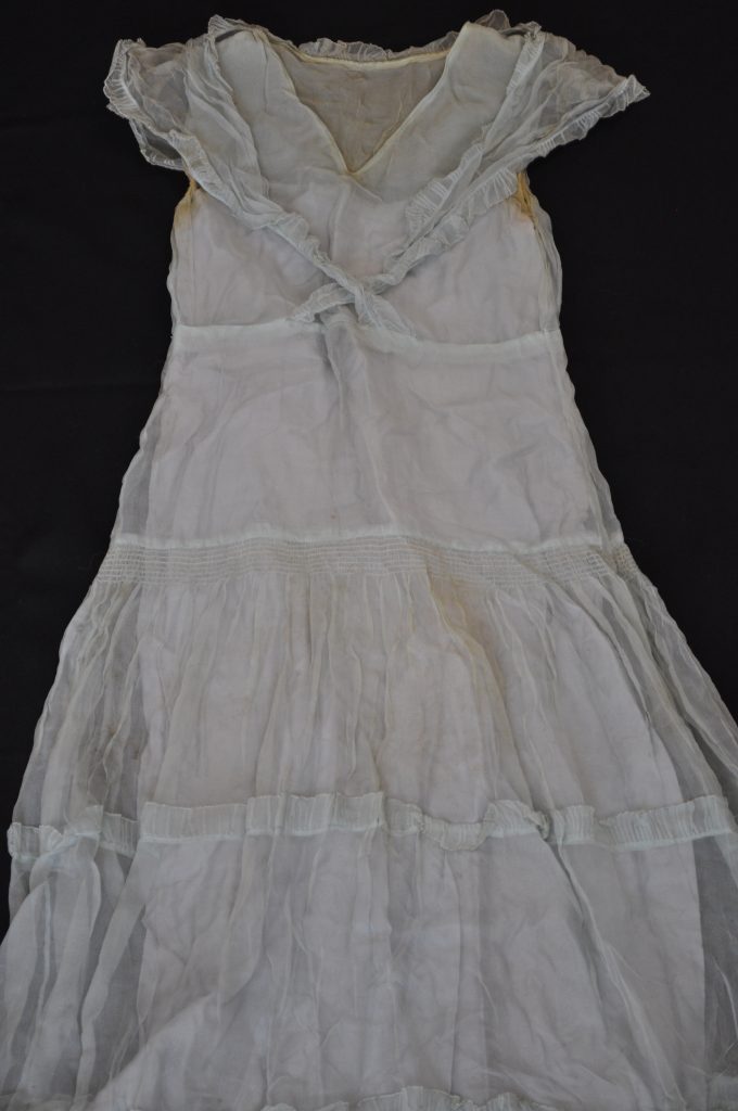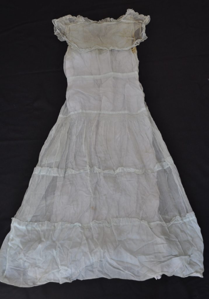 Full length blue chiffon dress. Tiered skirt and blue built- in underlayer. Shawl collar crossed in front. (delicate and stained)