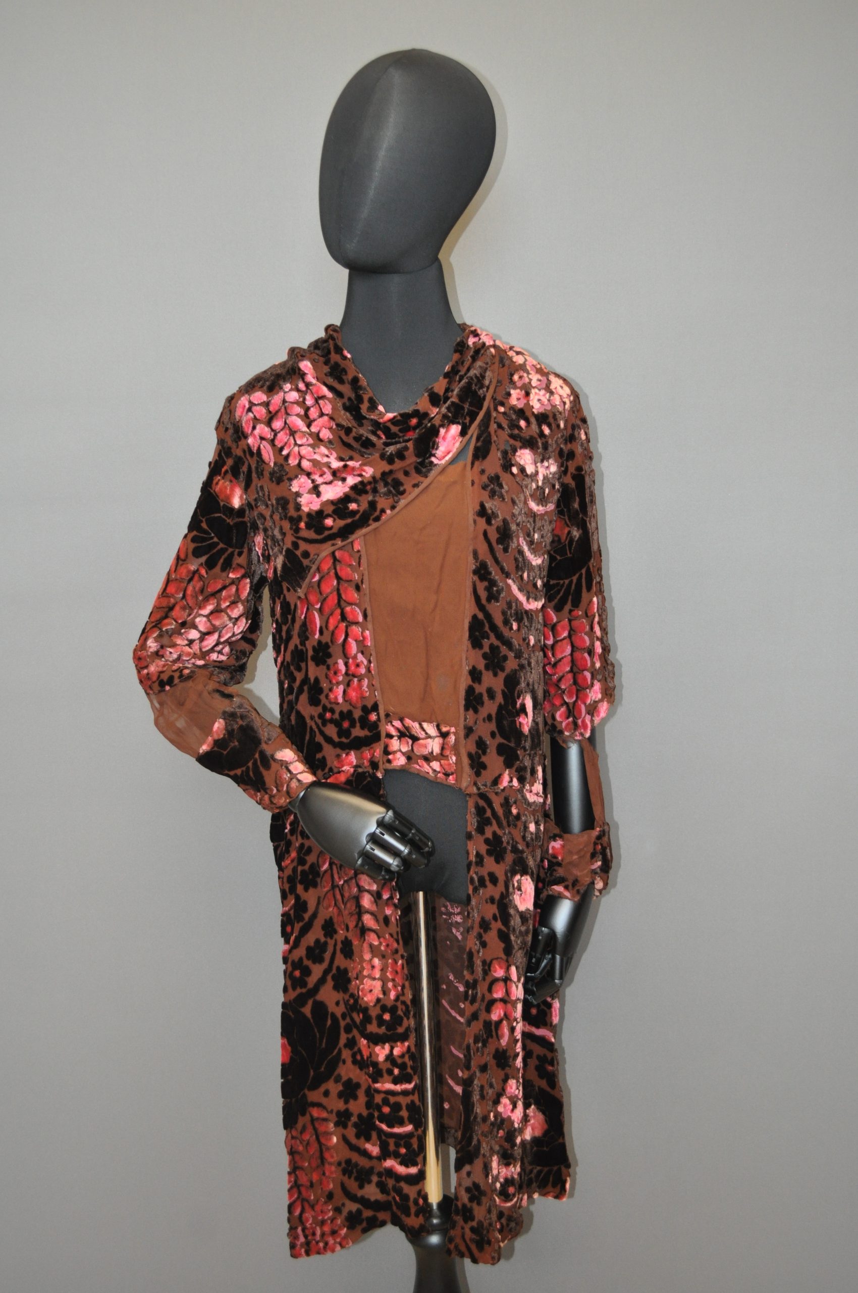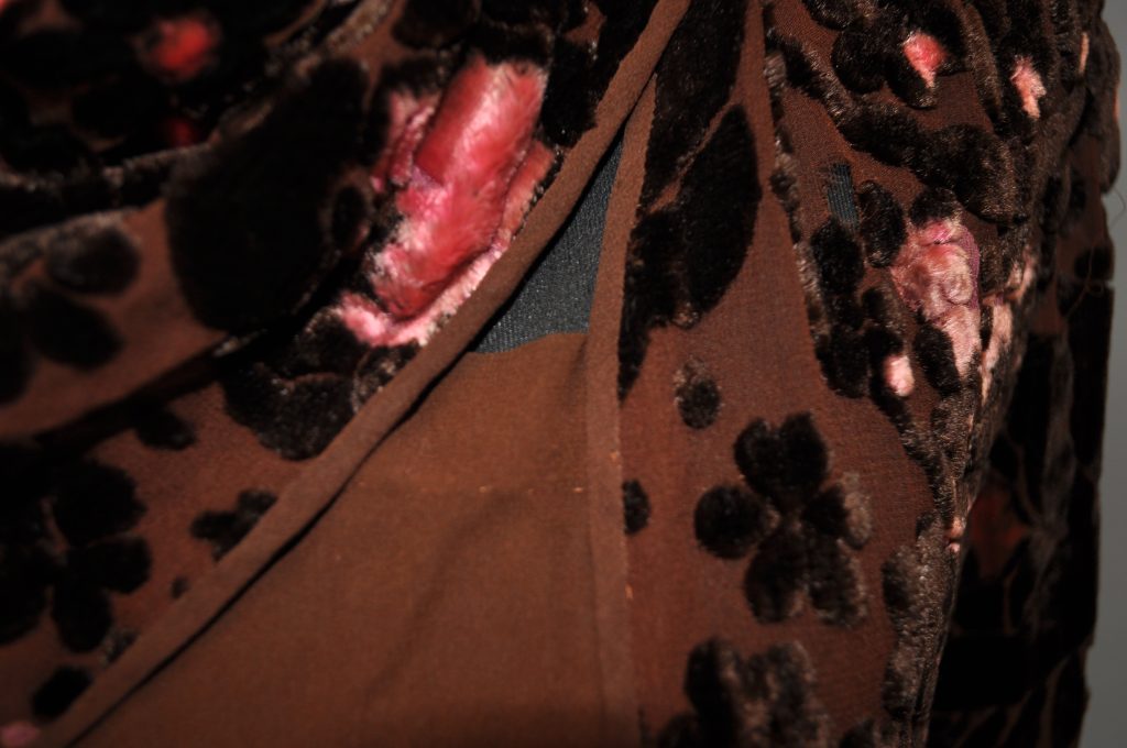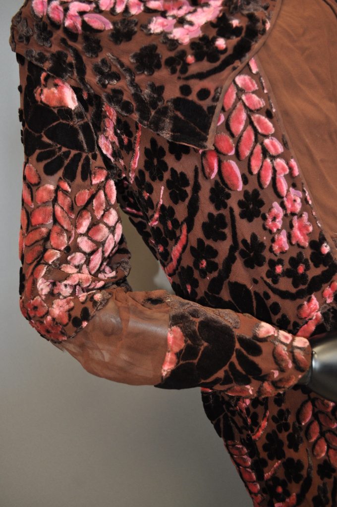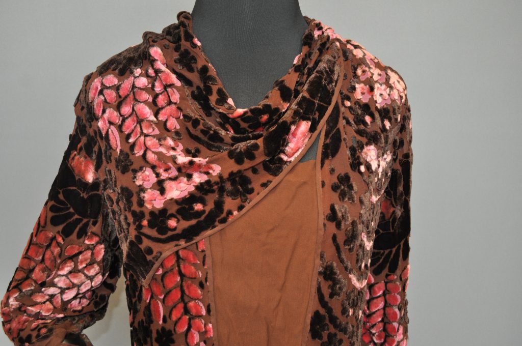 Brown and pink burnout velvet with chiffon backing. Dress overlay with long sleeves and neck swag attached with snap at left shoulder.