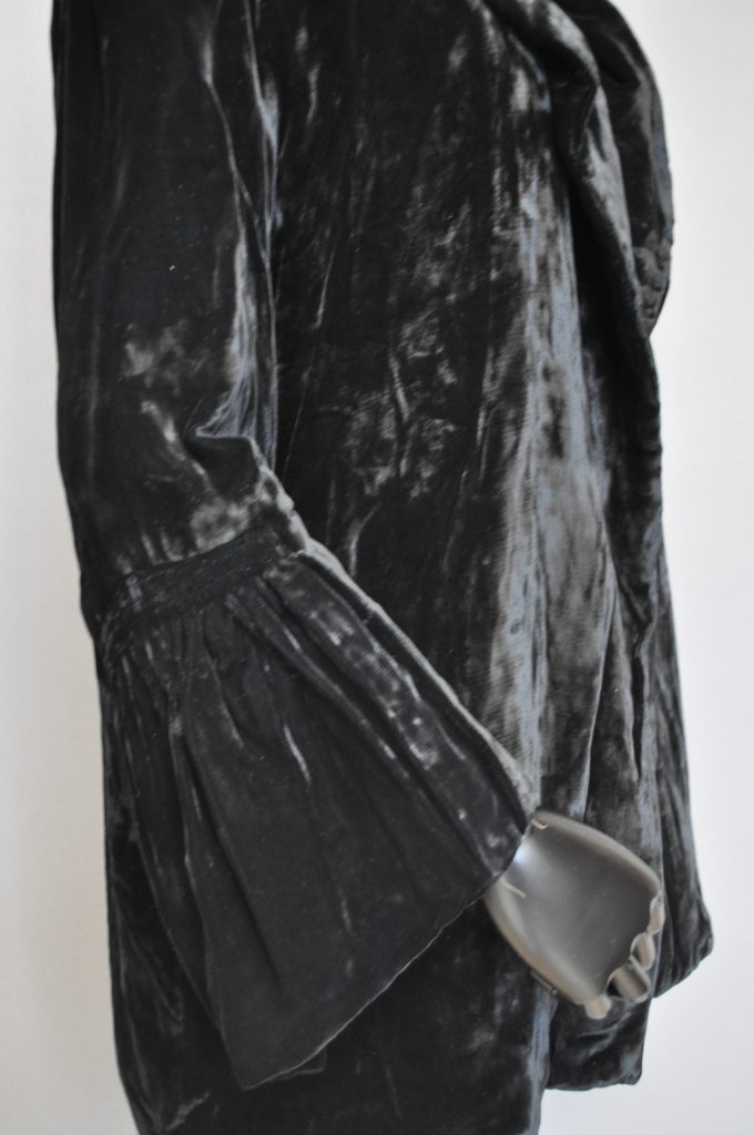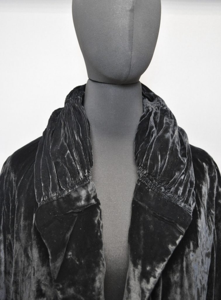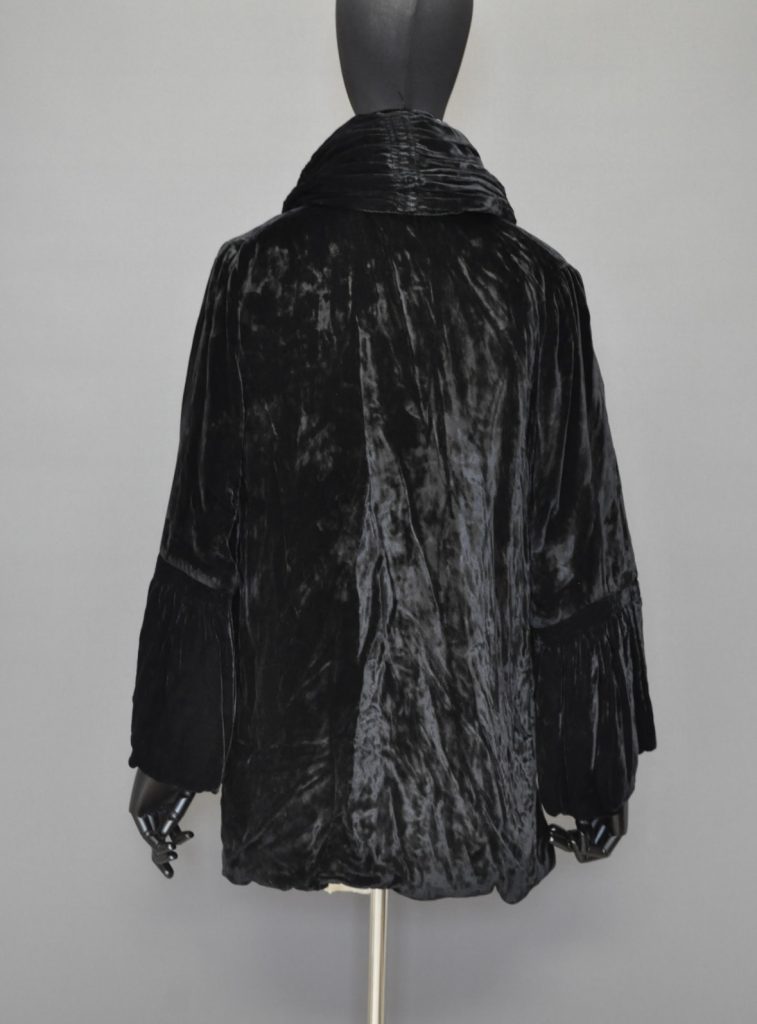 Hip-length black fur coat with cream flannel interlining and (damaged) silk lining. Rushed shawl collar and decorative gathered cuffs