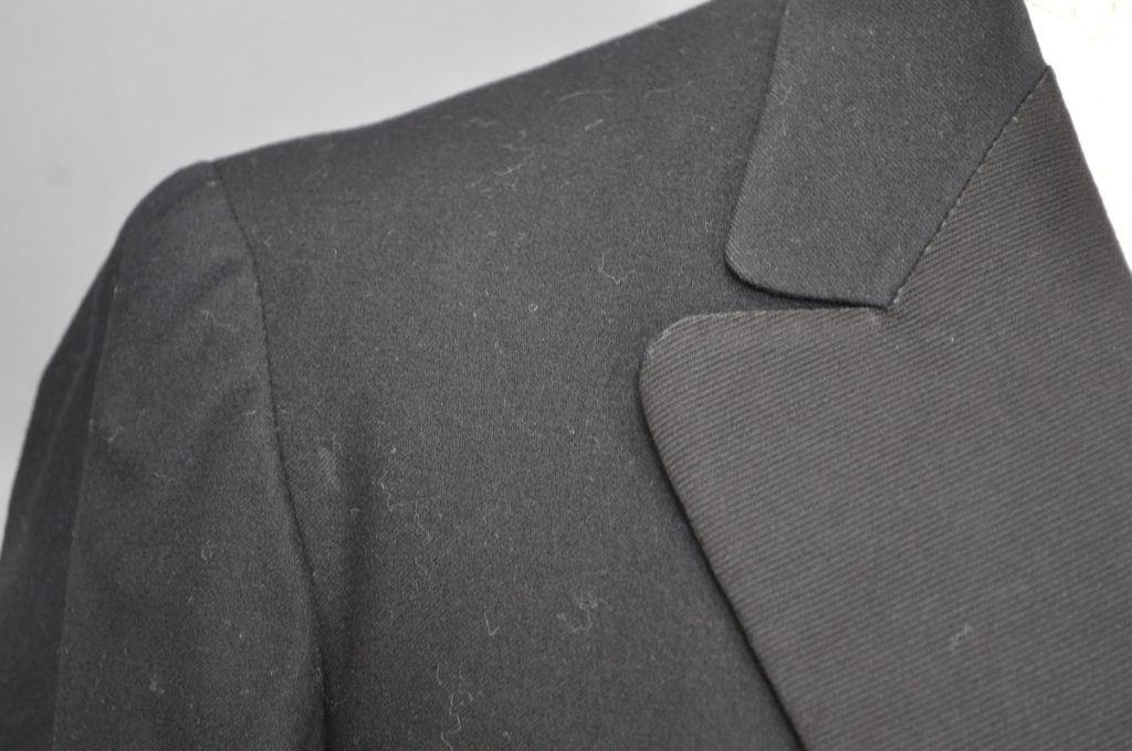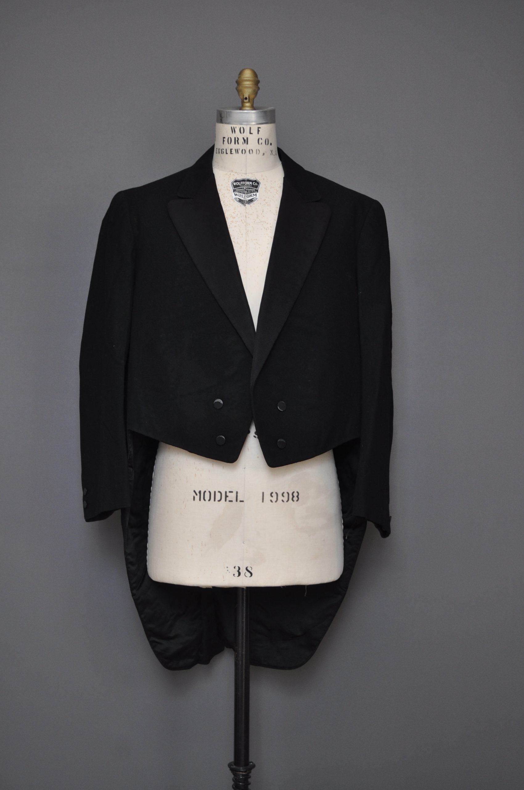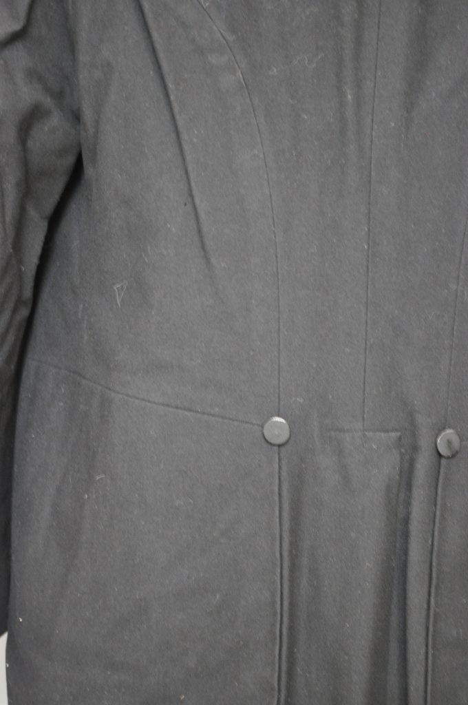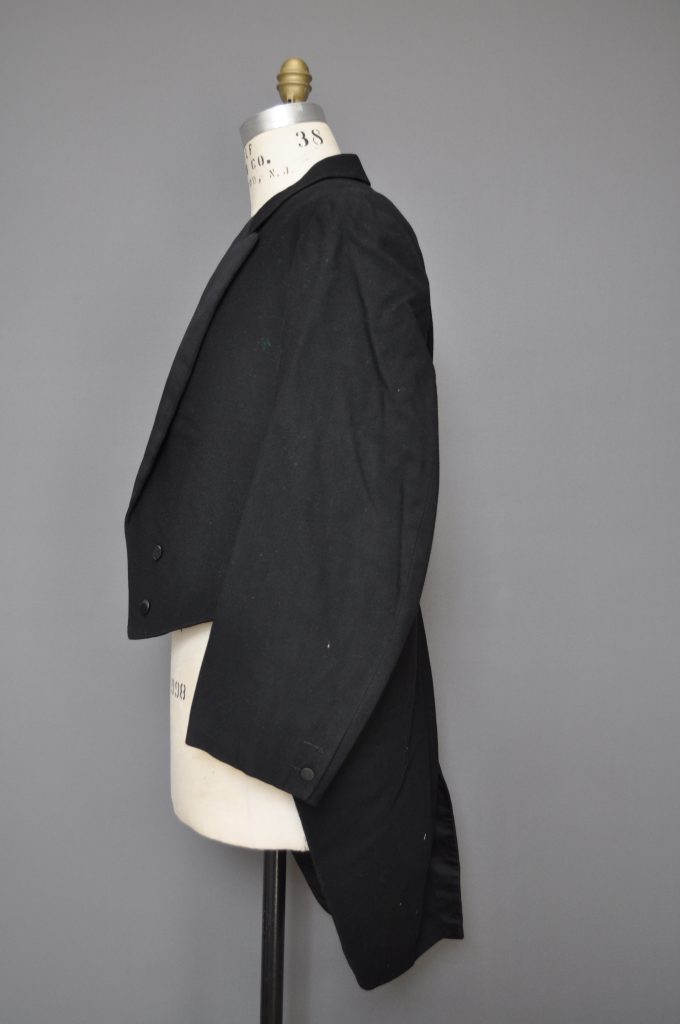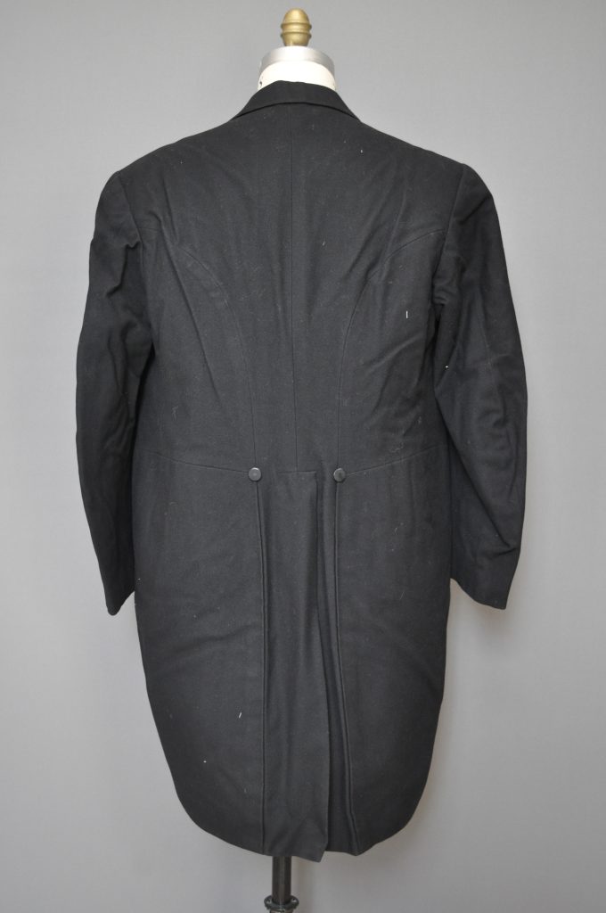 black wool men’s tailcoat with peaked lapel. Fabric covered metal buttons at waist and cuffs. Cream lining missing from right sleeve. Black satin lining.