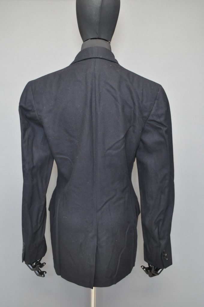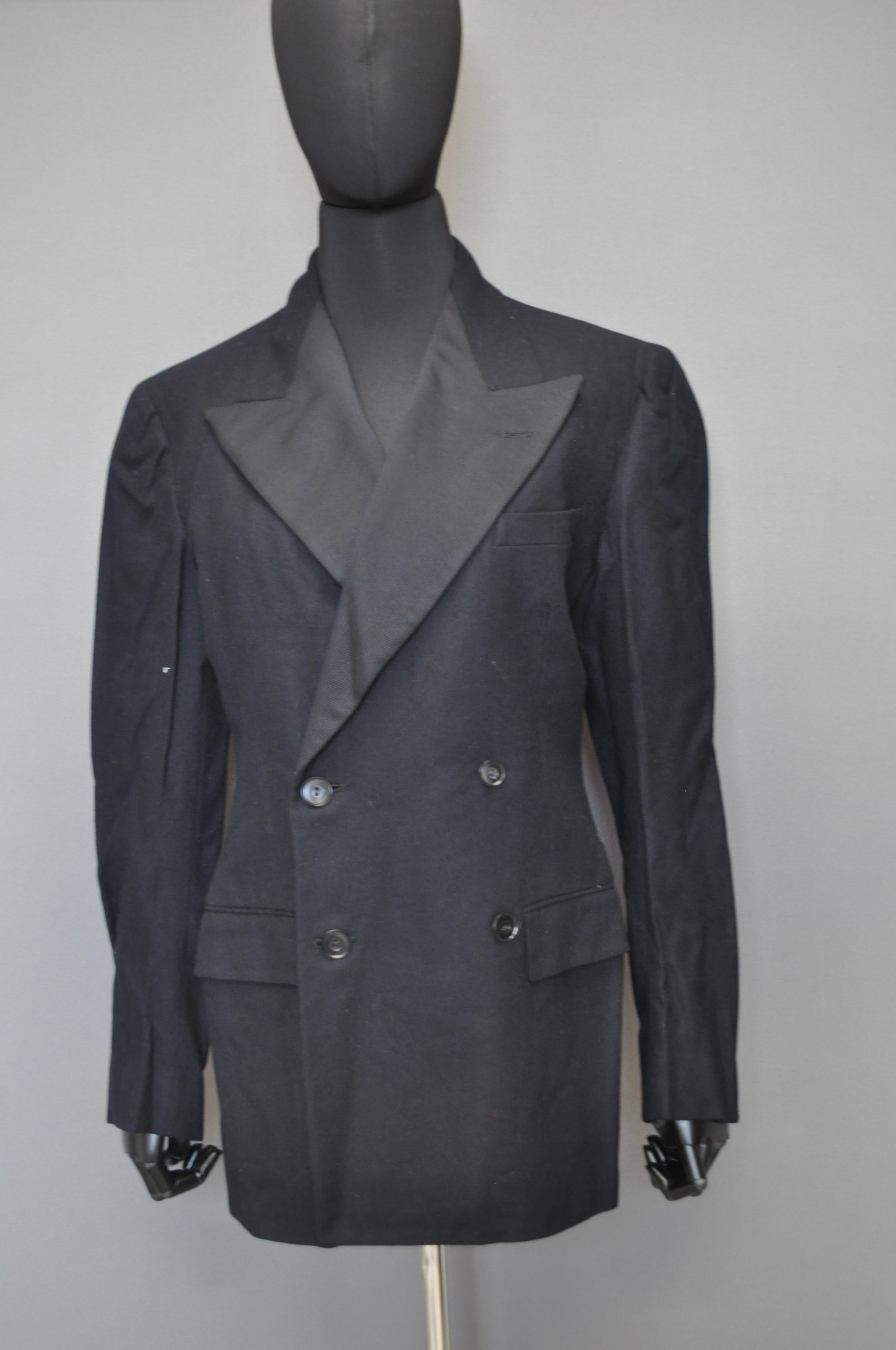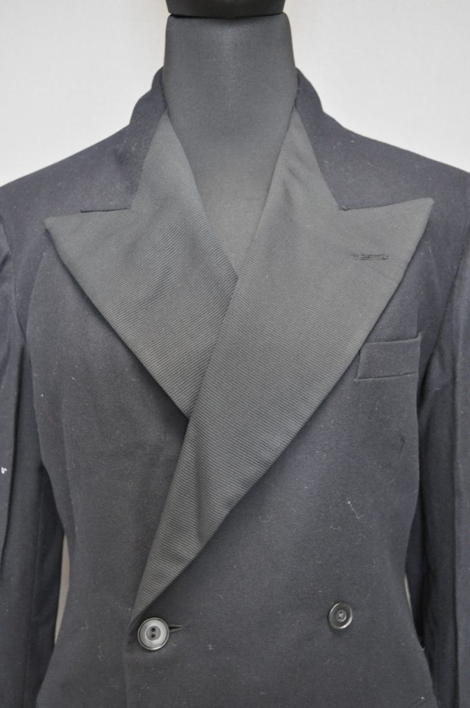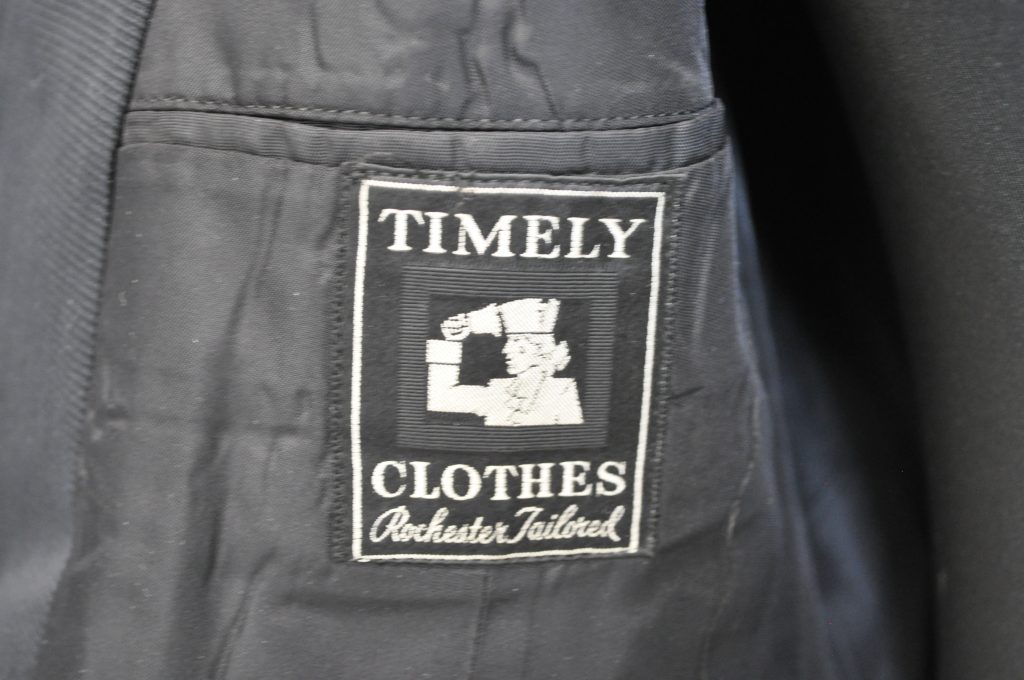 Navy blue men’s wool jacket with double-breasted front and ottoman peaked lapels. The jacket is half lined with Hong Kong binding CB. The label reads “timely Clothes: Rochester Tailored.”