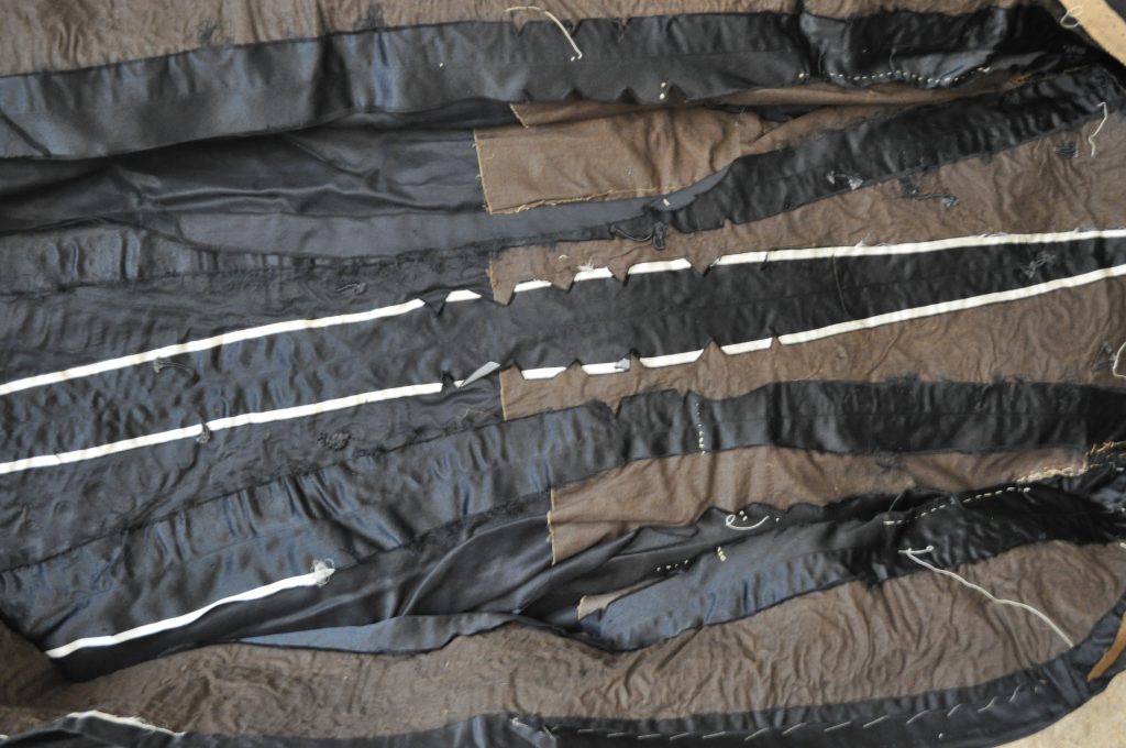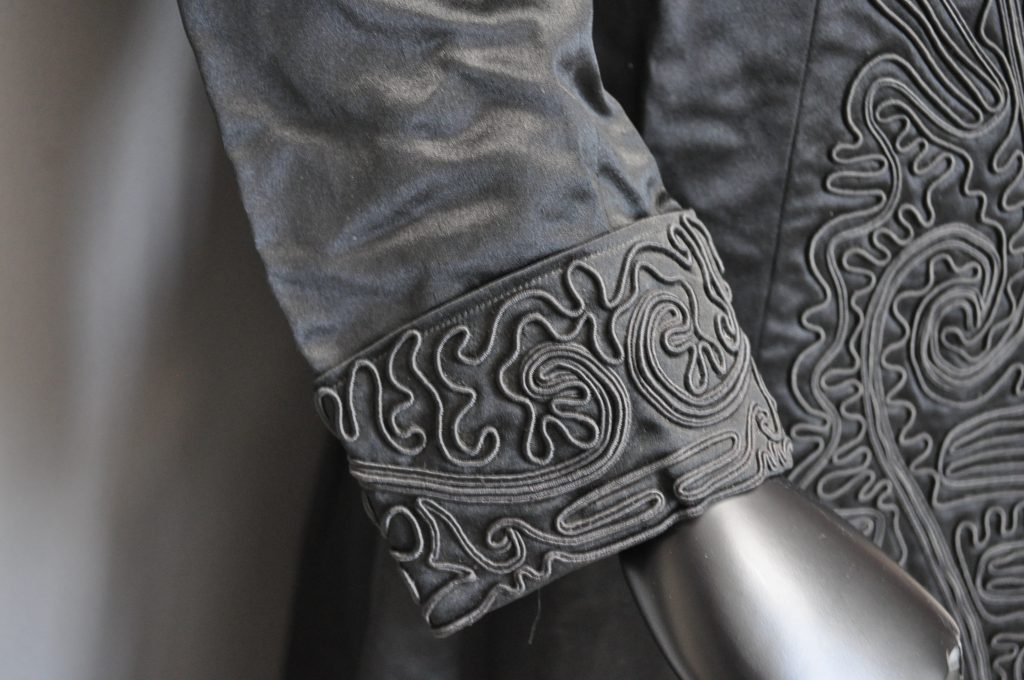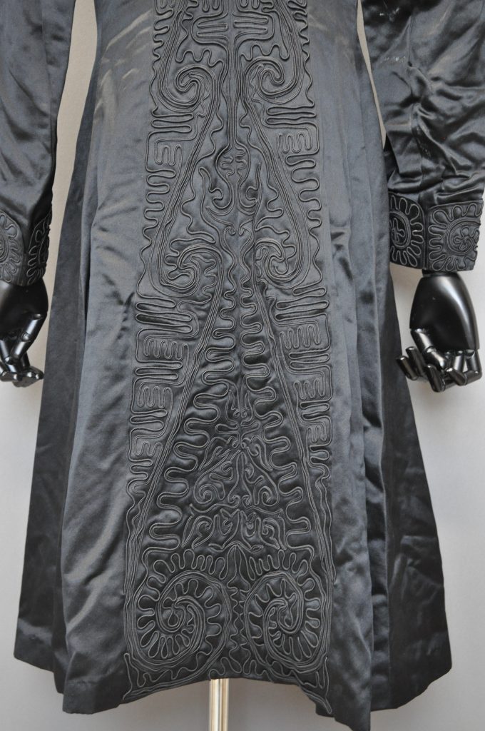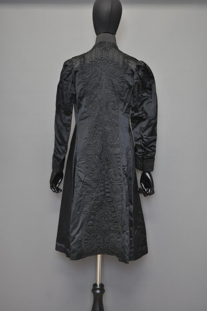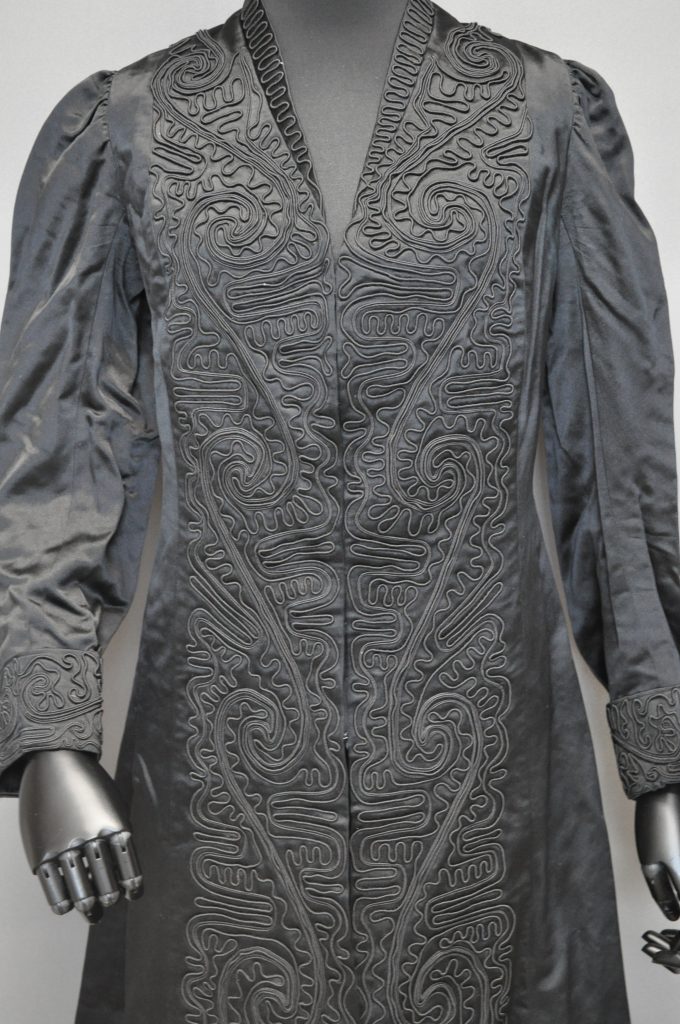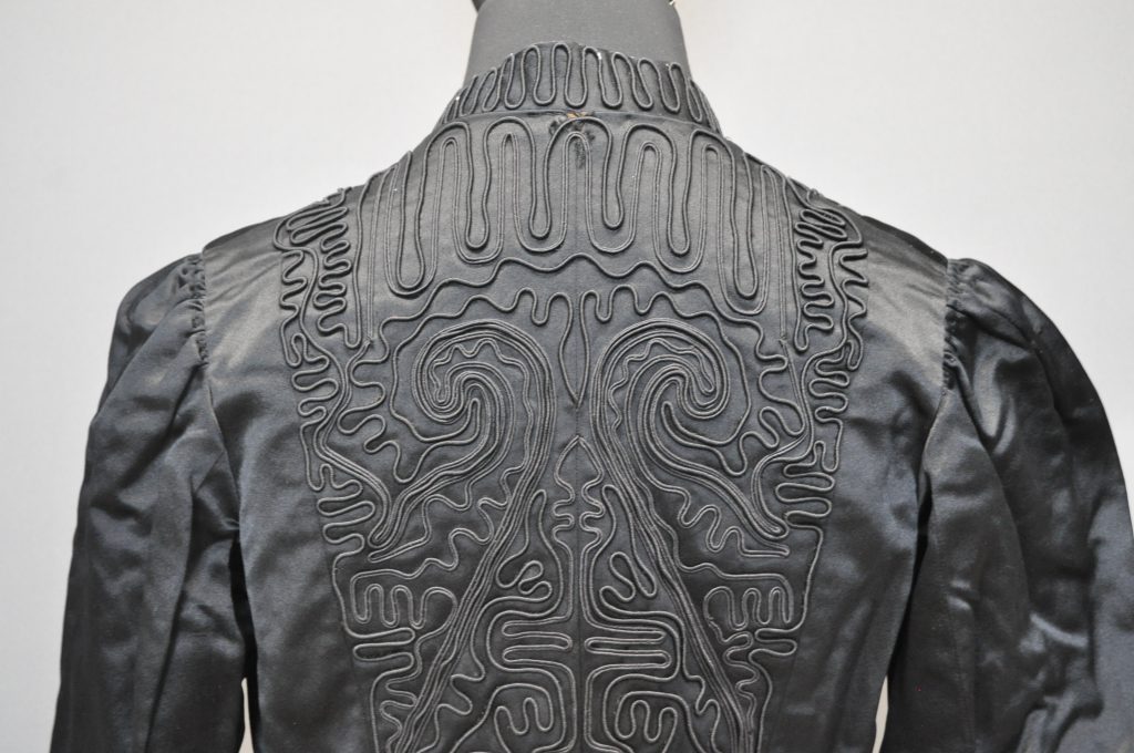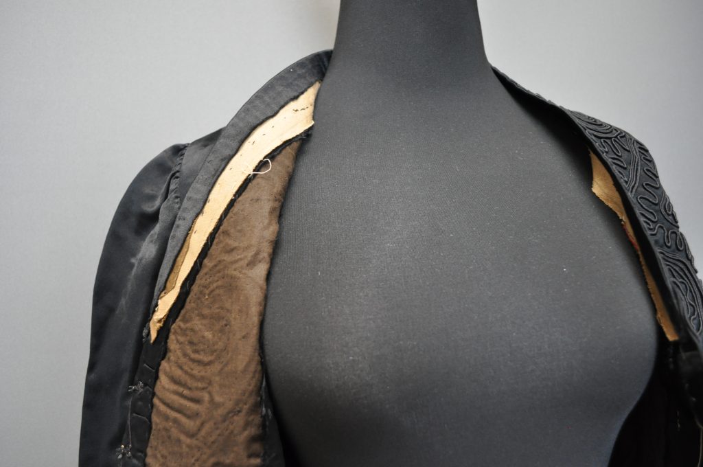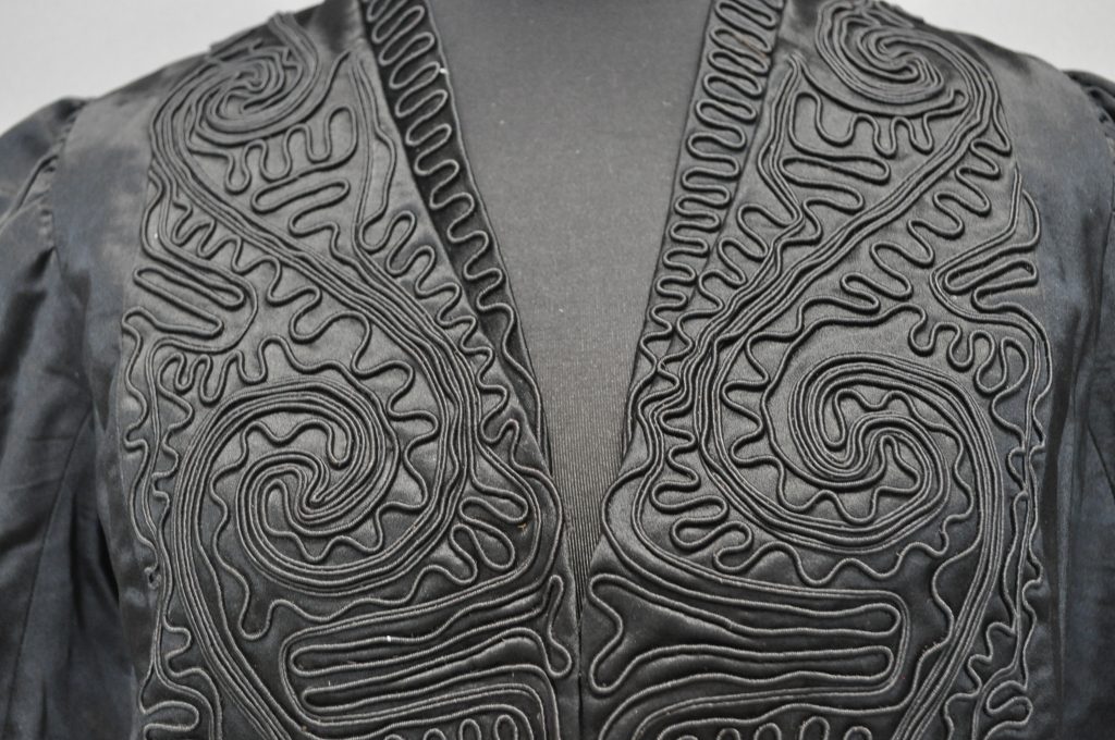 Black satin rouleaux-trimmed women’s jacket. Internal lining of brown cotton. canvas lining at collar visible. Trim down the entire CF, CB, and cuffs. two-piece sleeves.