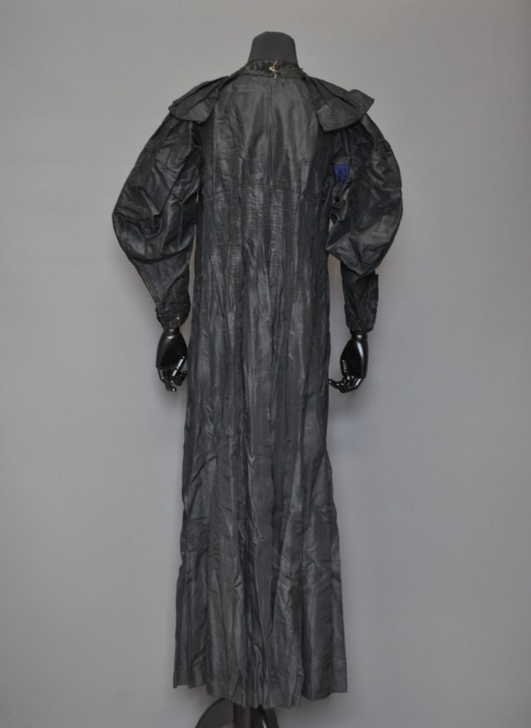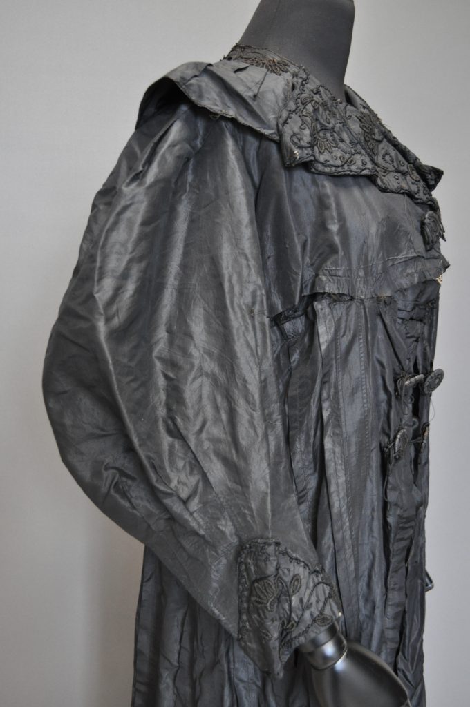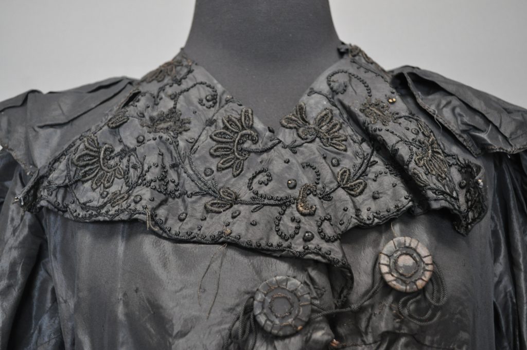 Black taffeta outer gown/ jacket with leg of mutton sleeves and embordered cuffs and collar. empire waist with three layers of buttons attached with cording. Bias- bound seams in skirt and 1 in vertical pleats. The bodice is constructed using internal canvas.