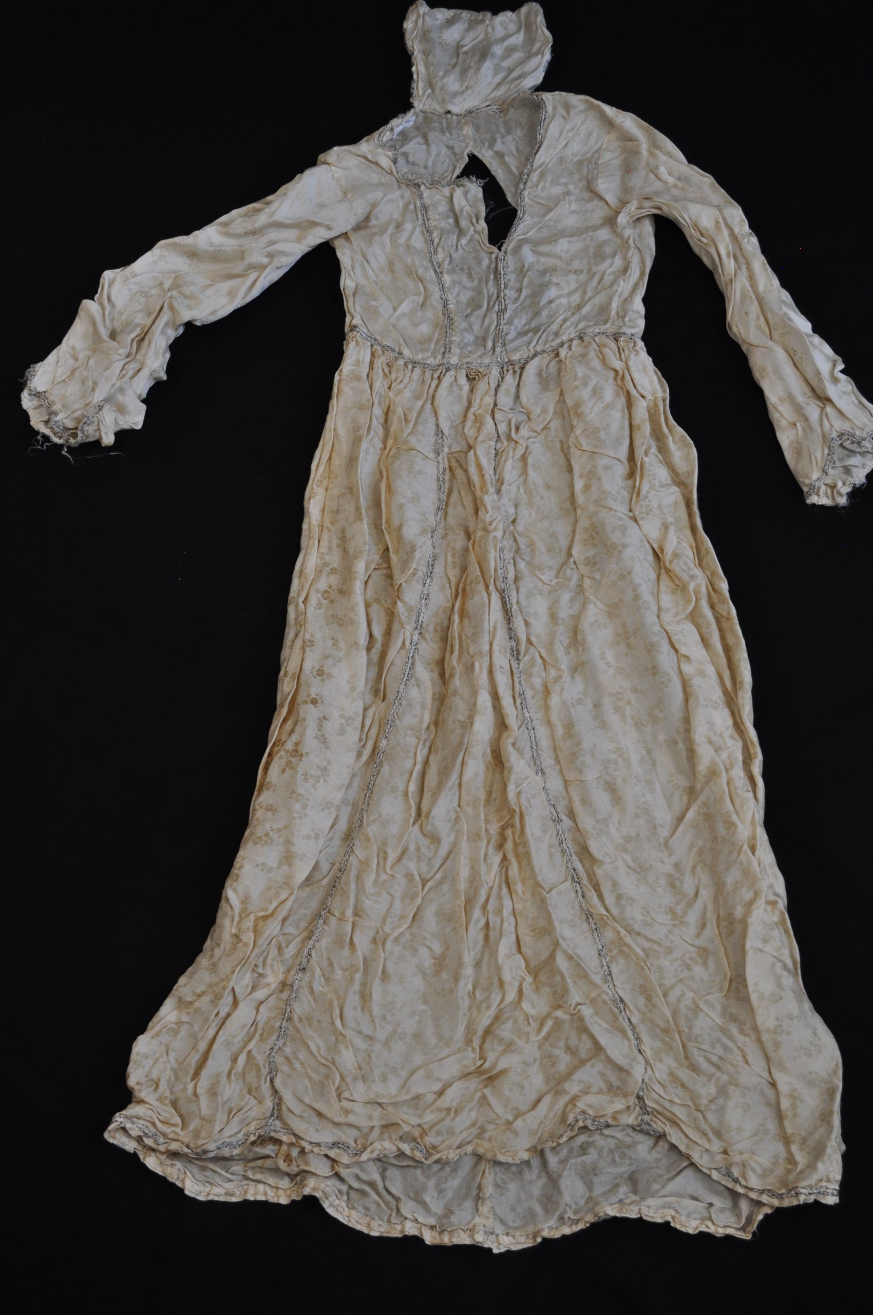 Full-length dress (possibly a theater costume?) with trim at the center front. Snap closure at back waist.