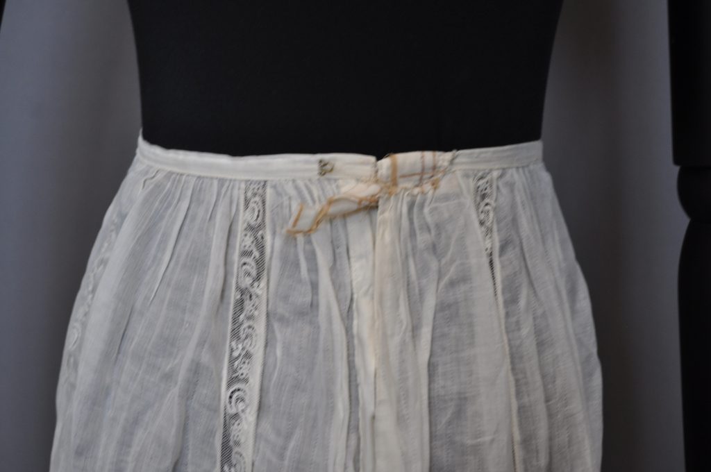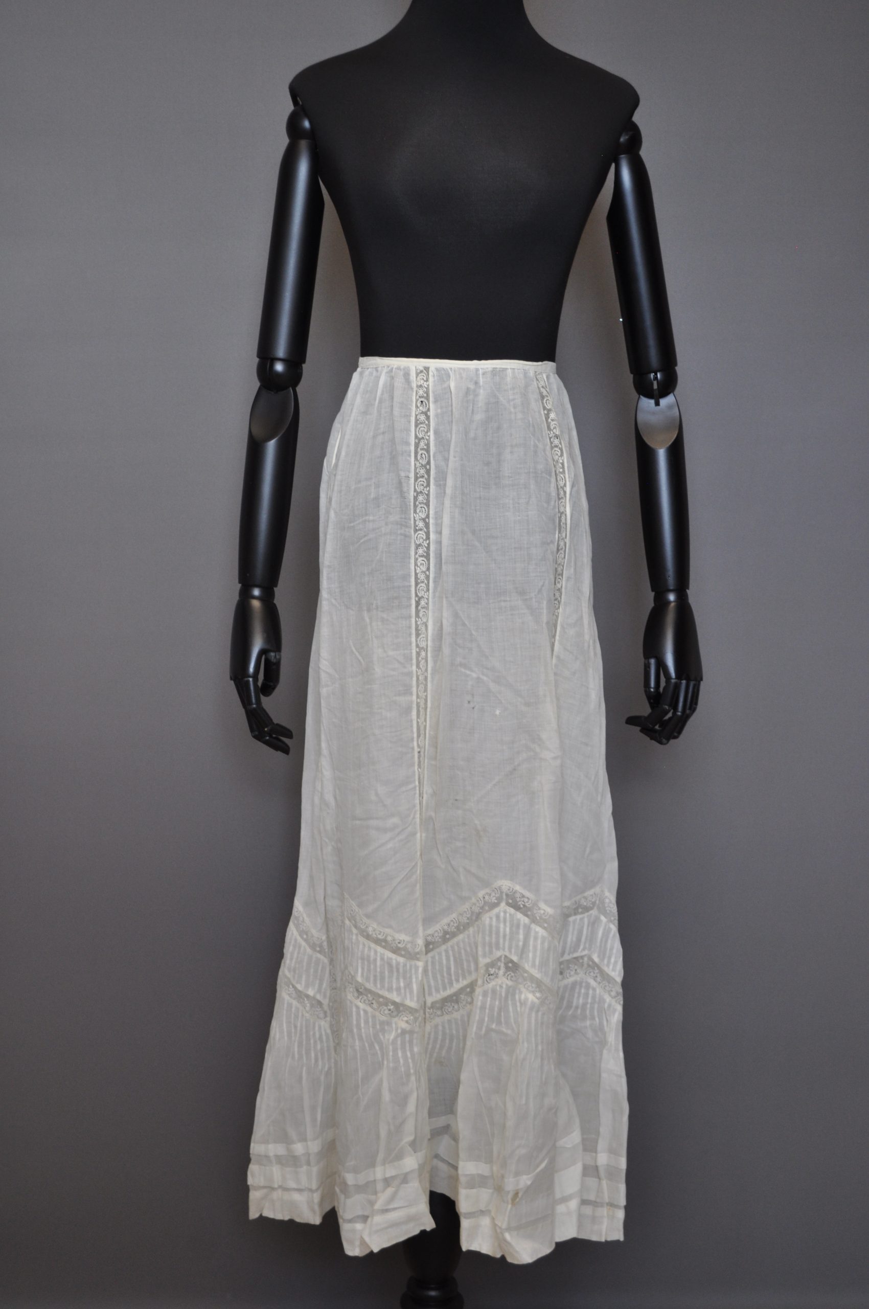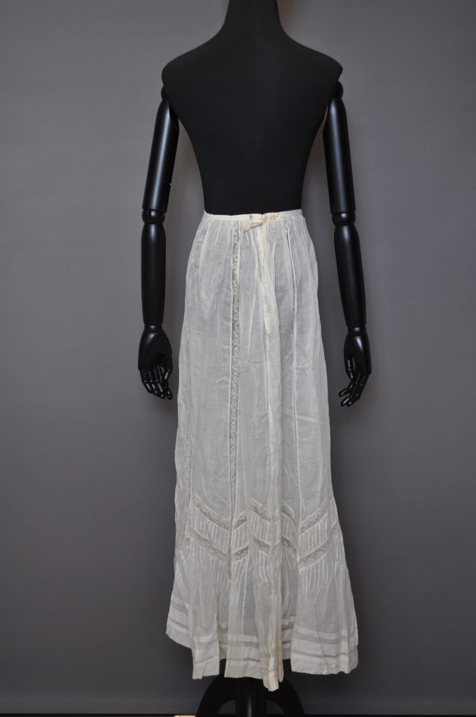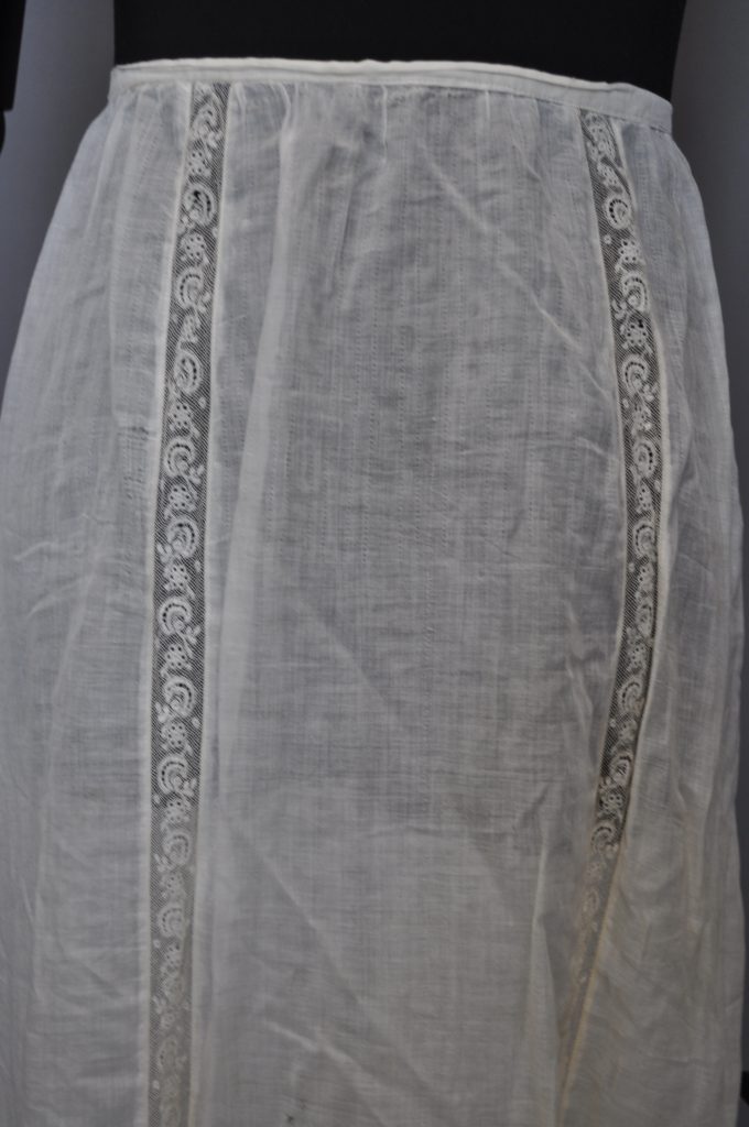 cotton petticoat with CB hook and eye closure. Horizontal tucks at hem, Decorative lace insertion and decoarative vertical tucks.