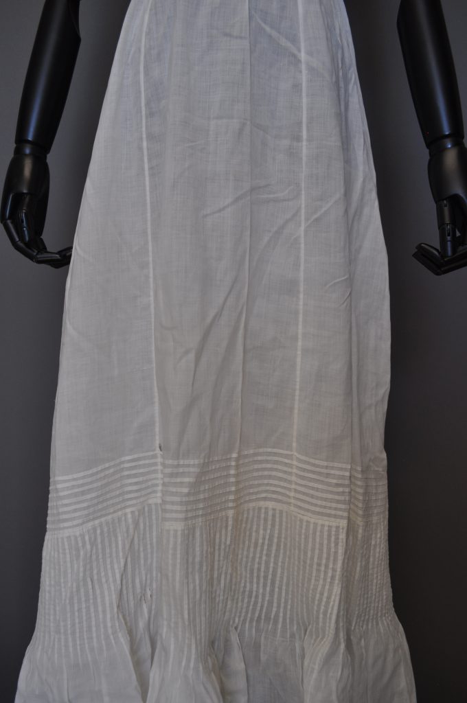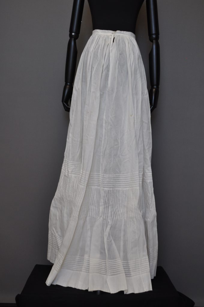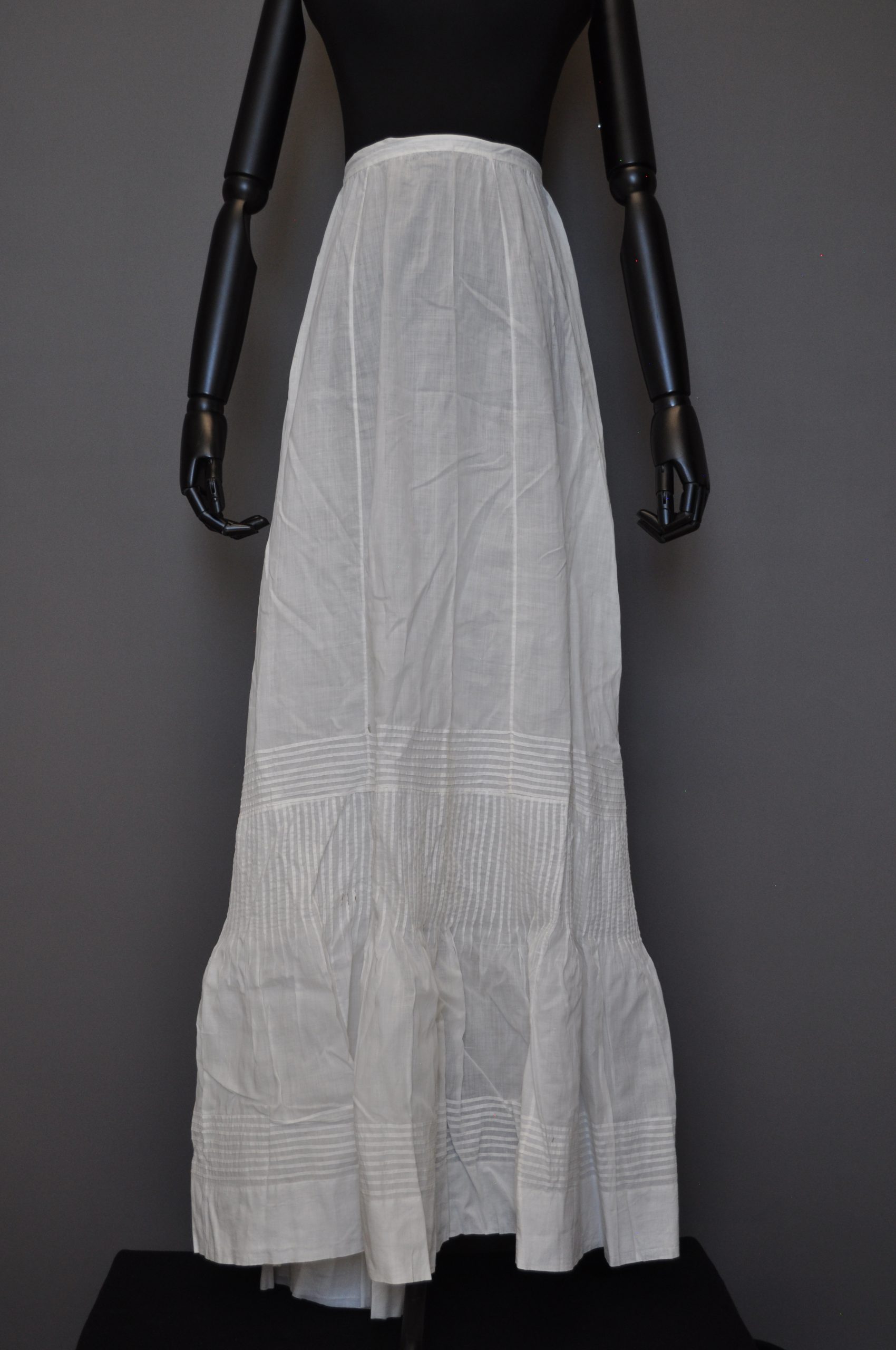 Linen/ cotton paneled petticoat with gathered CB and CB hook closure. Decorative tucks at the lower end of the skirt.
