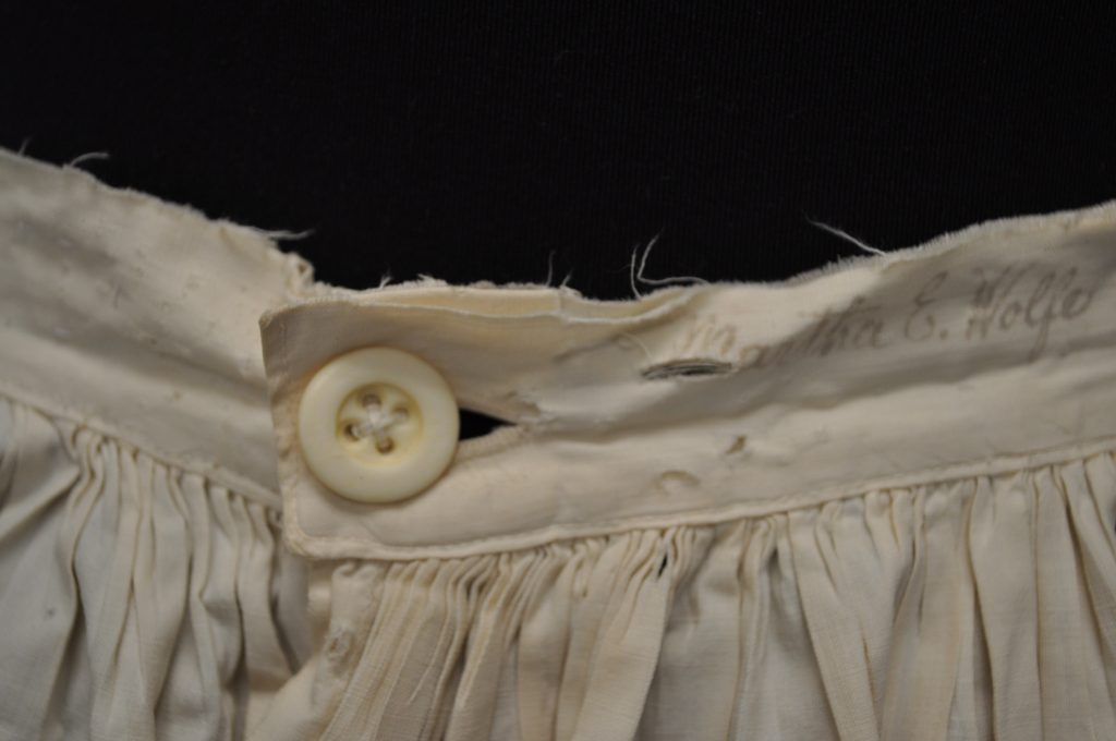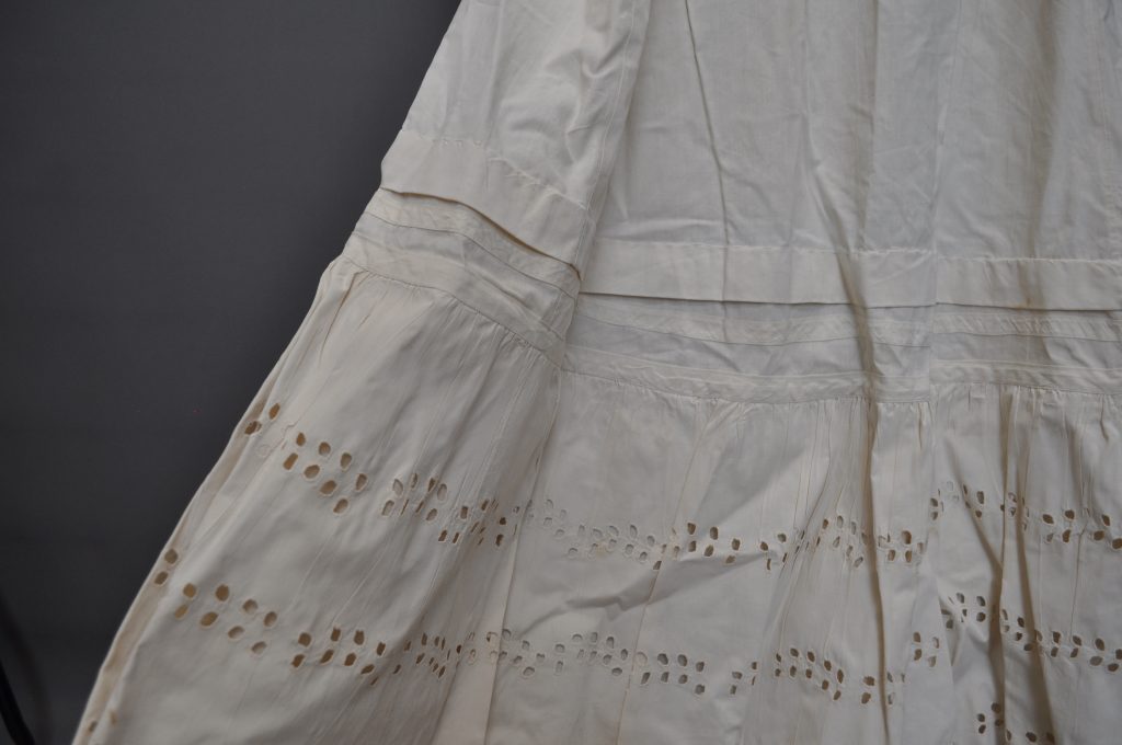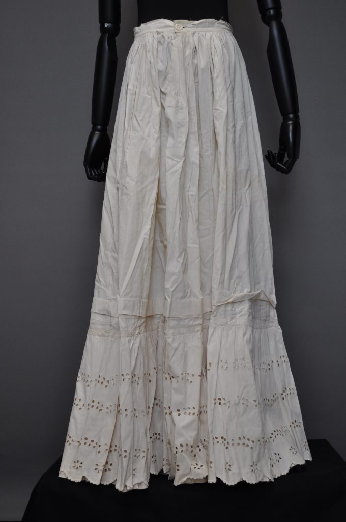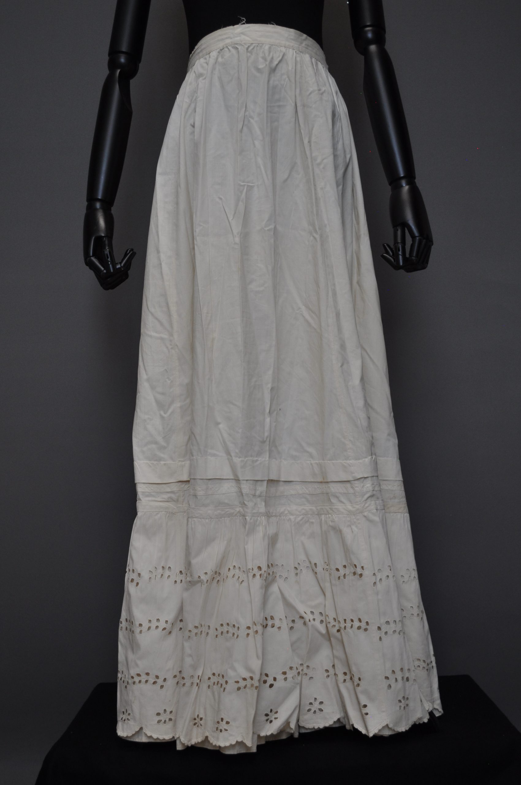 Linen/ cotton petticoat with paneled front and gathering at back. Horizontal tucks and ruffle with eyelette lace at the bottom.
