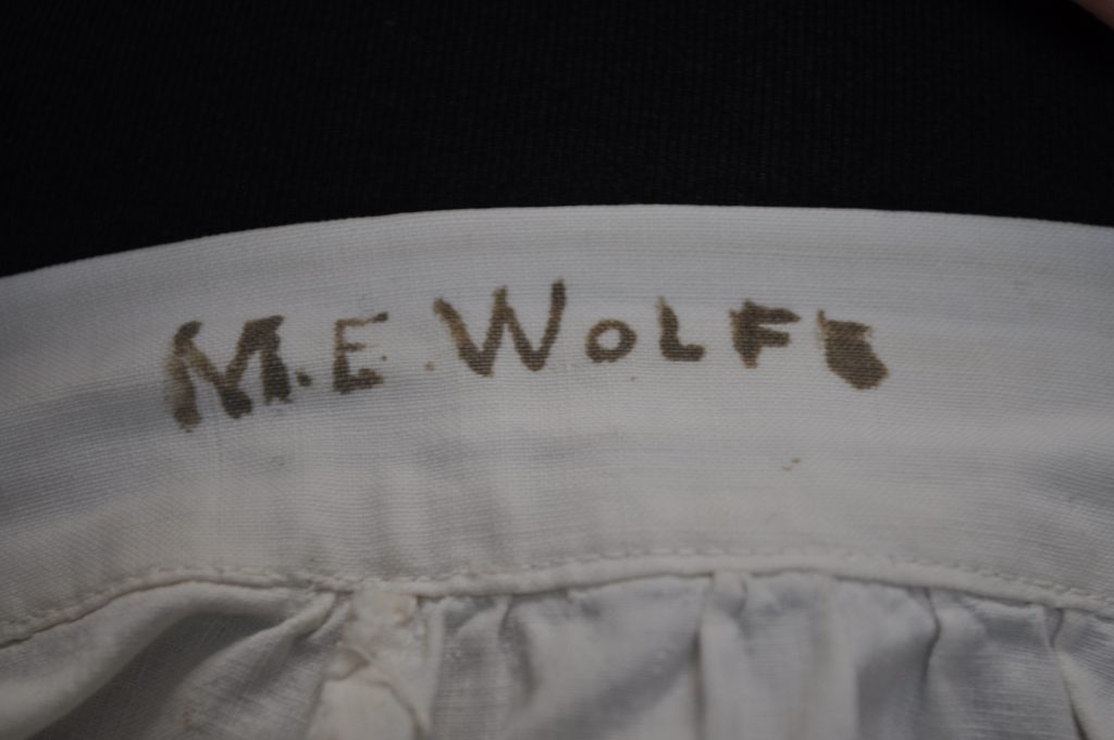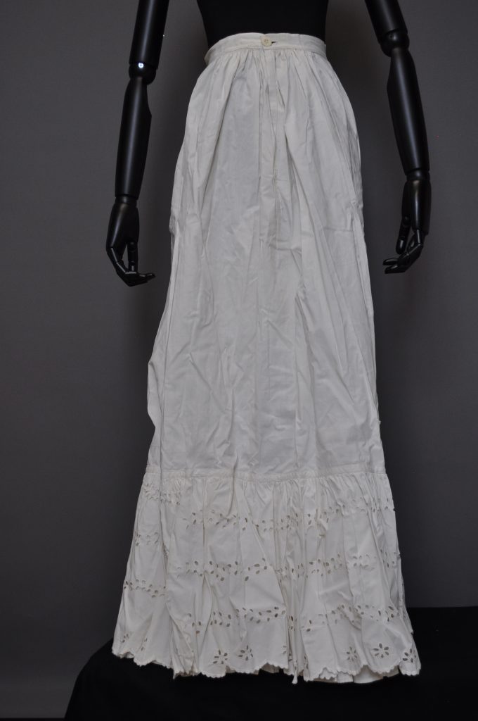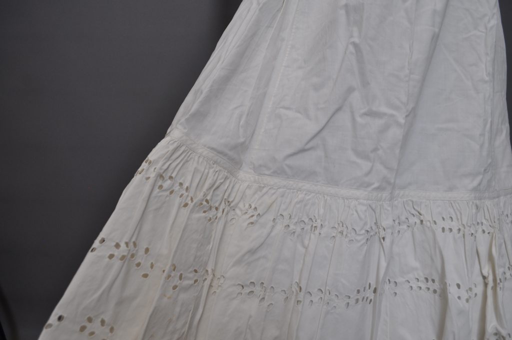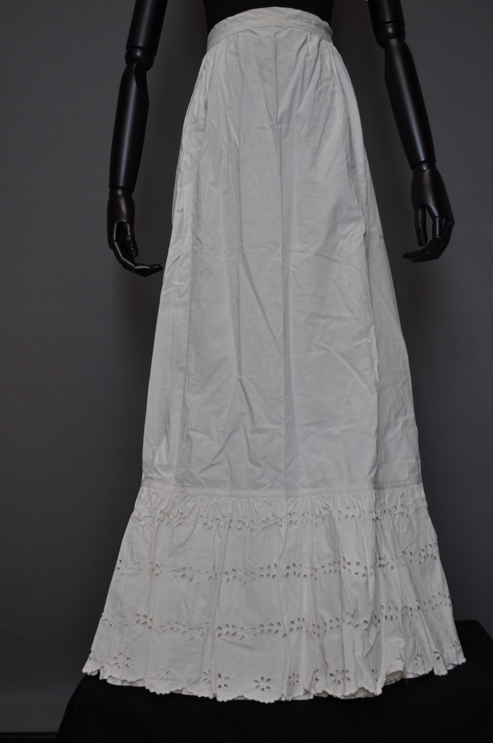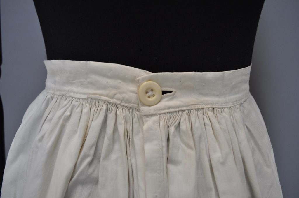 White linen/cotton petticoat with a paneled front and gathered center back. ruffle of eyelette lace at the bottom. Initials inked into waistband “M.E. Wolfe”.
