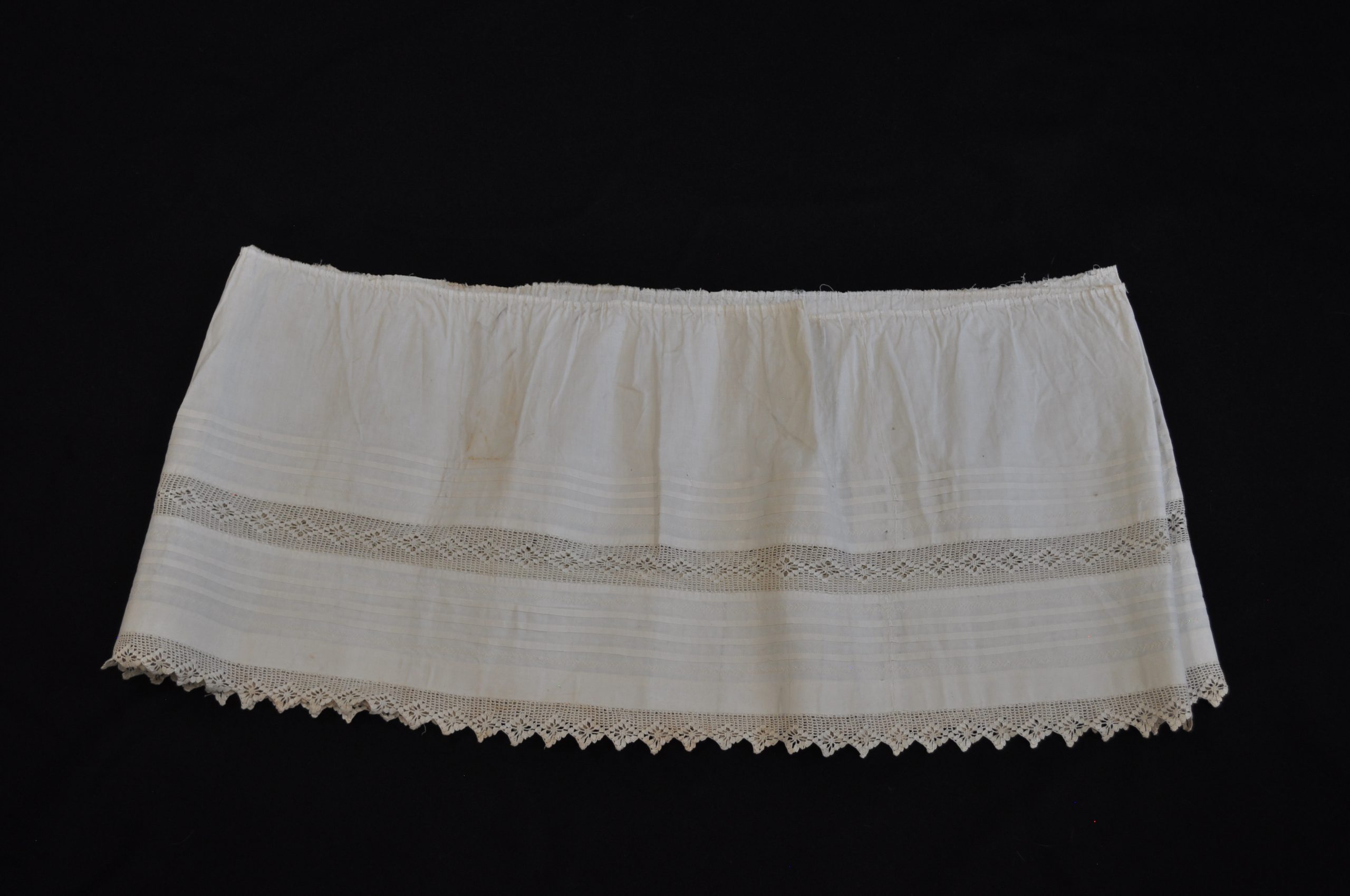 Length of fabric (removed tier of petticoat) with lace inserted and at hem. vertical tucks and embroidery.