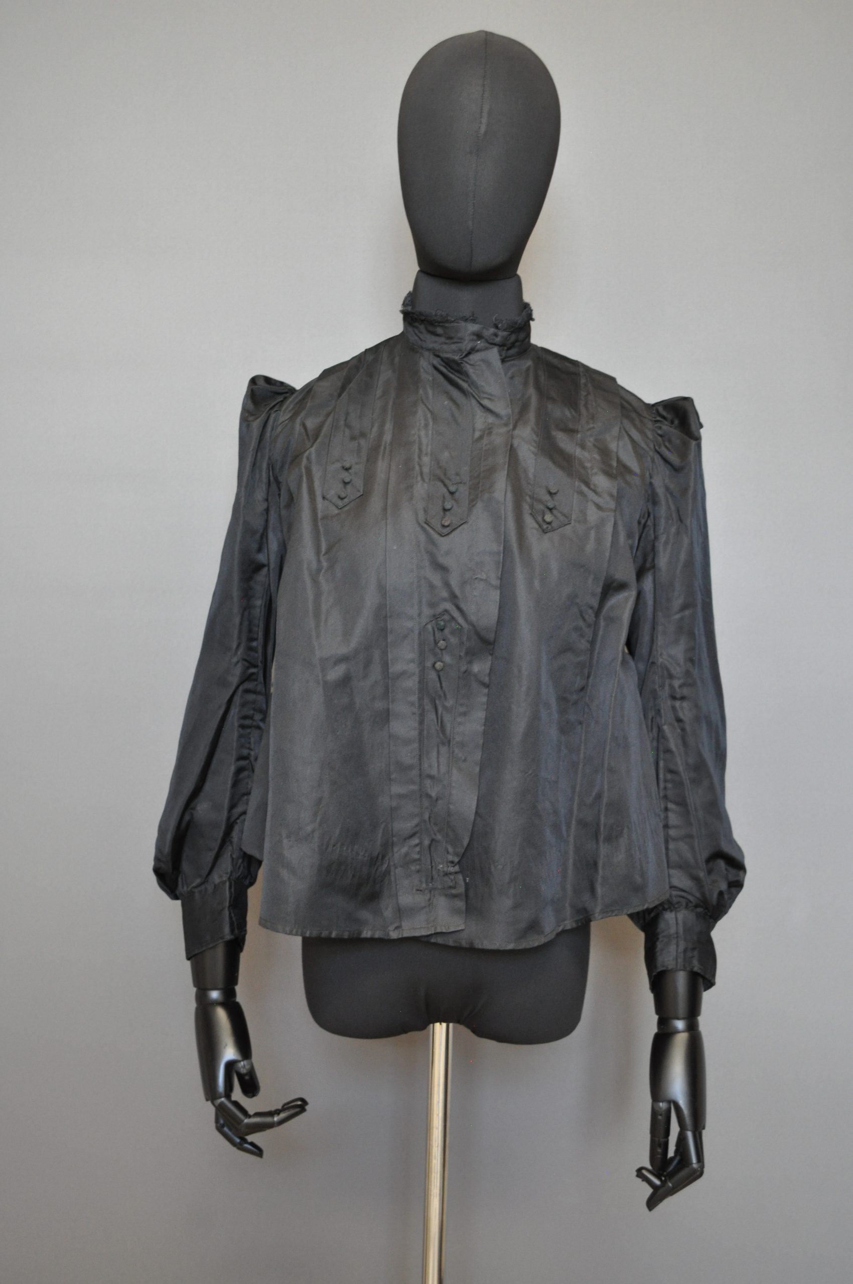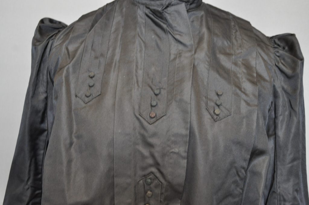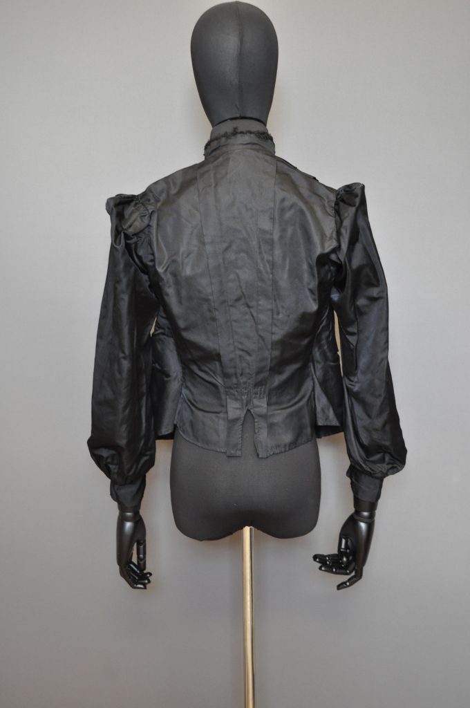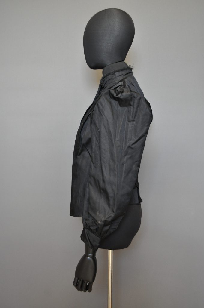 Black silk bodice with light brown polished cotton lining. CF hook closure. high neck and long sleeves. Decorative tucks and arrow-shaped decor on front.