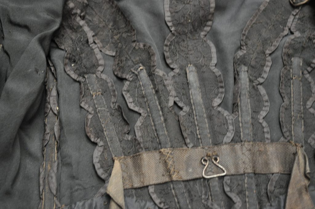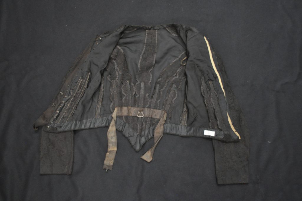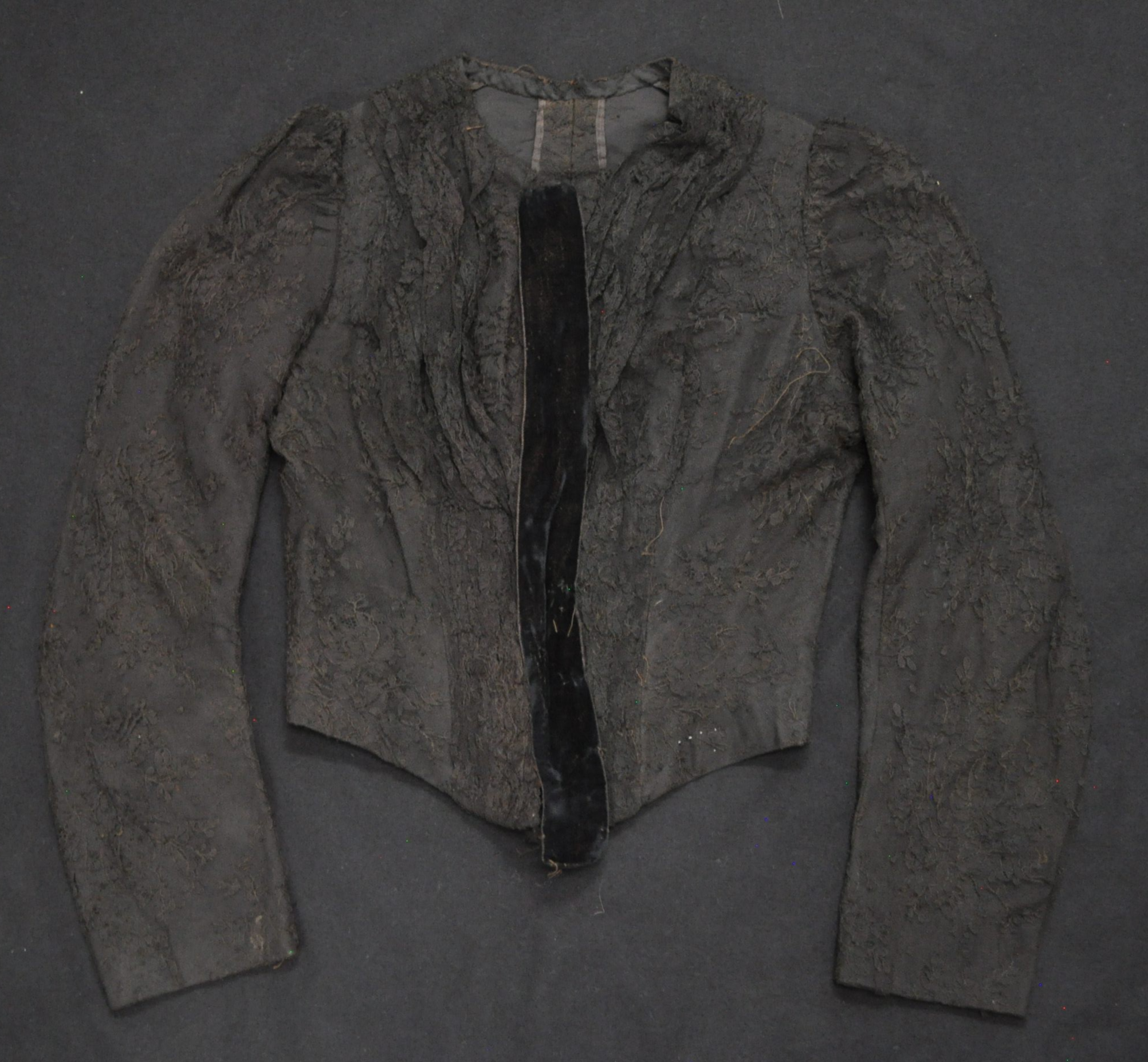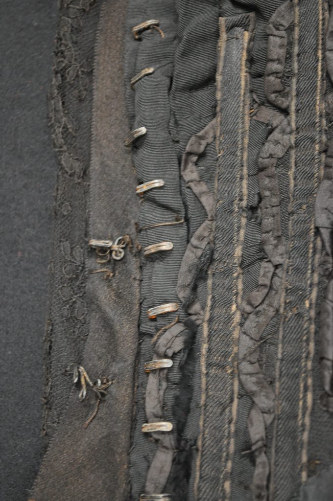 Black Lacke bodice with velvet ribbon down CF. CF hook closure, internal stays, Hong Kong finished SA. Internal waist tape.