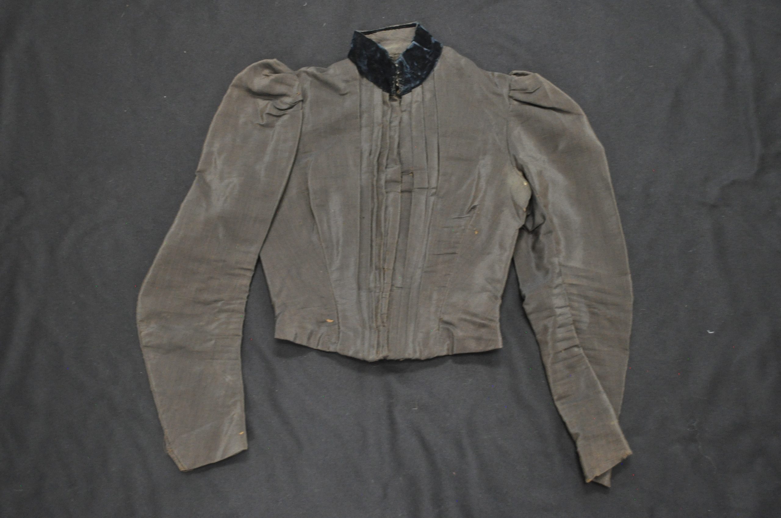 Black/ brown bodice with a CF hook closure. dark blue velvet collar. Light brown, polished cotton lining; internal stays and Hong Kong finished SA. Vertical pleats at the front of the bodice.