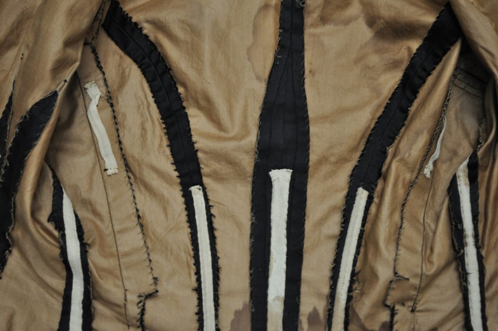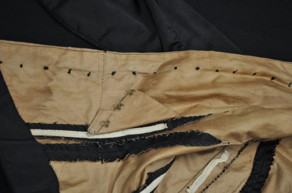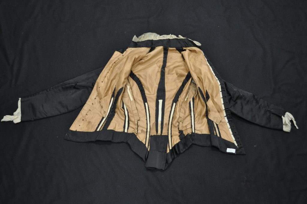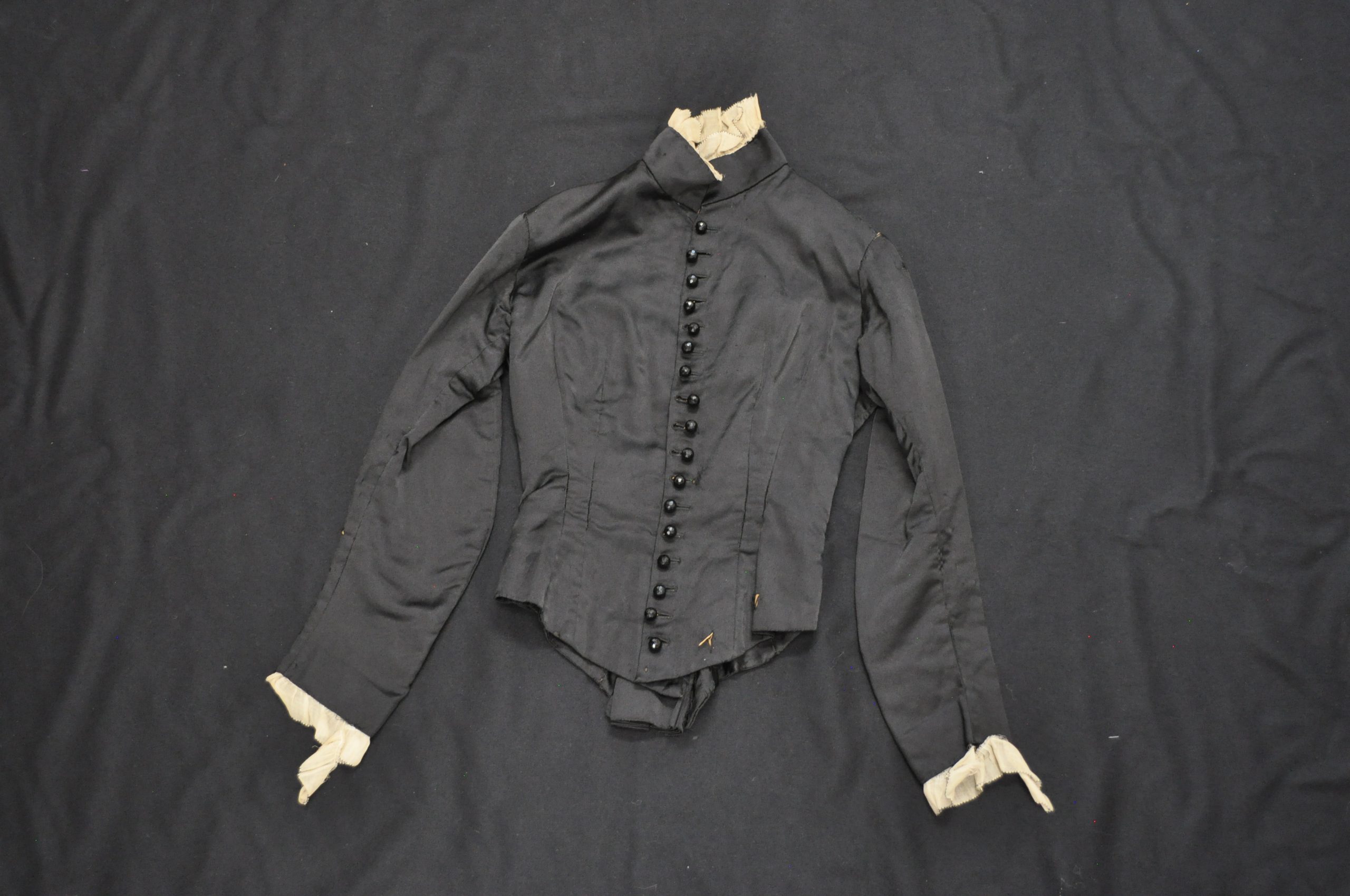 Black silk bodice with CF button closure and decorative Jet buttons. High neck with cream accent at collar and cuffs. Internal stays and fully shaped seaming.