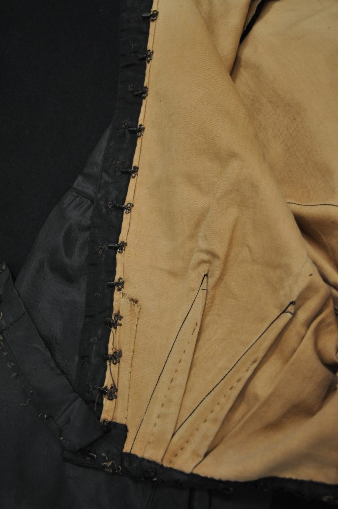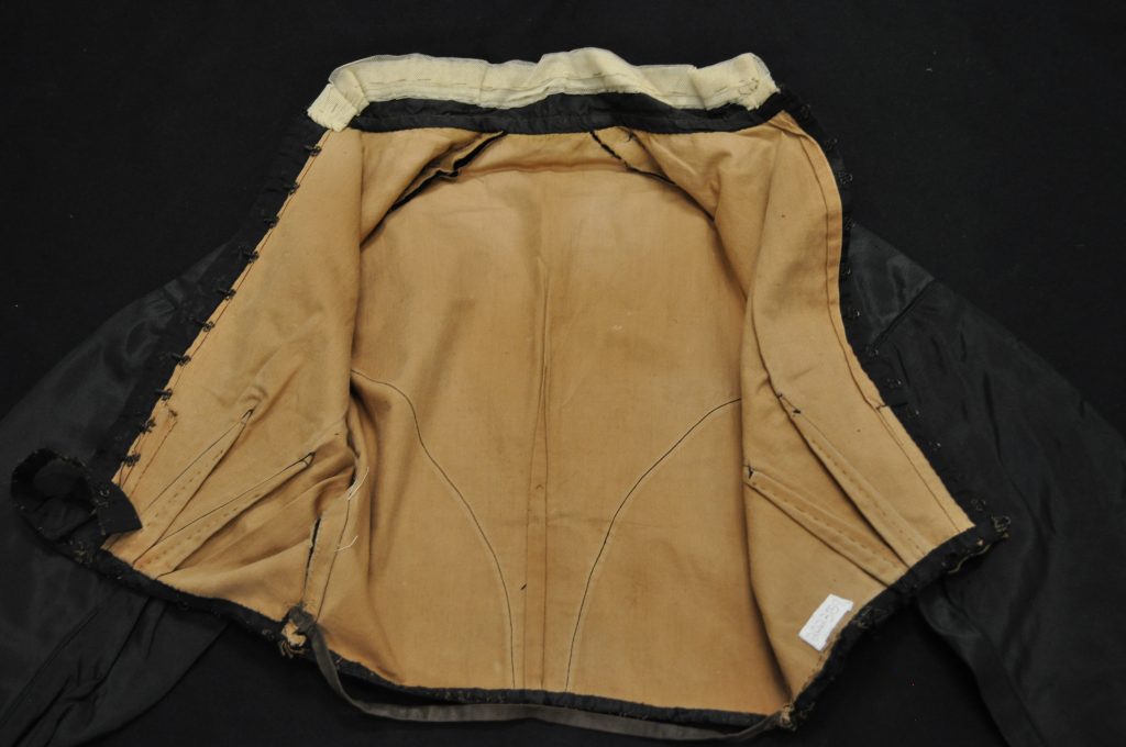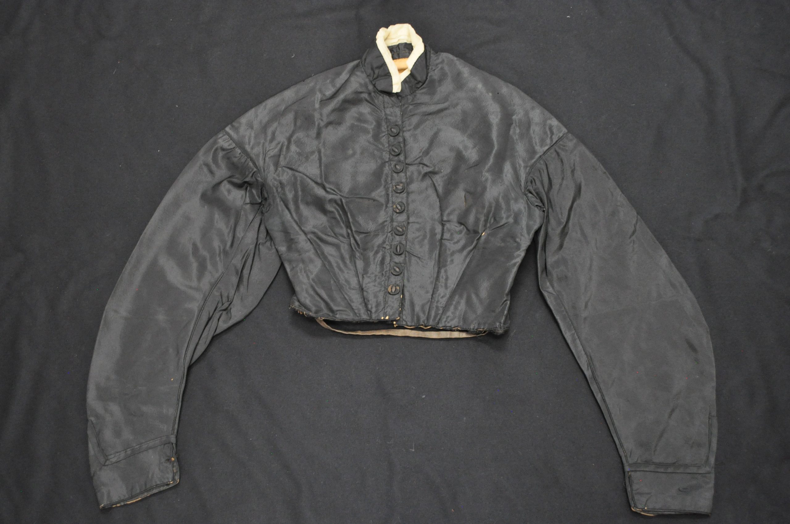 Black silk bodice with CF opening with hooks. Light brown polished cotton lining. Black decorative buttons. High collar with cream netting. 2-piece shaped sleeves.