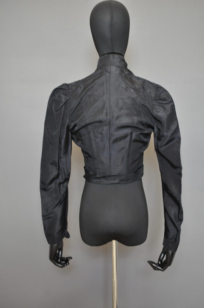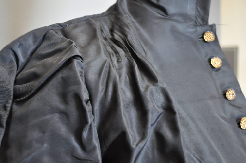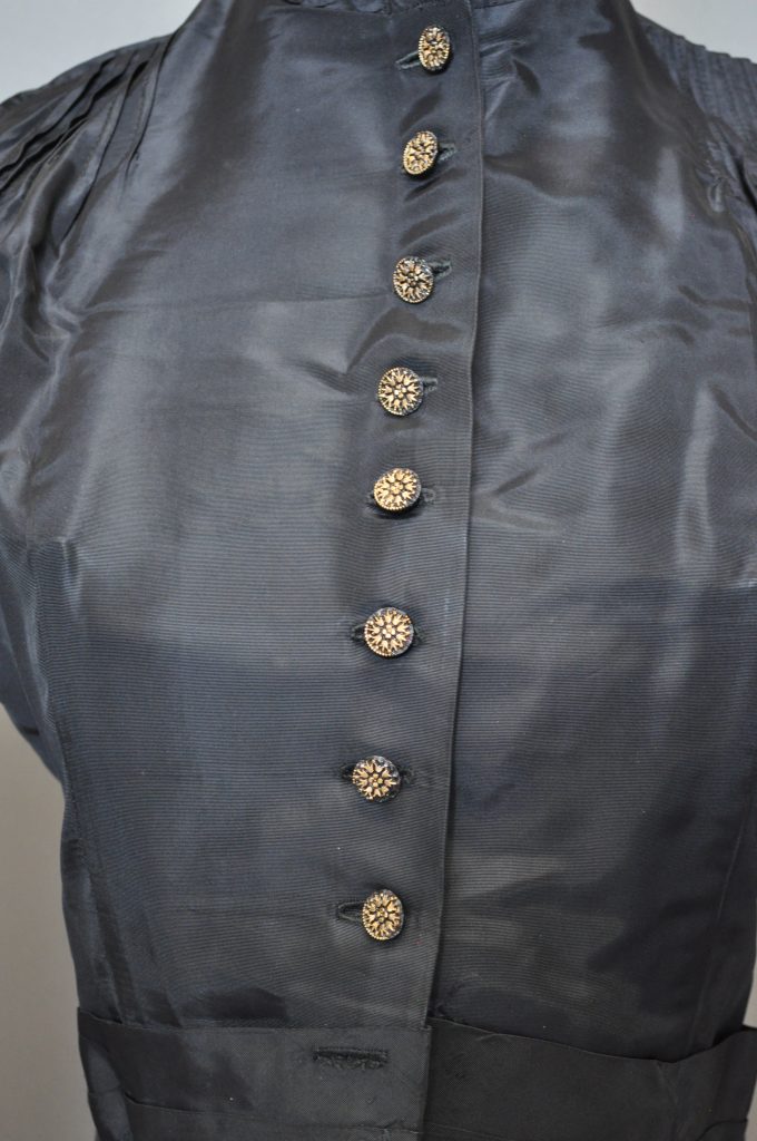 silk faille black bodice with vertical tucks at shoulders, high collar, CF button closure with decorative buttons. Internal stays.