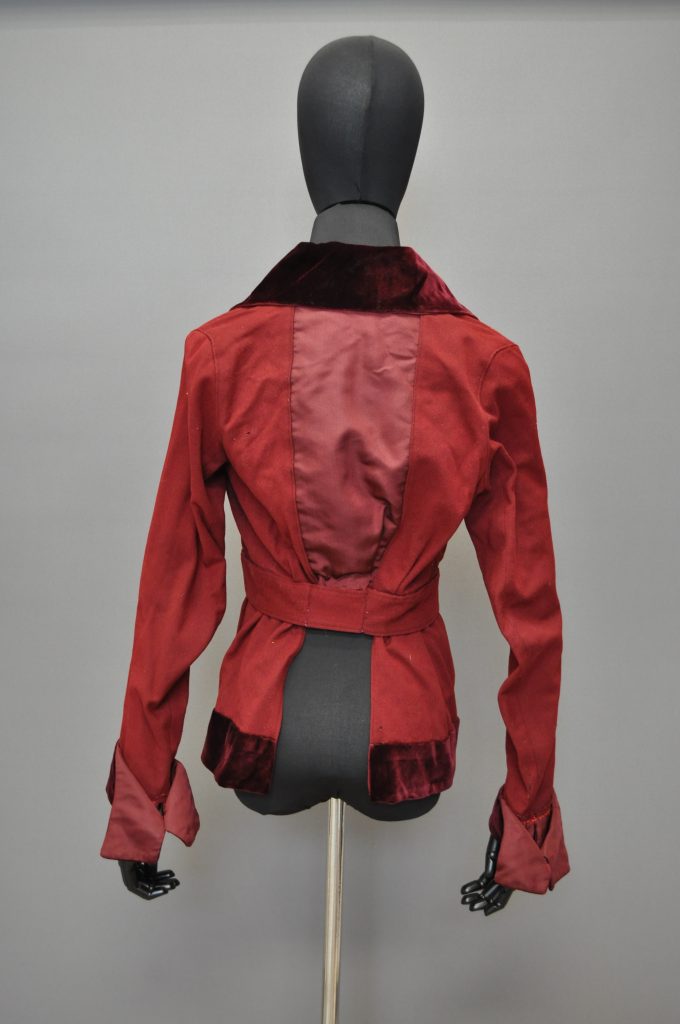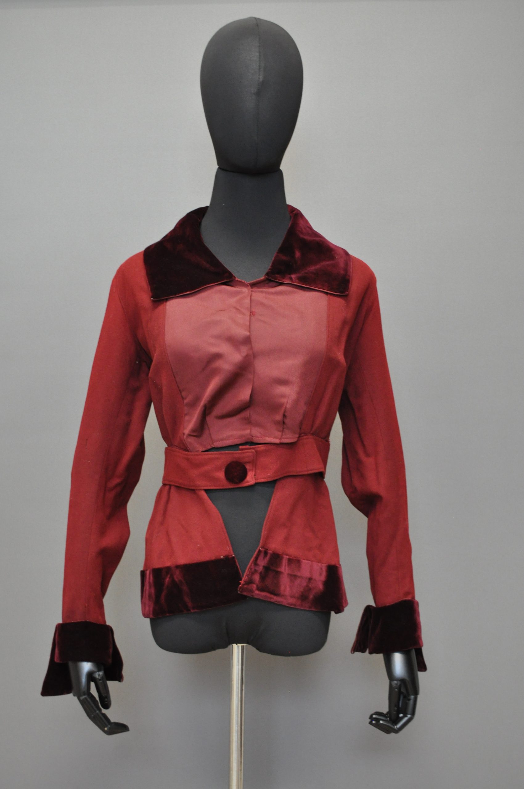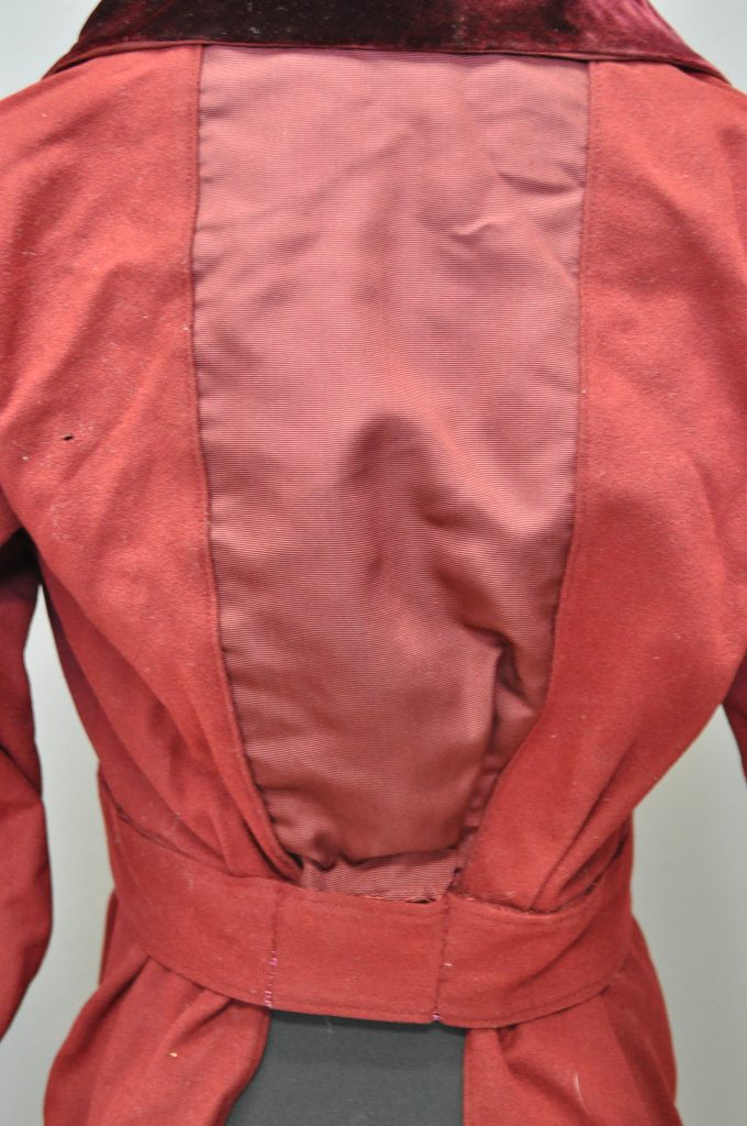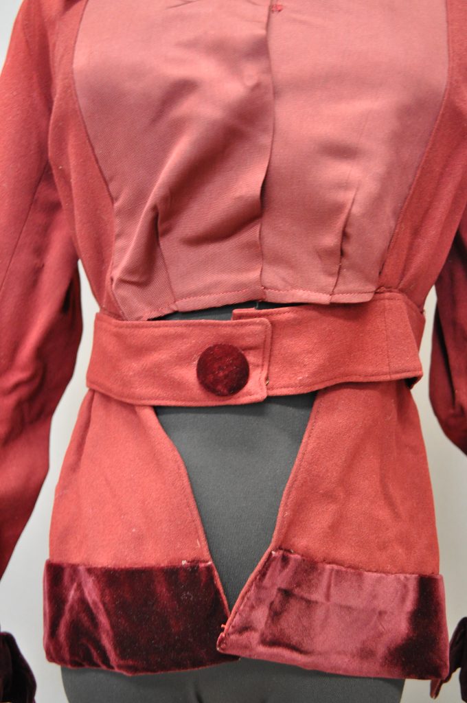 (set with # 2023181) Maroon bodice/ jacket (1915-1920). Velvet cuffs and collar. Built-in belt. CF snap opening