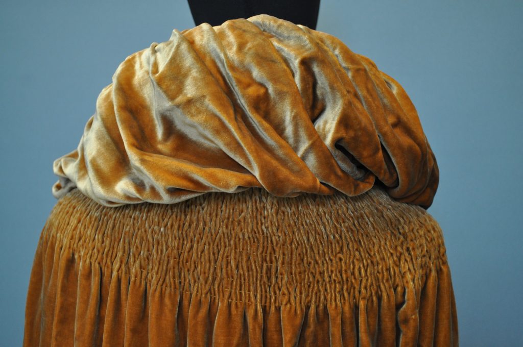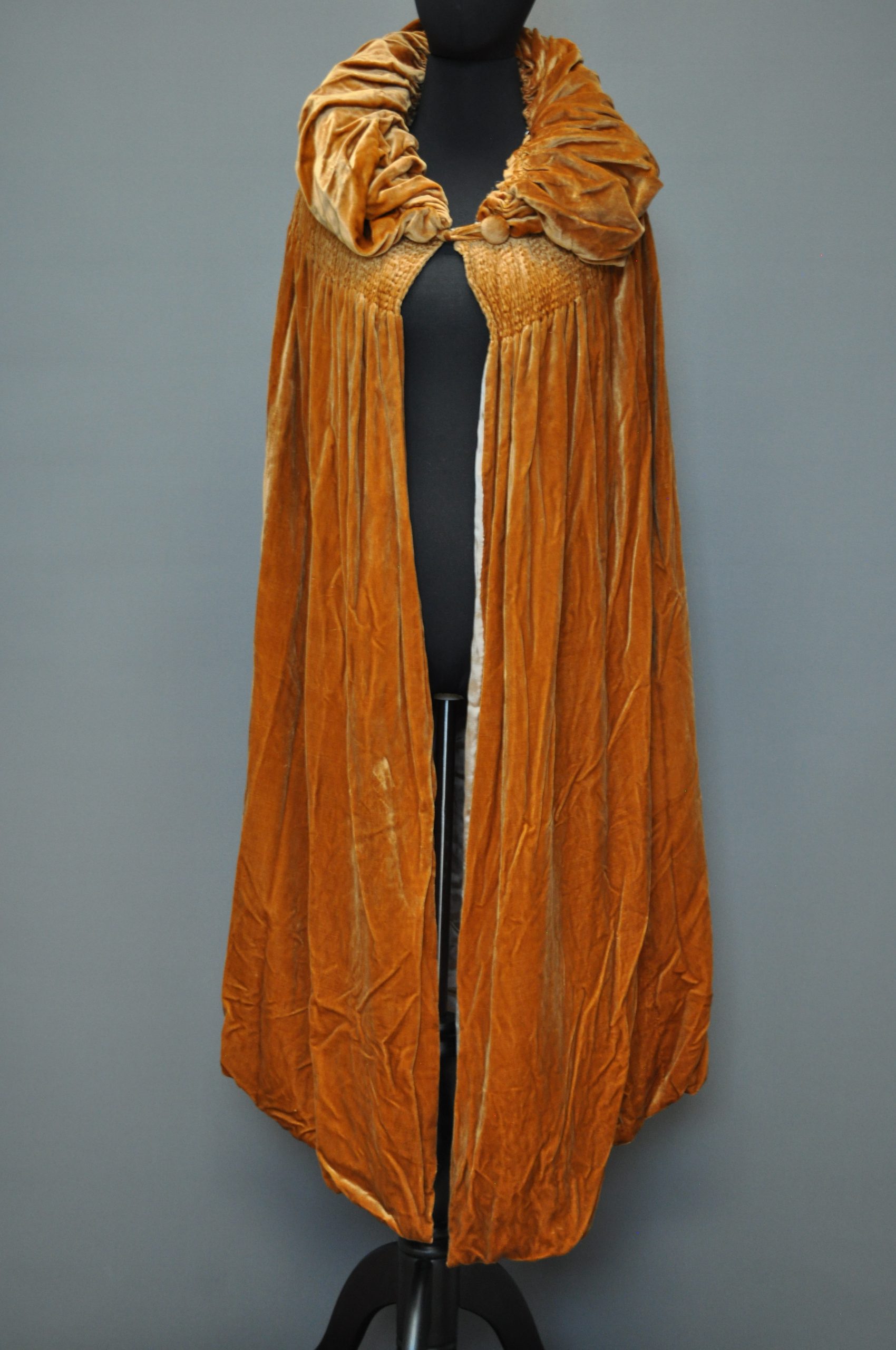 Orange velvet cape with tan lining. rushed at top with padded collar.