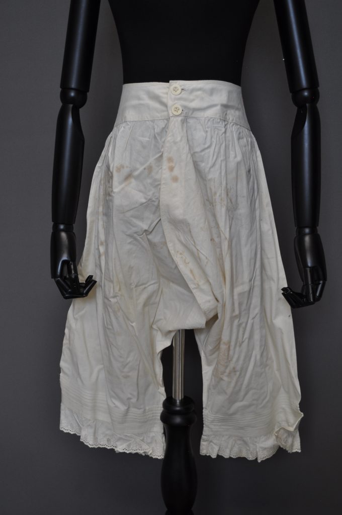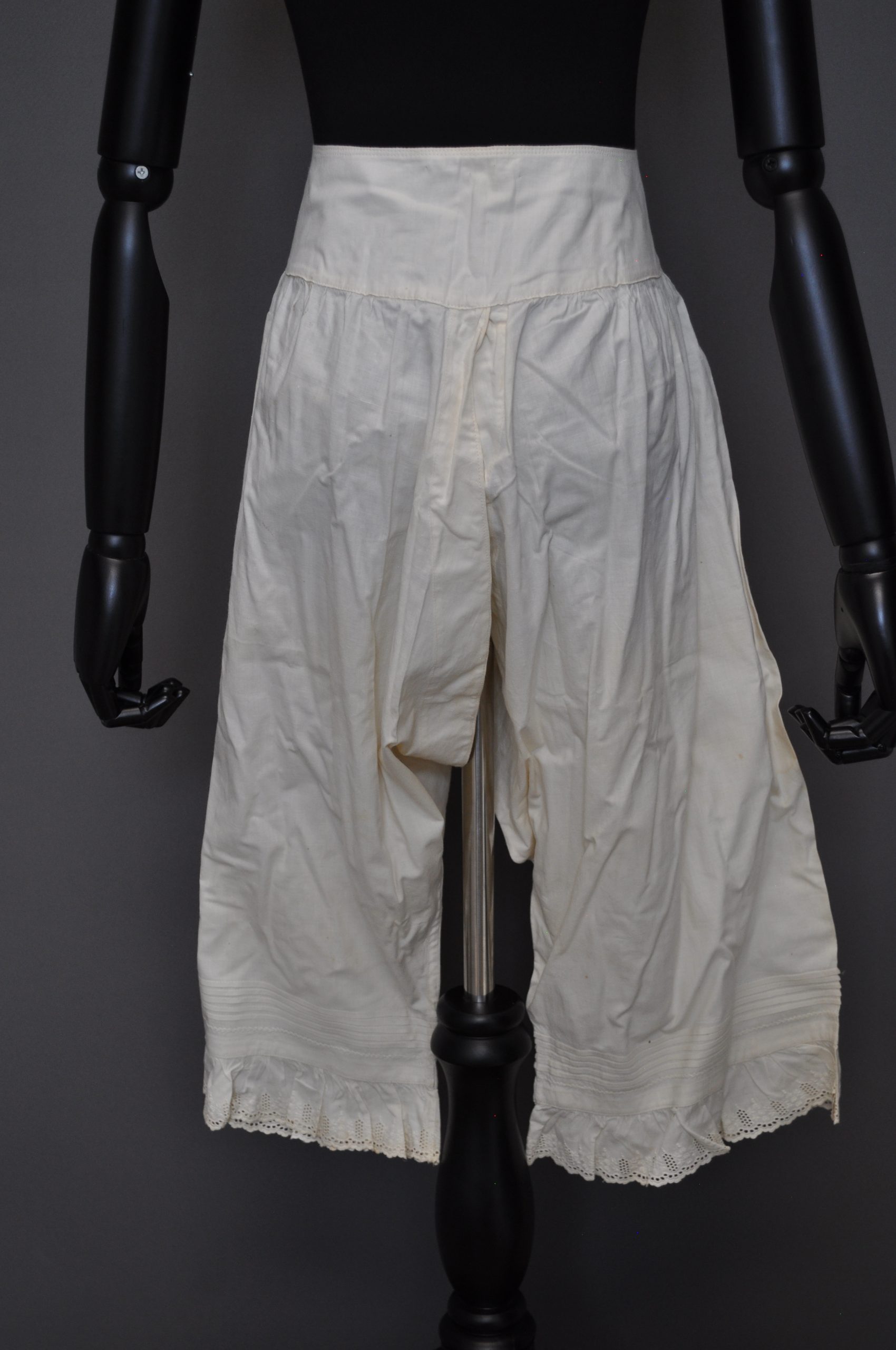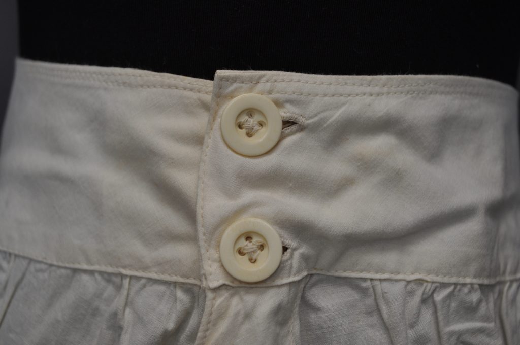 Split bloomers with button closure. horizontal tucks and lace at hem.