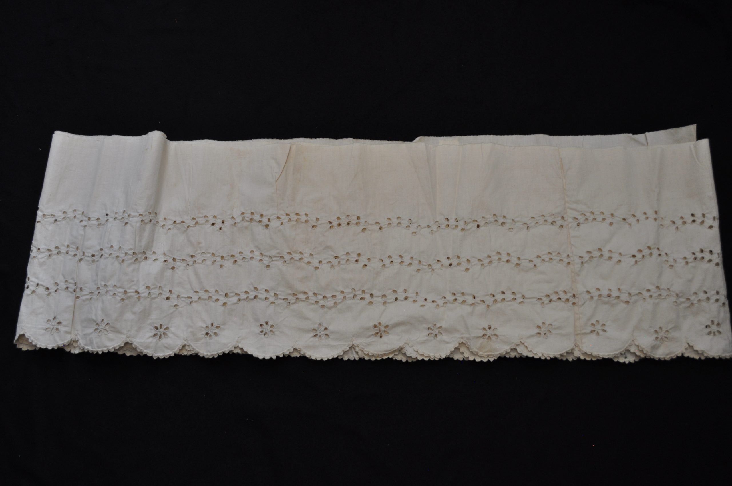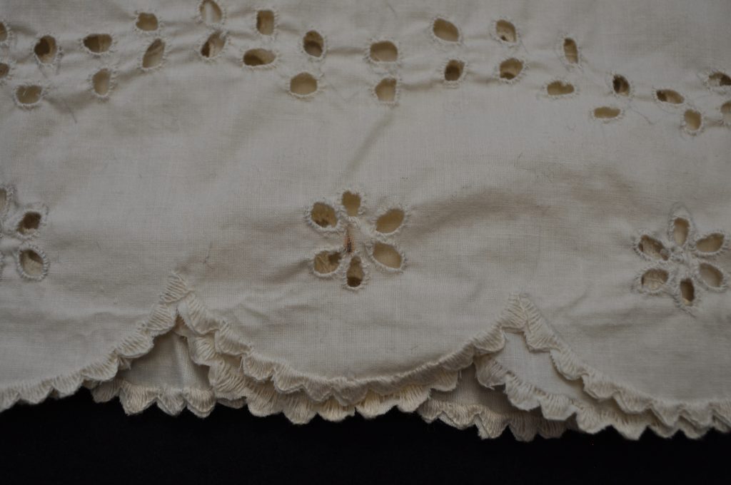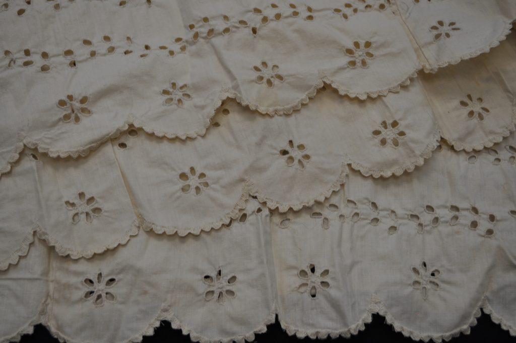 Detached bottom petticoat ruffle. Scalloped hem with eyelette embroidery.