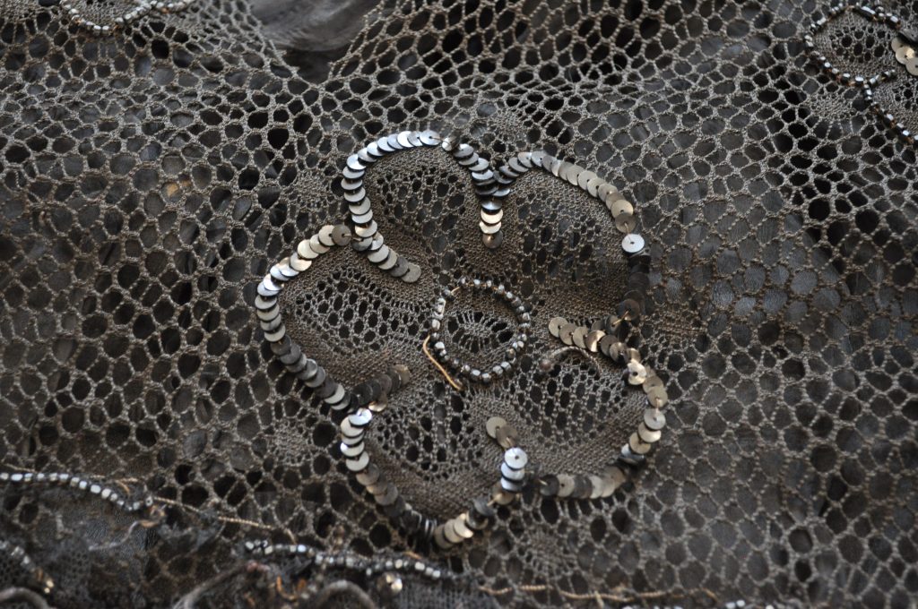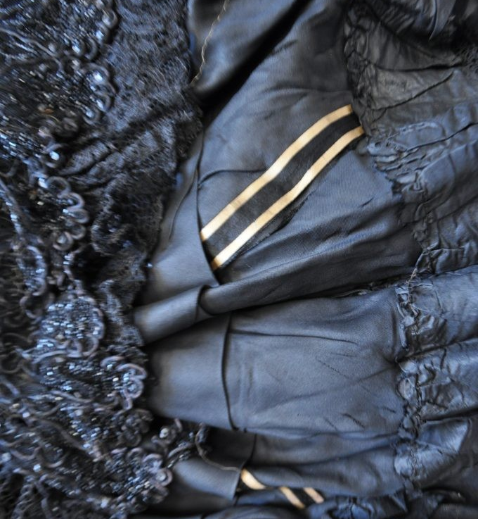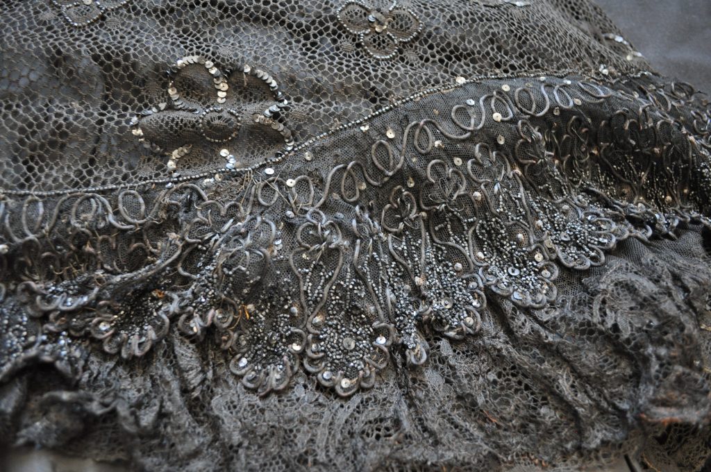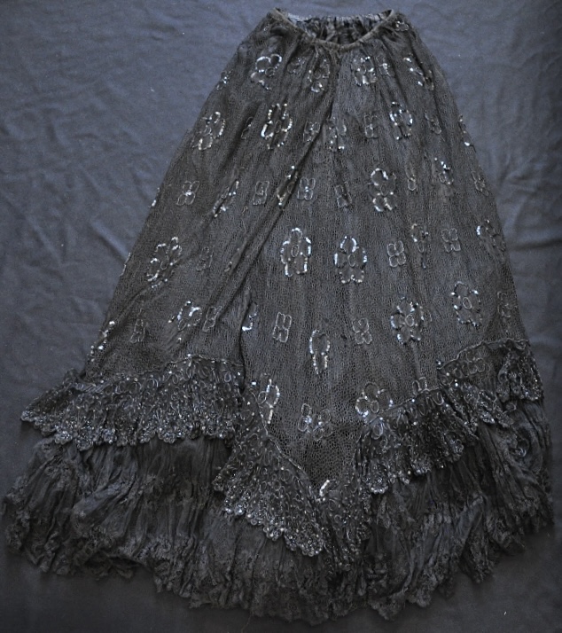 (1895-1905) Black lace skirt with embroidery and beading. CB hook opening. (shot) Silk lining. Train. (damaged)